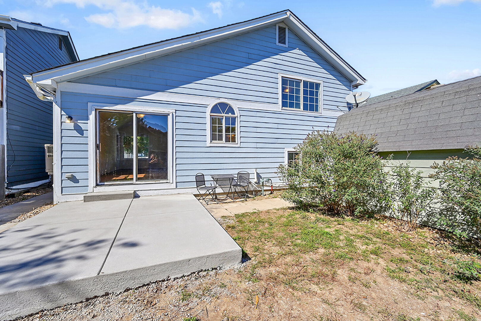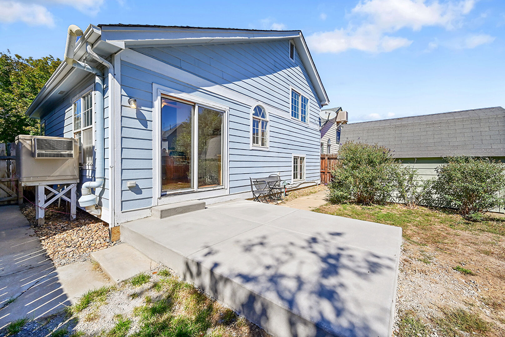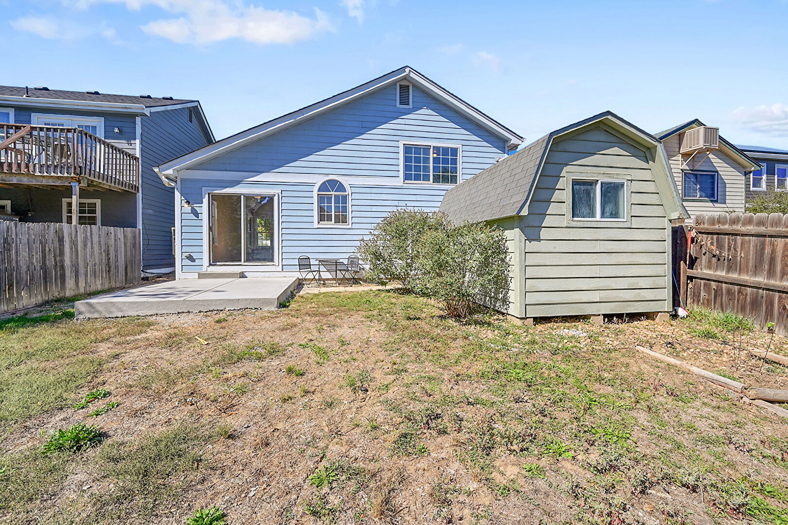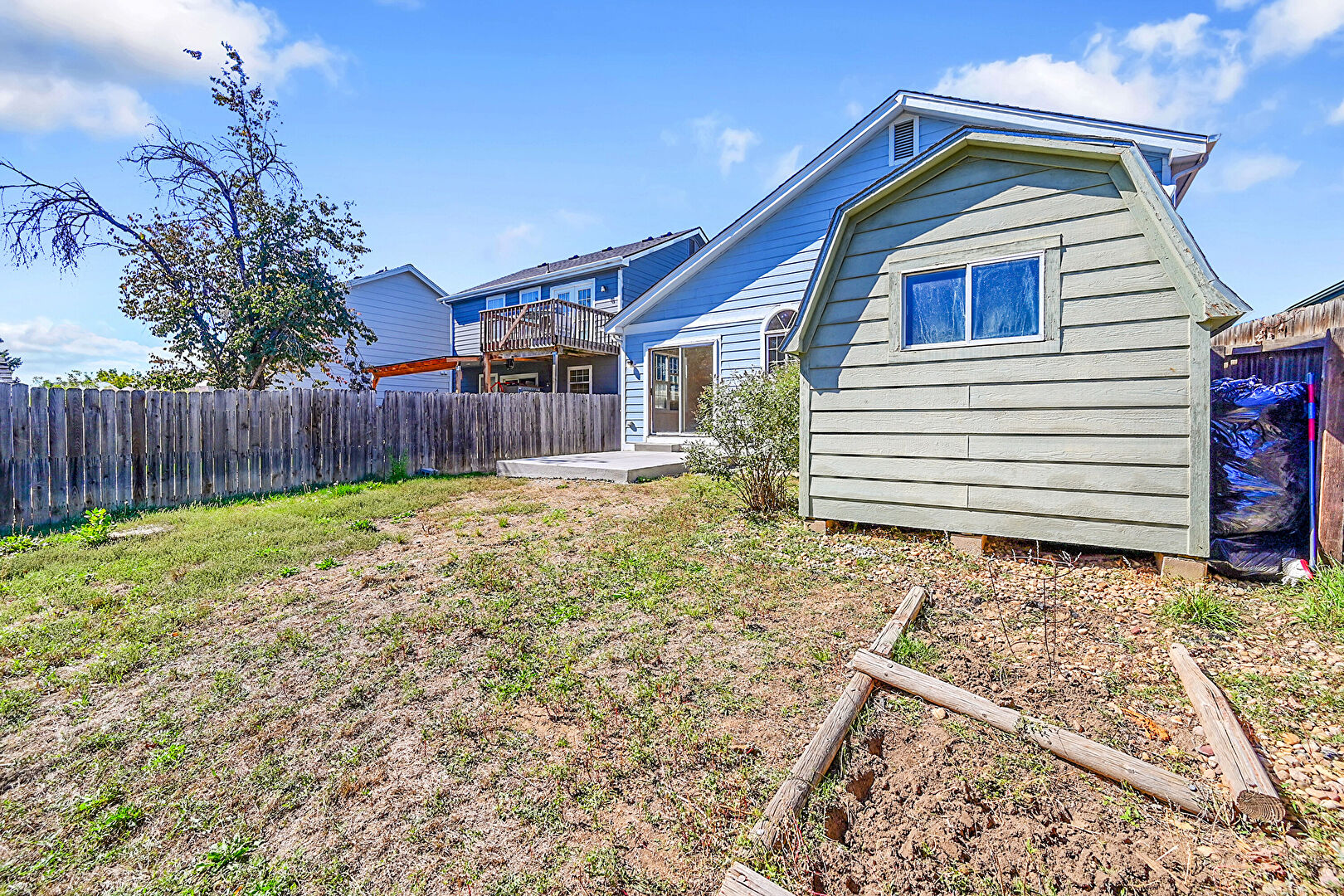 Concrete Foundation, Deck, Downspout, Fence, Foundation Piers, Gambrel Roof, Gutters, Horizontal Siding, Lawn, Outdoor Structure, Patio, Outdoor Structure, Patio, Satellite Dish, Shed