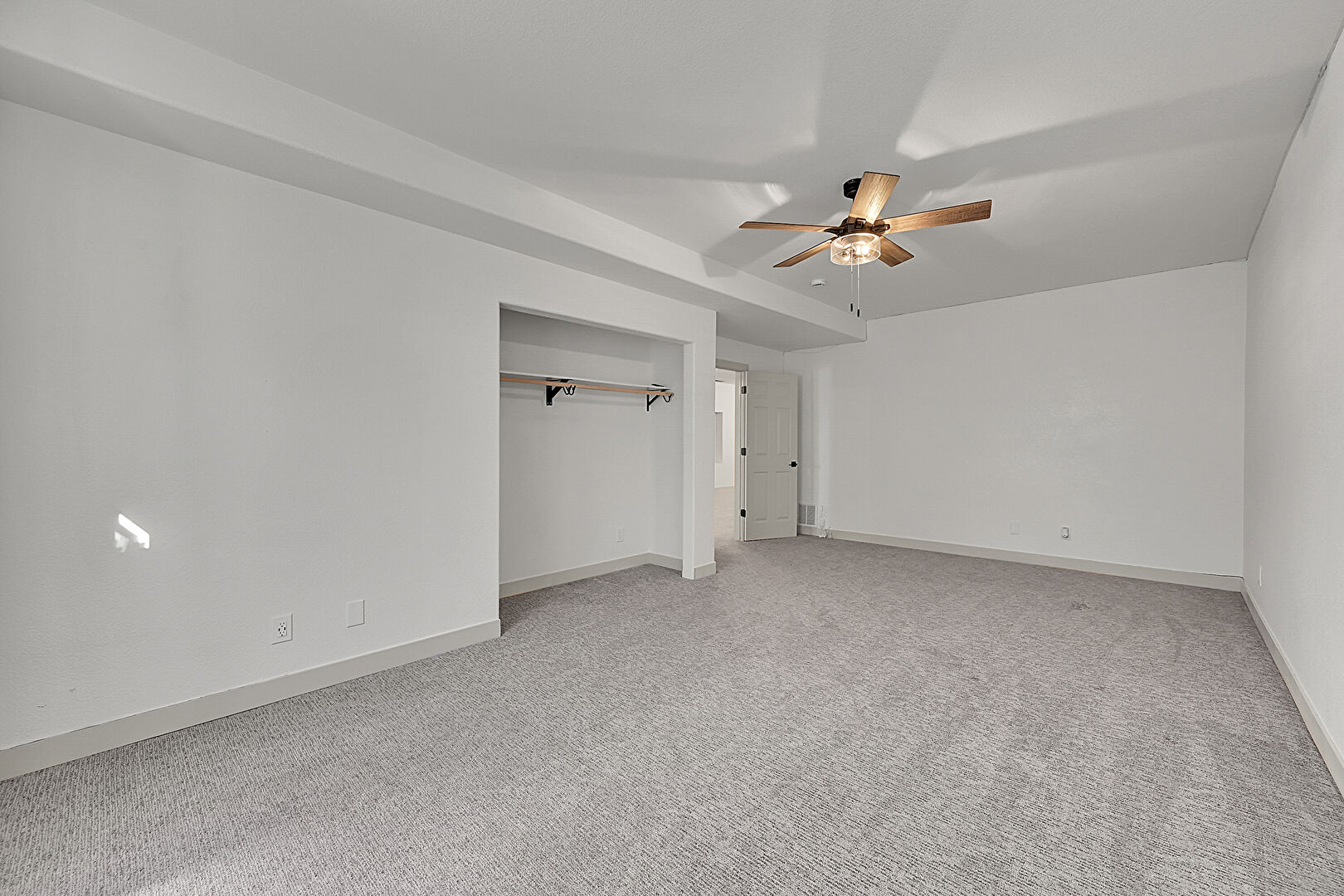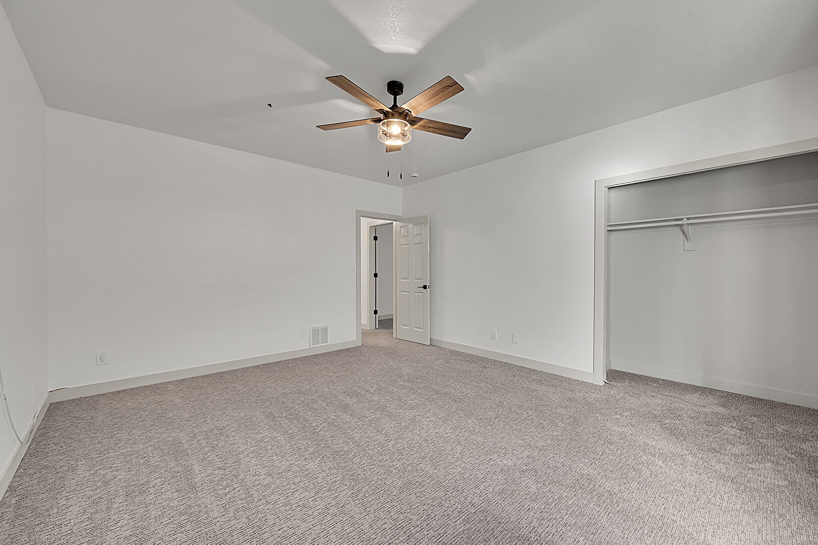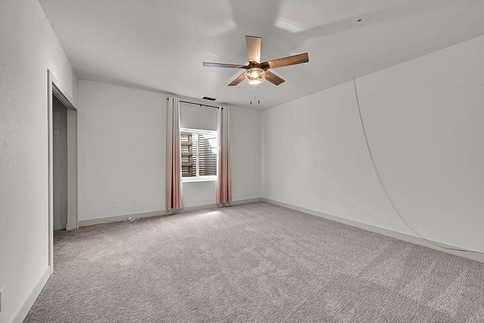 Accent Wall, Baseboards Wall, Carpet, Ceiling Fan, Closet, Drywall, Natural Light, Textured Ceiling, Vent, Wainscot Wall, Wallpaper Wall, Baseboards Wall, Carpet, Ceiling Fan, Natural Light, Vent