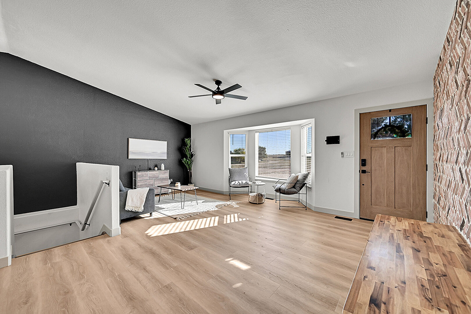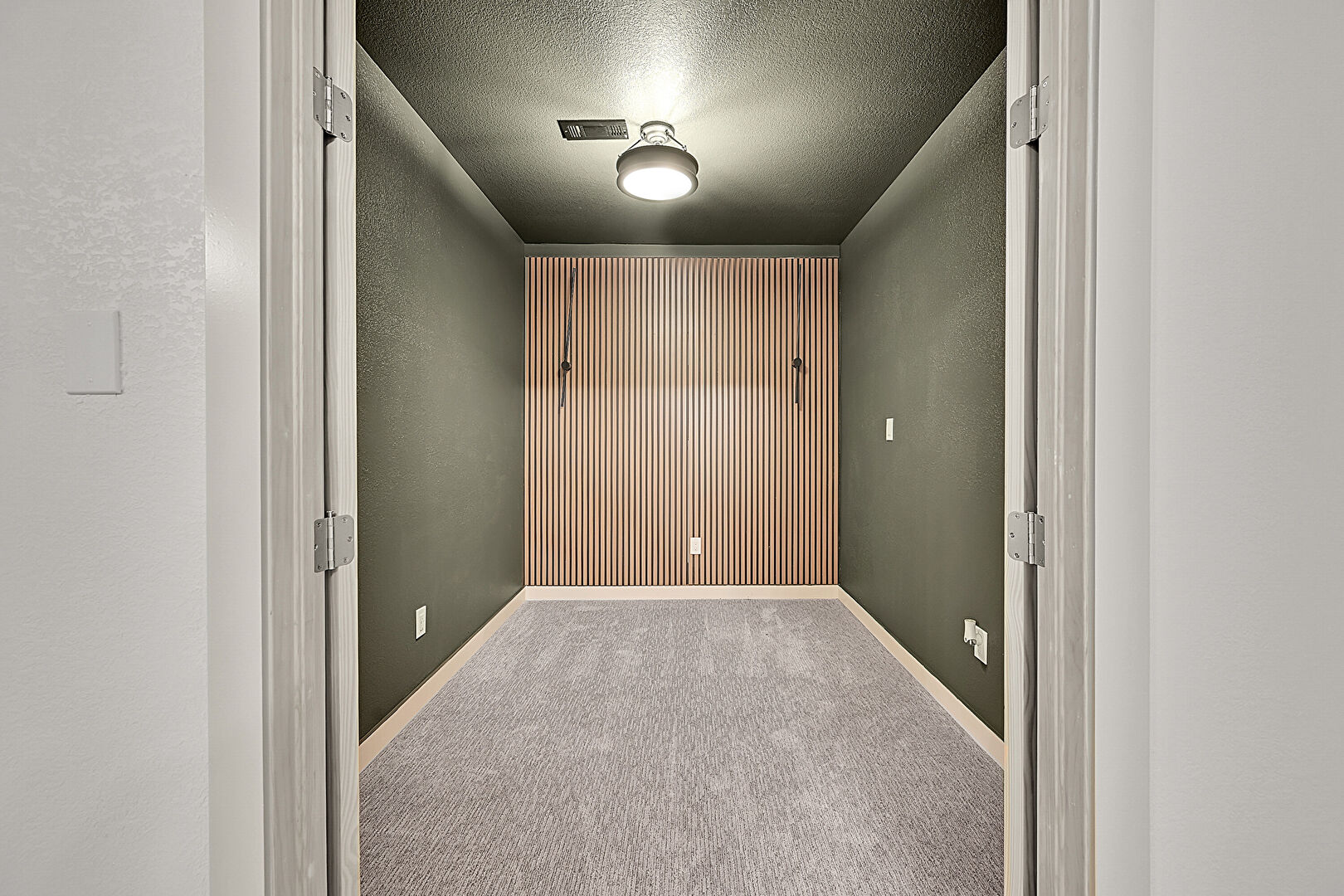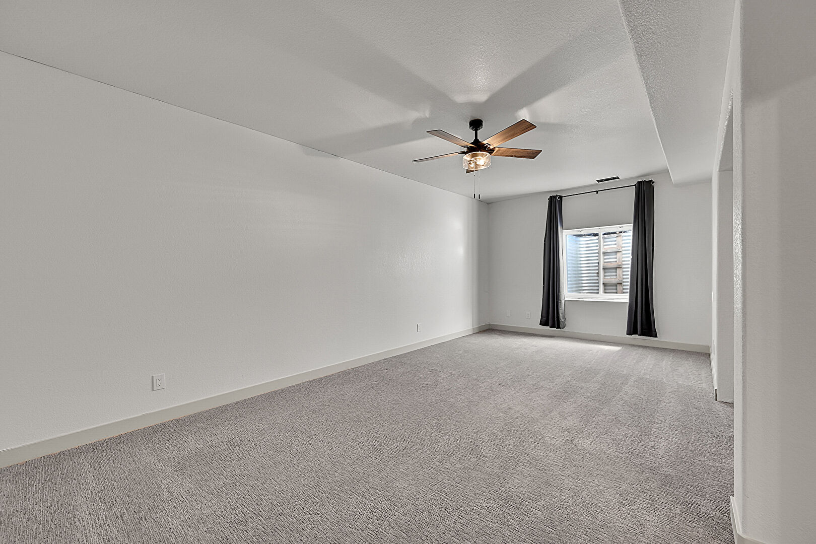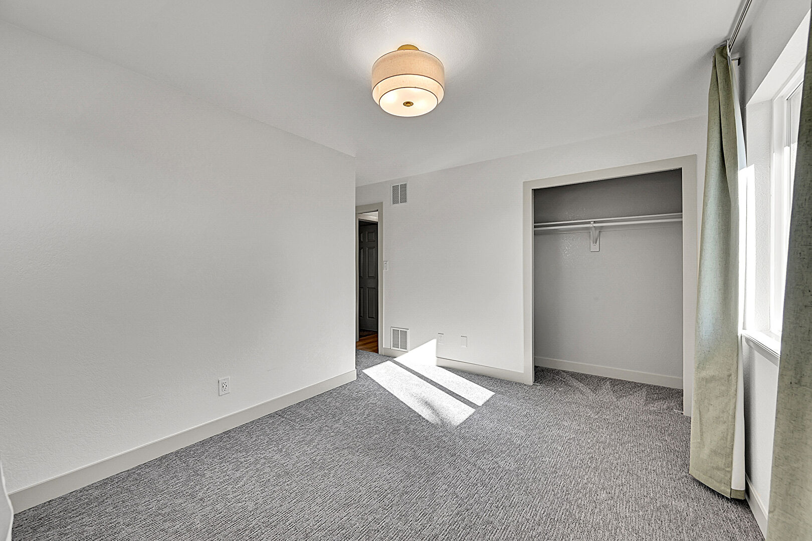 Accent Wall, Baseboards Wall, Carpet, Ceiling Fan, Closet, Drywall, Natural Light, Textured Ceiling, Vent, Wainscot Wall, Wallpaper Wall, Baseboards Wall, Carpet, Ceiling Fan, Natural Light, Vent