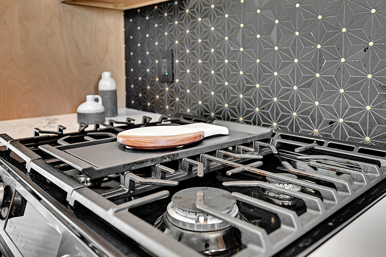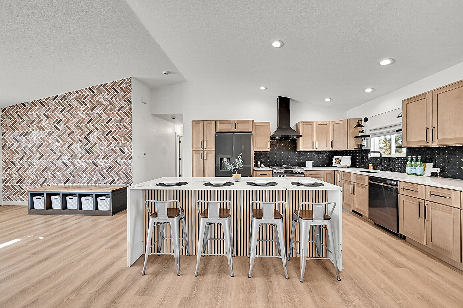 Baseboards Wall, Black Cabinets, Butcher Block Countertops, Cathedral Ceiling, Ceiling Fan, Drywall, Kitchen Bar, Kitchen Island, L Shaped Kitchen, Natural Light, Notable Chandelier, Open Shelves, Opens To Living Area, Pendant Lighting, Recessed Lighting, Shaker Cabinets, Smoke Carbon Monoxide Detector, Stone Countertops, Textured Ceiling, Vaulted Ceiling, Vent, Wood Finish Floor, Black Cabinets, Kitchen Bar, Shaker Cabinets, Vent, Wood Finish Floor
