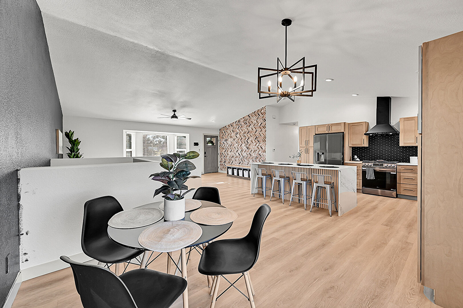 Baseboards Wall, Ceiling Fan, Drywall, L Shaped Kitchen, Notable Chandelier, Recessed Lighting, Textured Ceiling, Textured Wall, Vaulted Ceiling, Vent, Wood Finish Floor, Natural Light