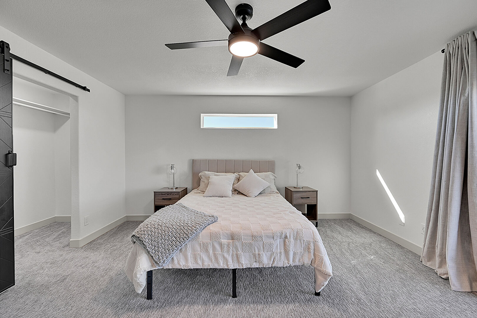 Access To Exterior, Barn Door, Baseboards Wall, Carpet, Ceiling Fan, Closet, Drywall, Ensuite Bathroom, Natural Light, Textured Ceiling, Vent, Carpet, Textured Ceiling, Vent