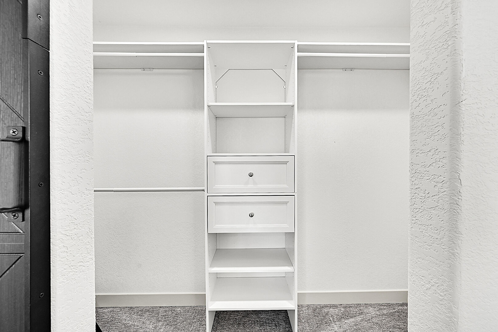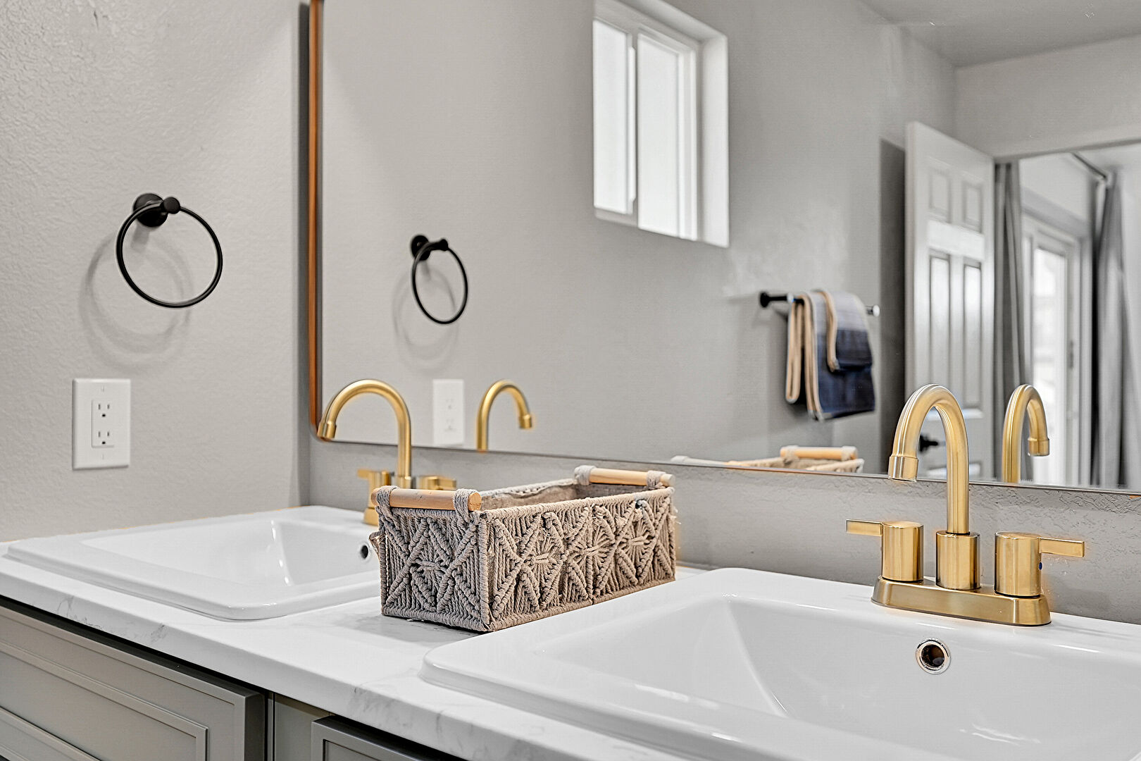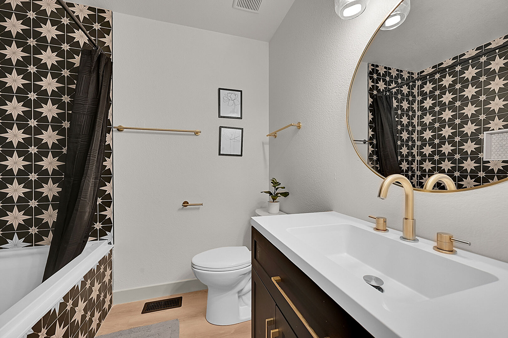 Baseboards Wall, Closet, Combined Bath Shower, Double Vanity, Drywall, Full Bathroom, Textured Wall, Vanity, Vent, Vinyl Floor, Wood Finish Floor, Double Vanity, Natural Light, Vent