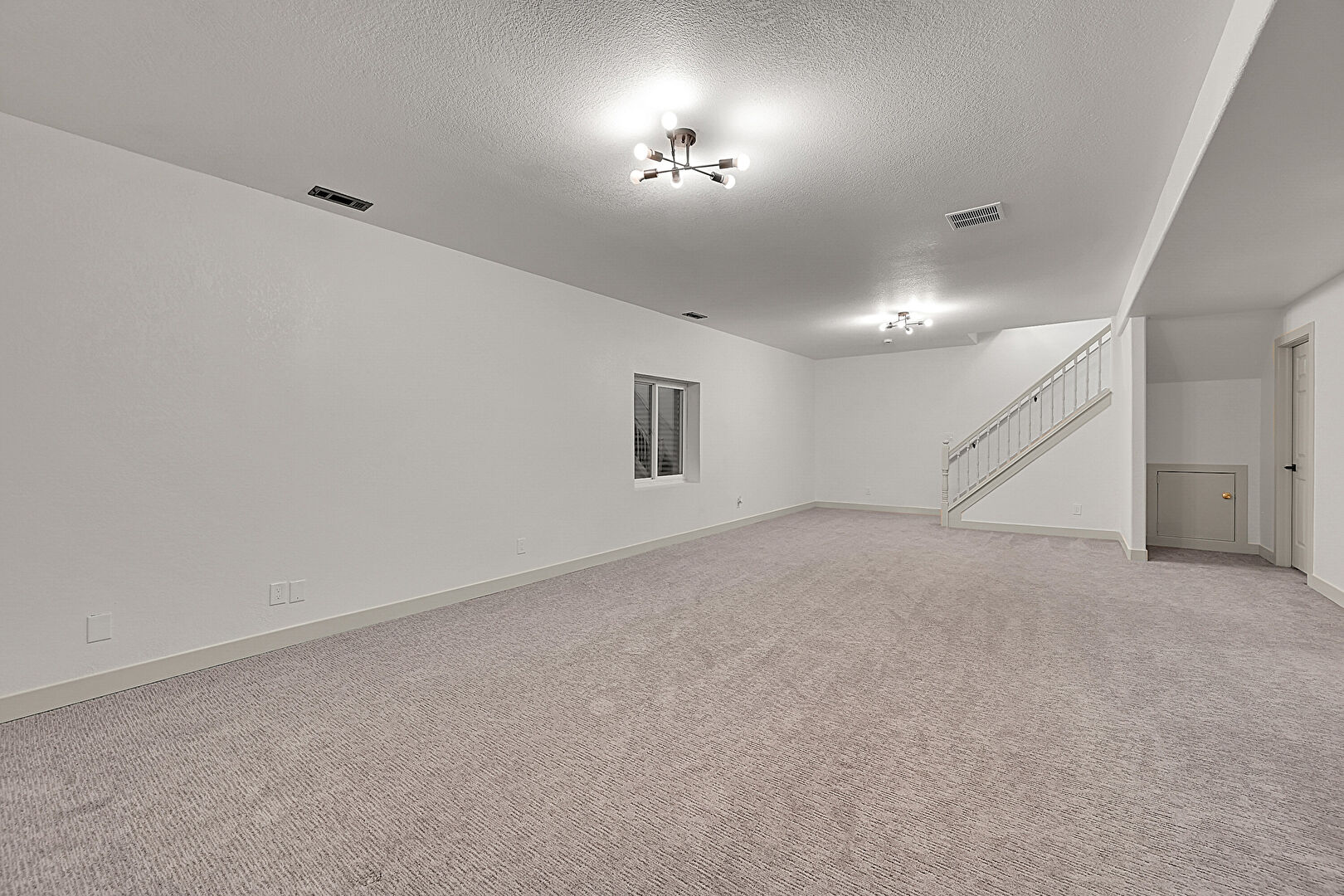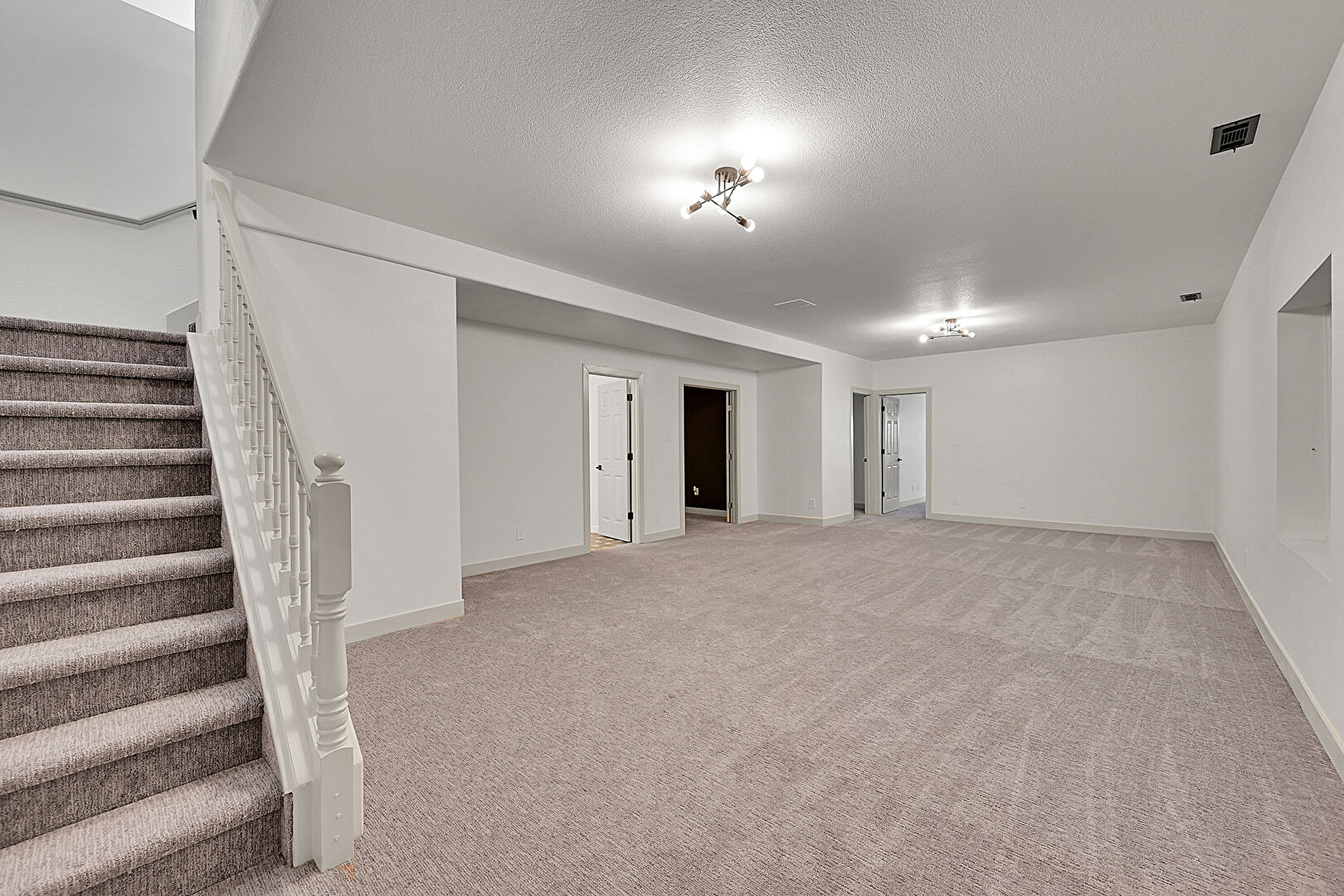 Baseboards Wall, Carpet, Drywall, Stairs, Textured Ceiling, Vent, Basement, Textured Ceiling, Vent