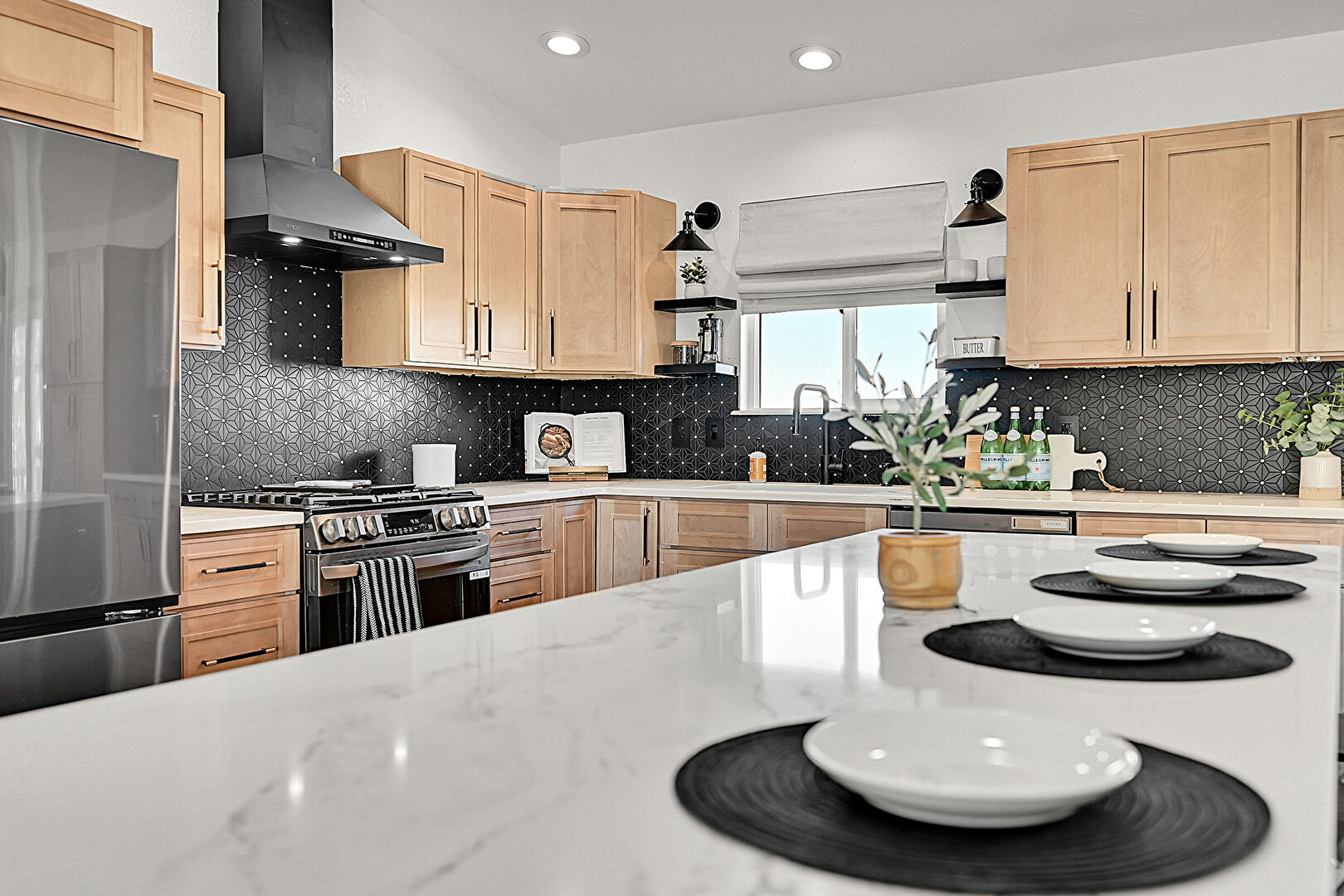 L Shaped Kitchen, Natural Light, Notable Chandelier, Recessed Lighting, Textured Ceiling, Textured Wall, Vaulted Ceiling, Vent, Wood Finish Floor, Baseboards Wall, Ceiling Fan