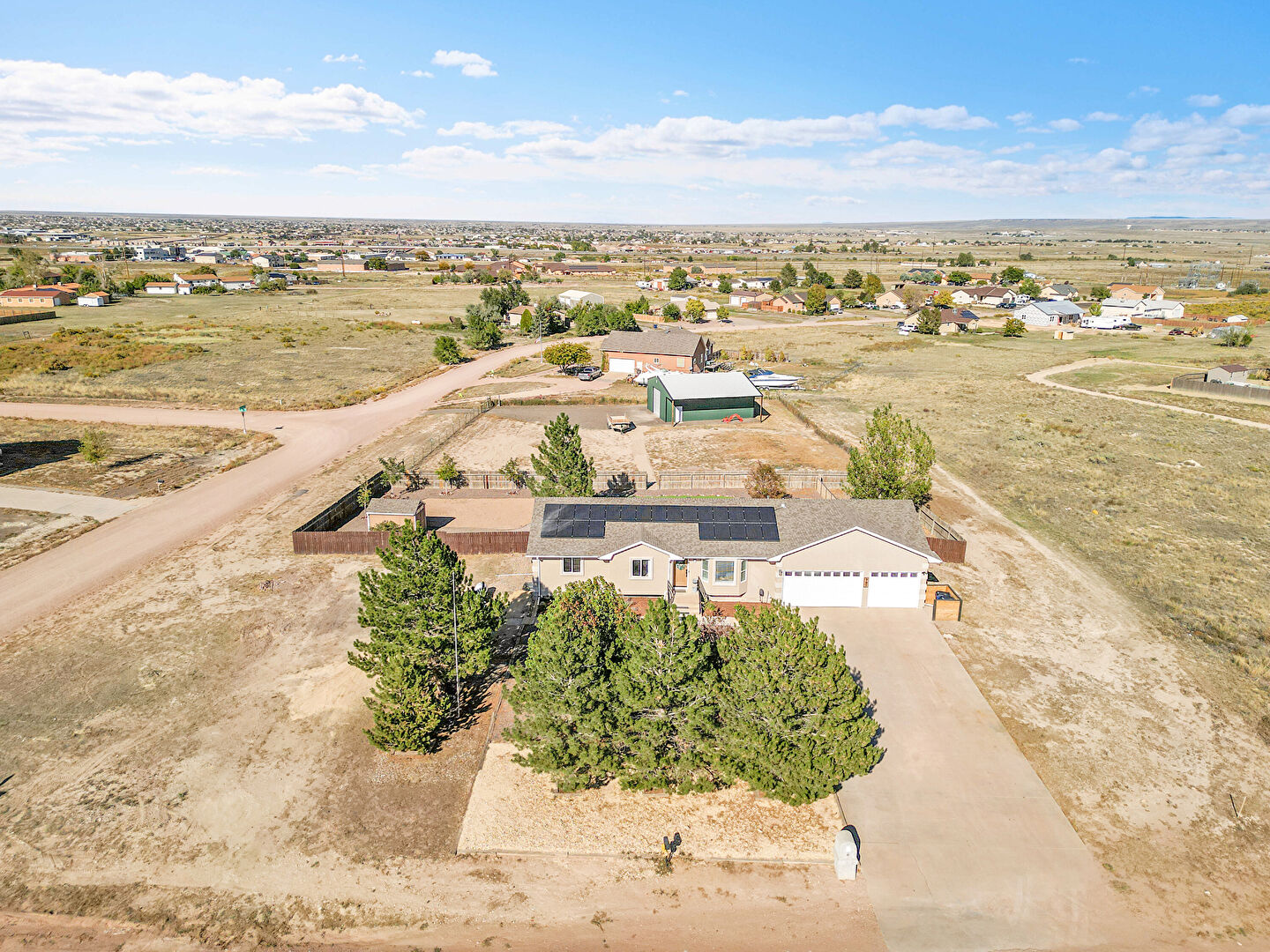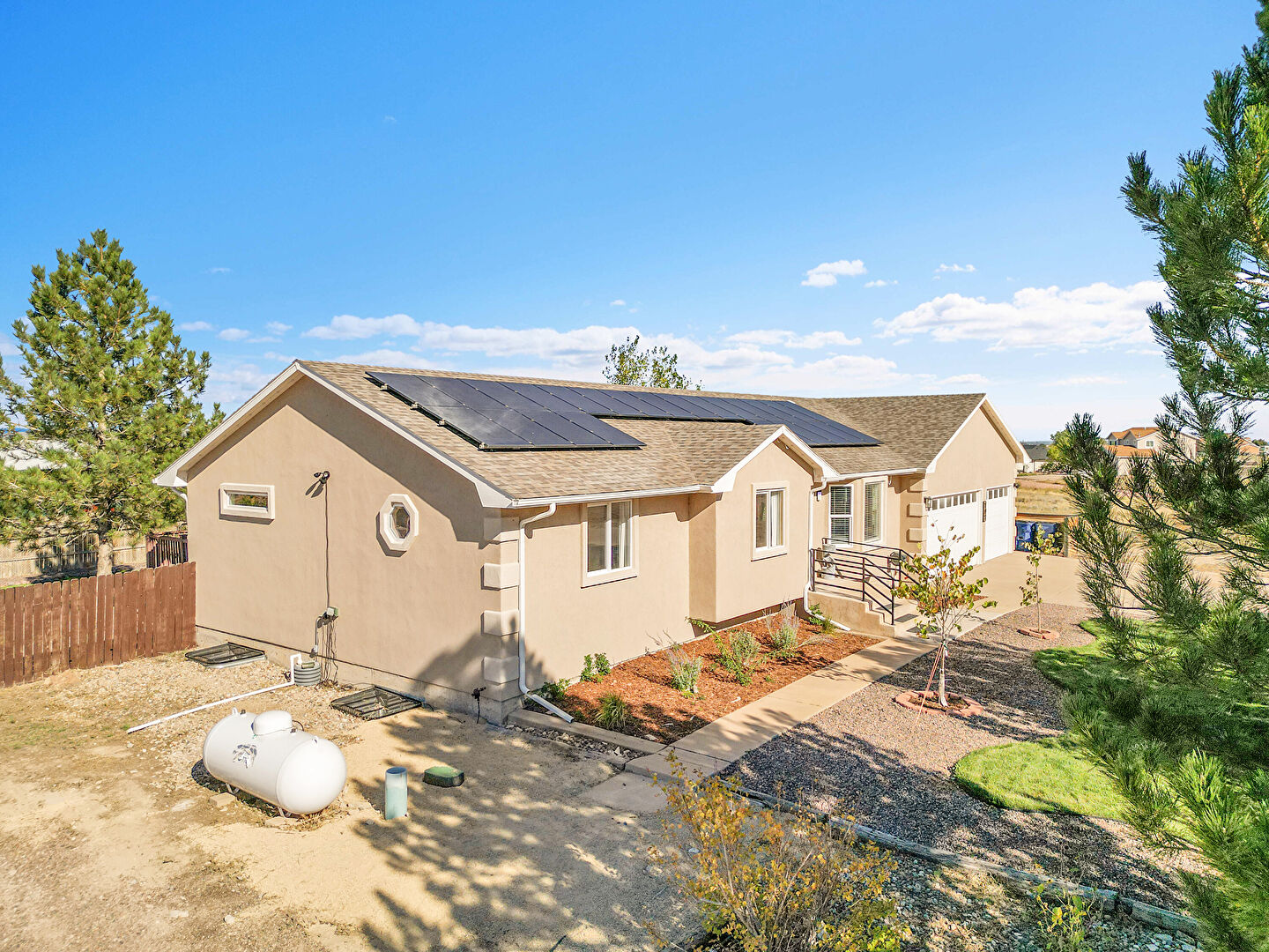 Concrete Foundation, Downspout, Driveway, Fence, Gutters, Lawn, Shingle Roof, Solar Panels, Stoop, Stucco Siding, Lawn, Stucco Siding