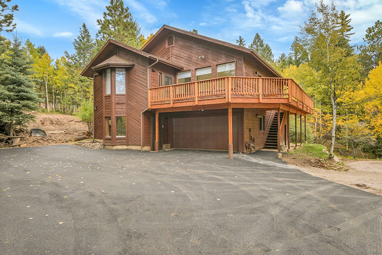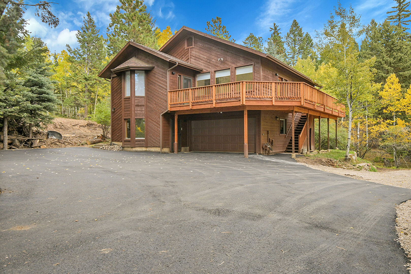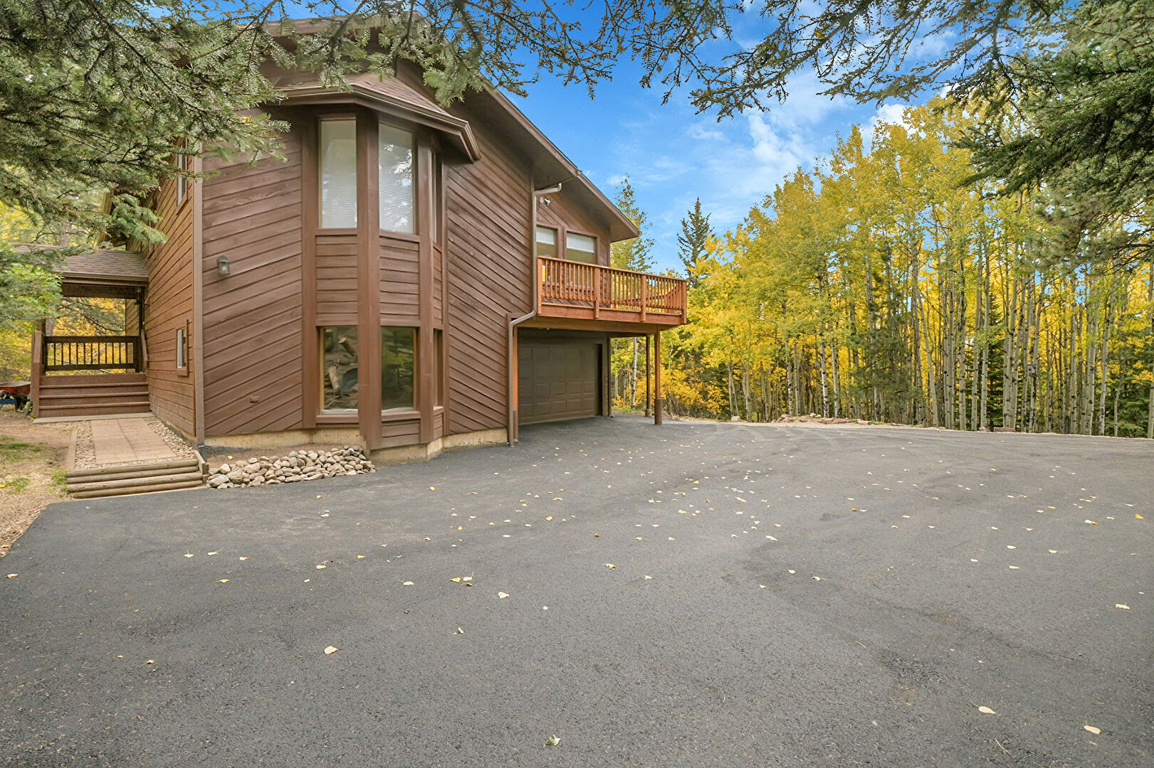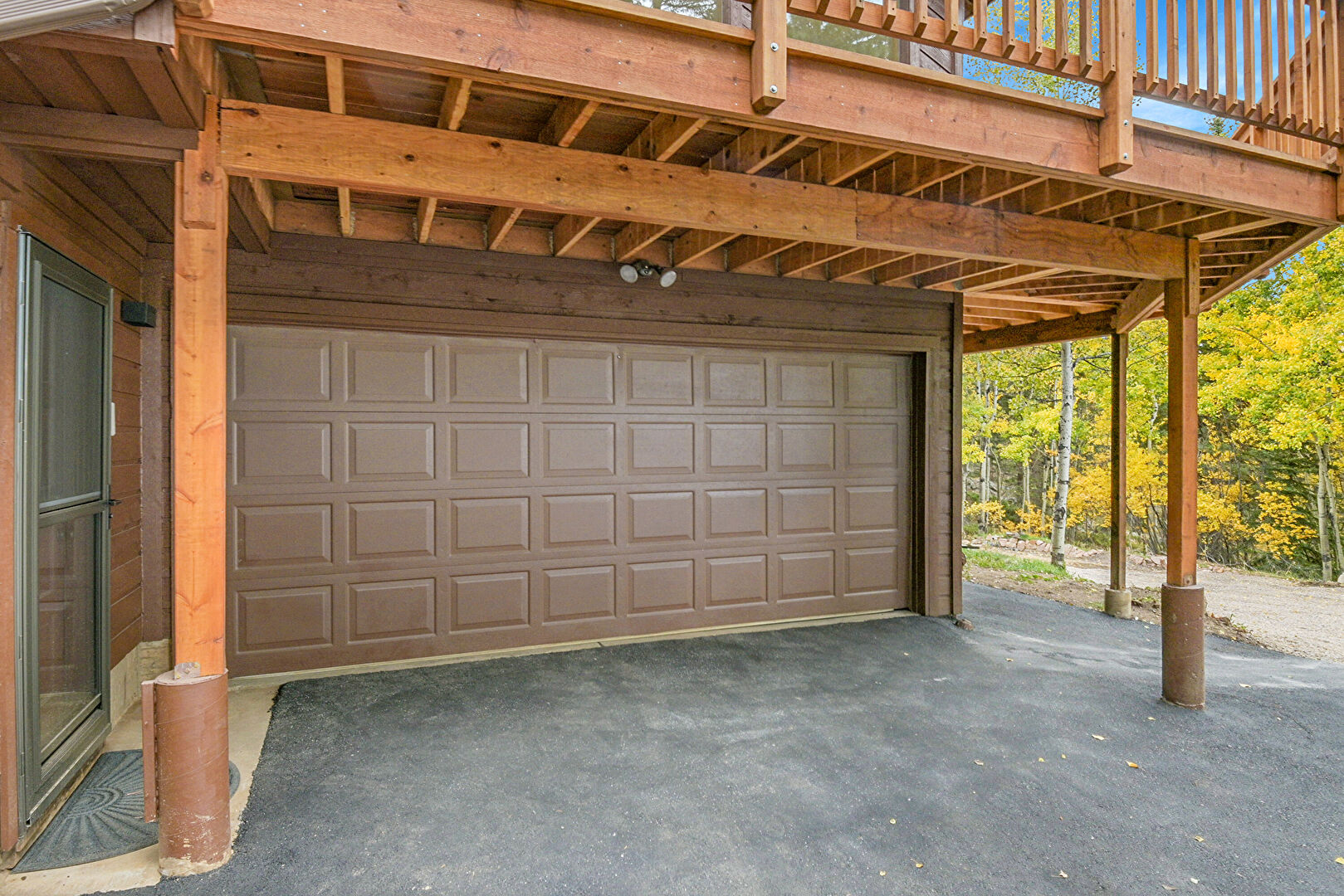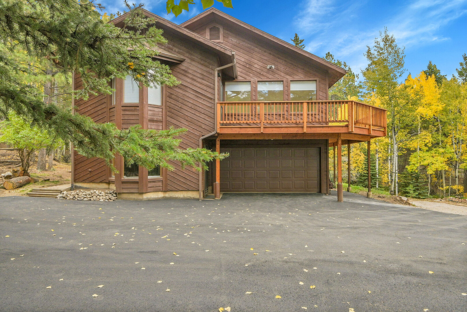 Basement Garage, Basement Walk Out, Built In Garage, Concrete Foundation, Deck, Downspout, Driveway, Forest View, Gutters, Horizontal Siding, Shingle Roof, Stairs, Wood Siding, Basement Garage, Built In Garage, Driveway, Gutters, Parking Pad, Stairs, Wood Siding