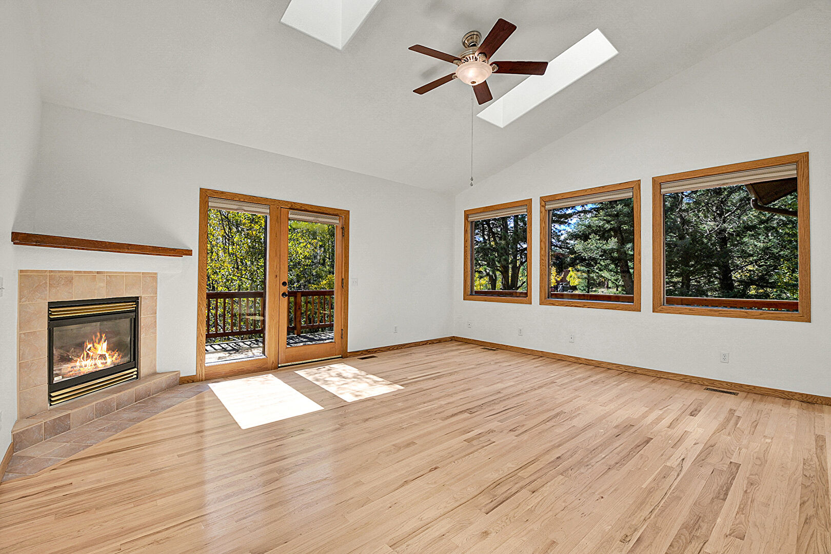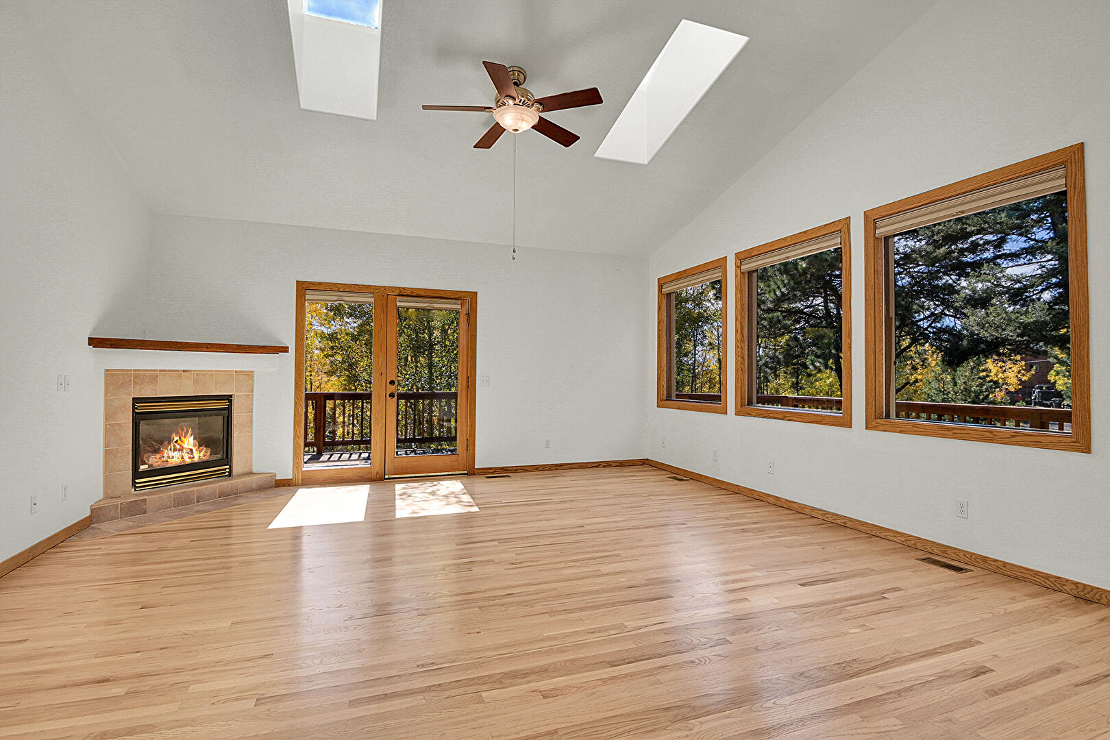 Baseboards Wall, Ceiling Fan, Drywall, Fireplace, French Doors, High Ceiling, Natural Light, Skylight, Vaulted Ceiling, Vent, Wood Finish Floor, Ceiling Fan, Drywall, Natural Light, Vaulted Ceiling