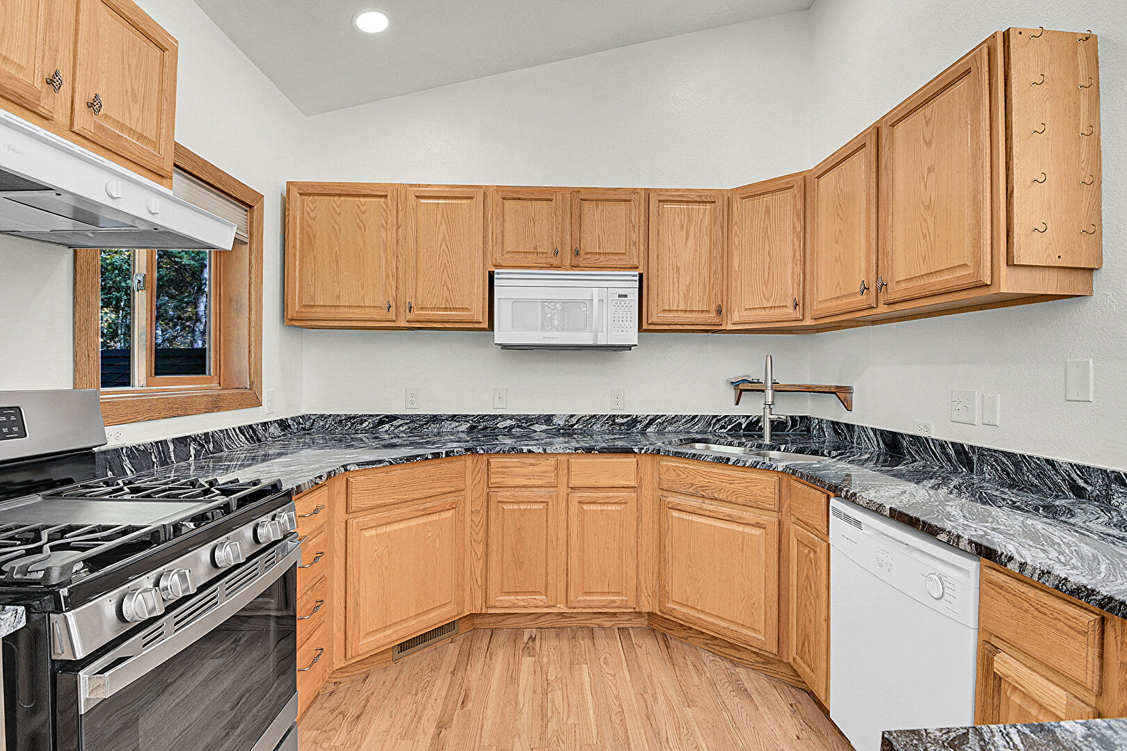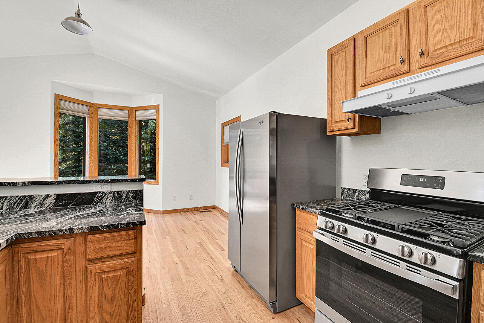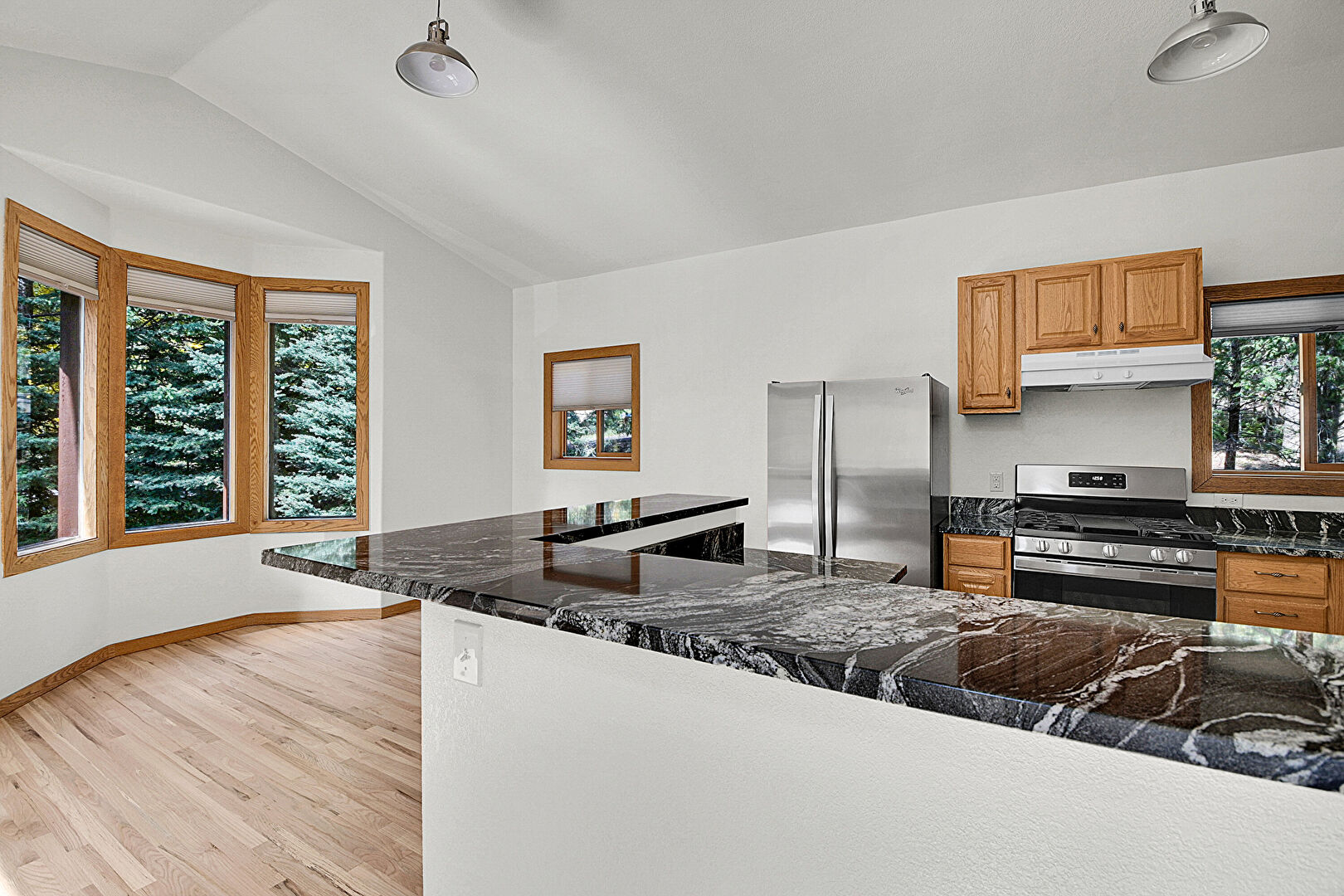 Baseboards Wall, Drywall, G Shaped Kitchen, High Ceiling, Kitchen Bar, Kitchen Peninsula, Medium Brown Cabinets, Natural Light, Pendant Lighting, Raised Cabinets, Recessed Lighting, Stone Countertops, Vaulted Ceiling, Vent, Wood Finish Floor, Baseboards Wall, Natural Light, Recessed Lighting