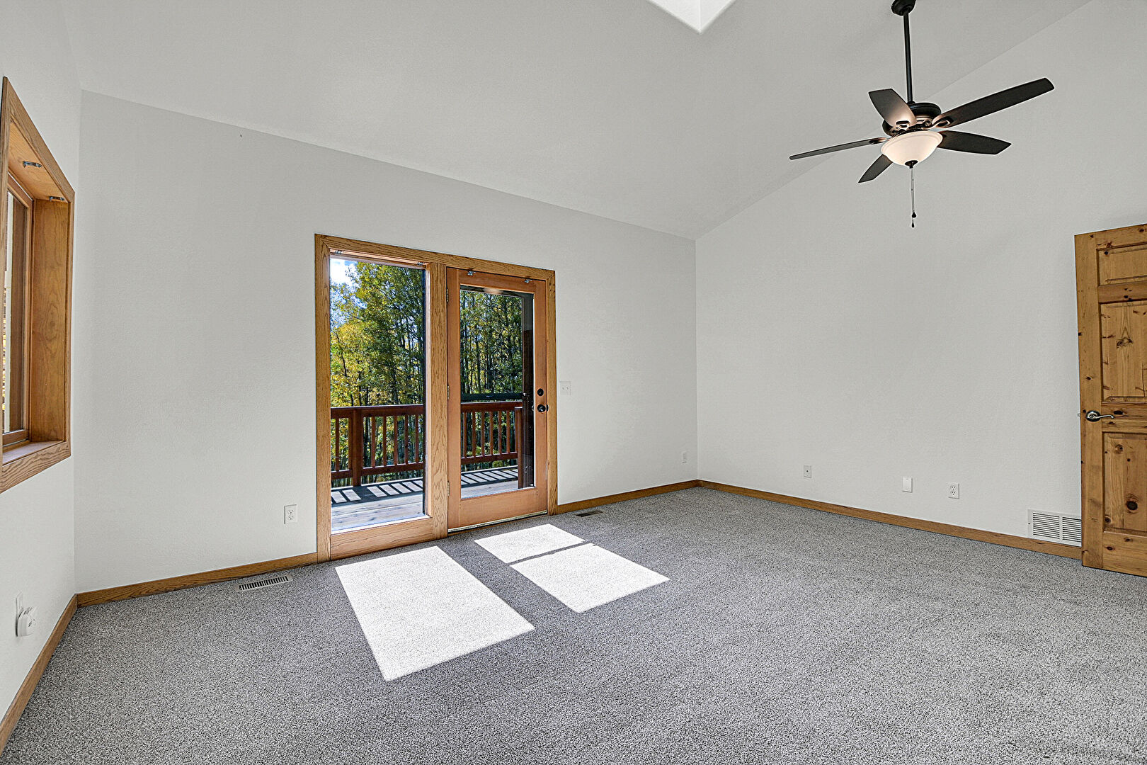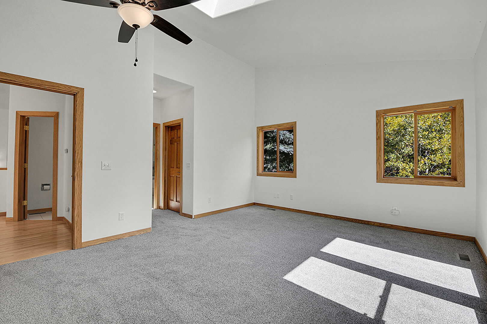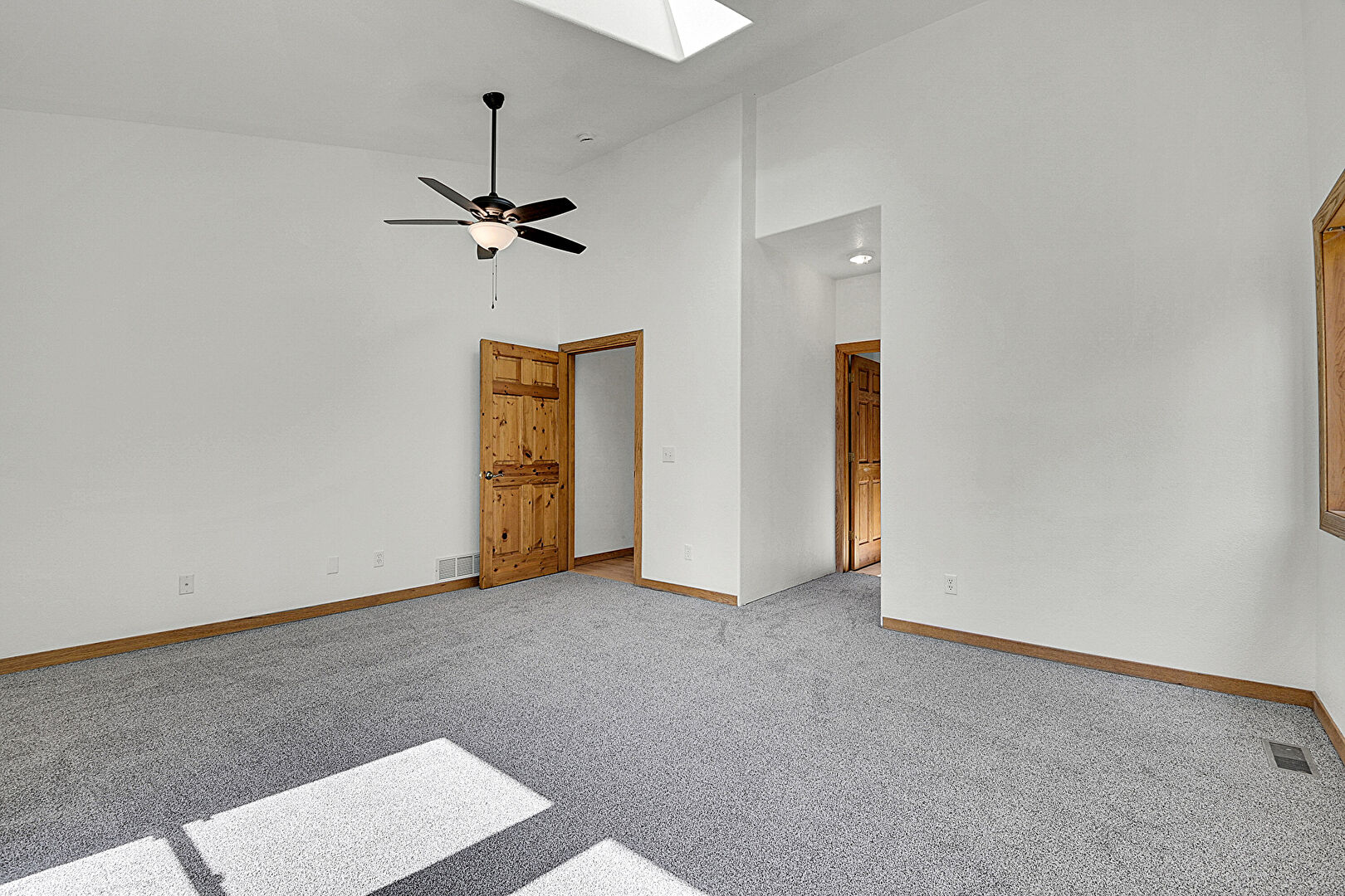 Baseboards Wall, Carpet, Ceiling Fan, Closet, Drywall, High Ceiling, Natural Light, Skylight, Textured Ceiling, Vaulted Ceiling, Vent, Wainscot Wall, Wood Wall, Carpet, Ceiling Fan, High Ceiling, Natural Light, Vaulted Ceiling