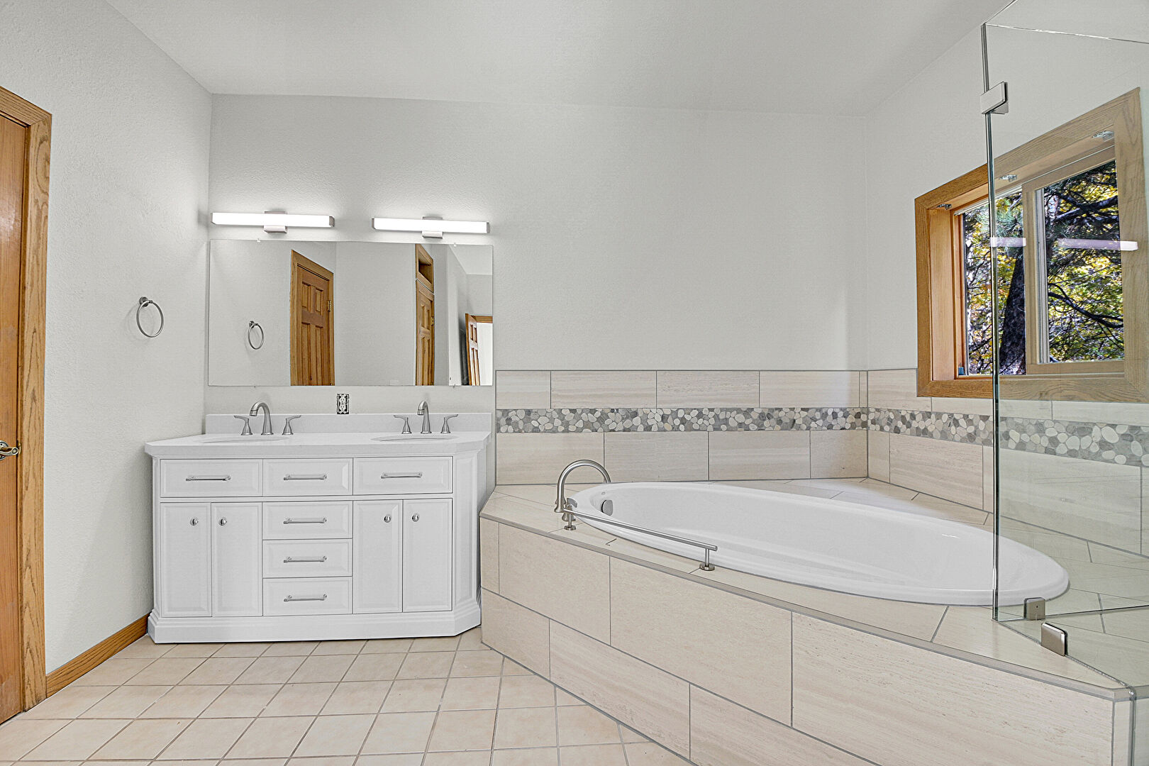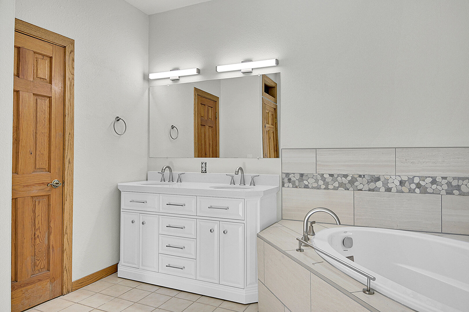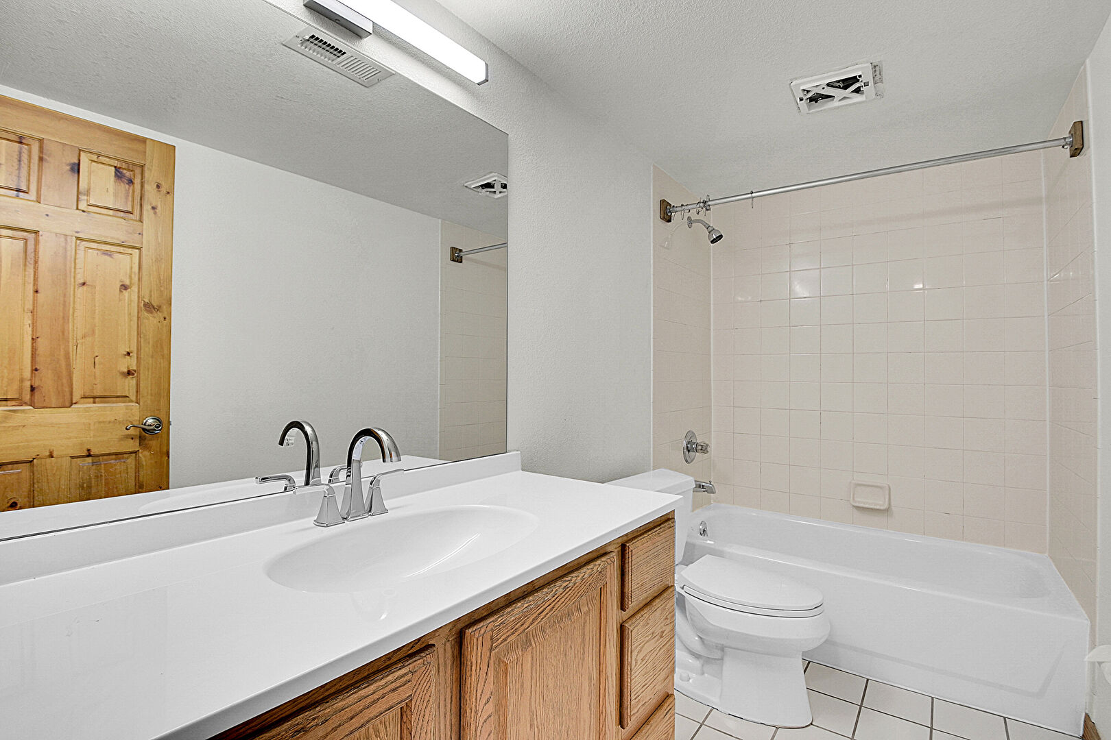 Baseboards Wall, Closet, Combined Bath Shower, Double Vanity, Drywall, Full Bathroom, Natural Light, Textured Ceiling, Tile Floor, Vanity, Vent, Baseboards Wall, Drywall, Full Bathroom, Tile Floor