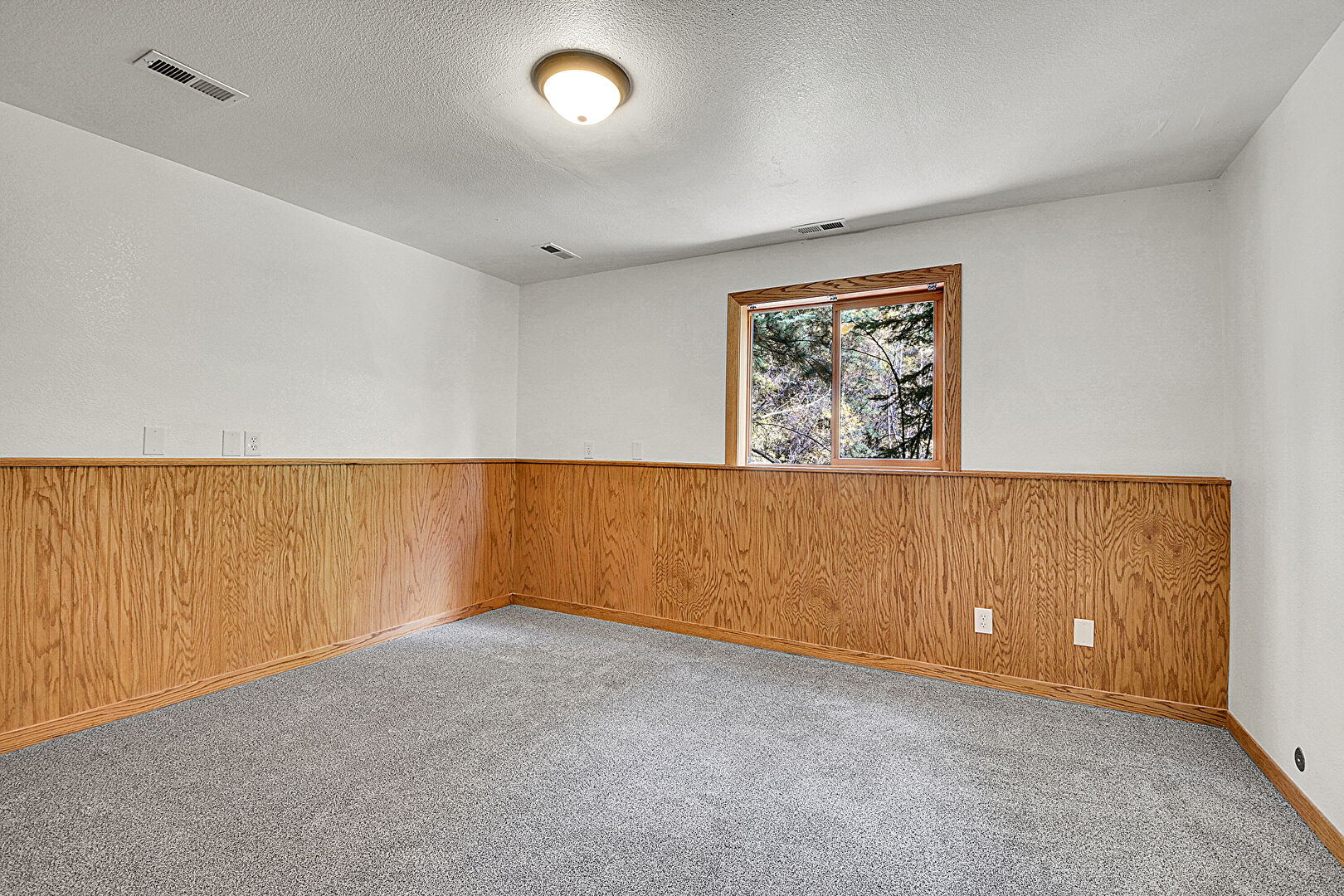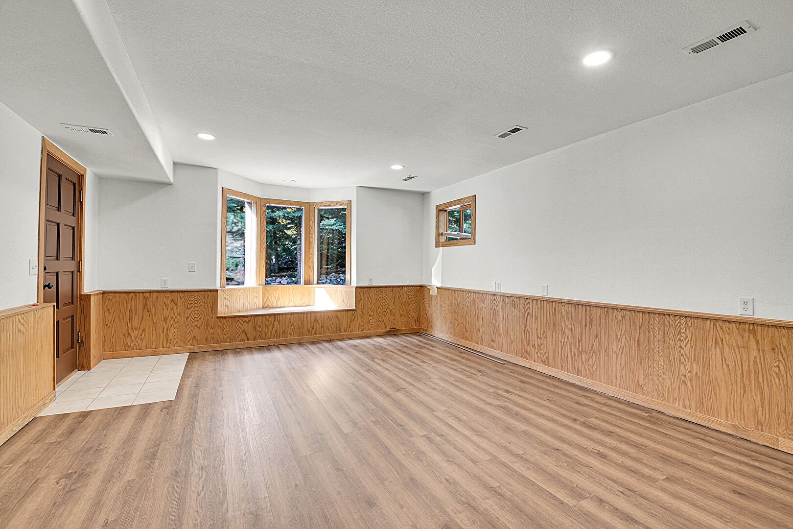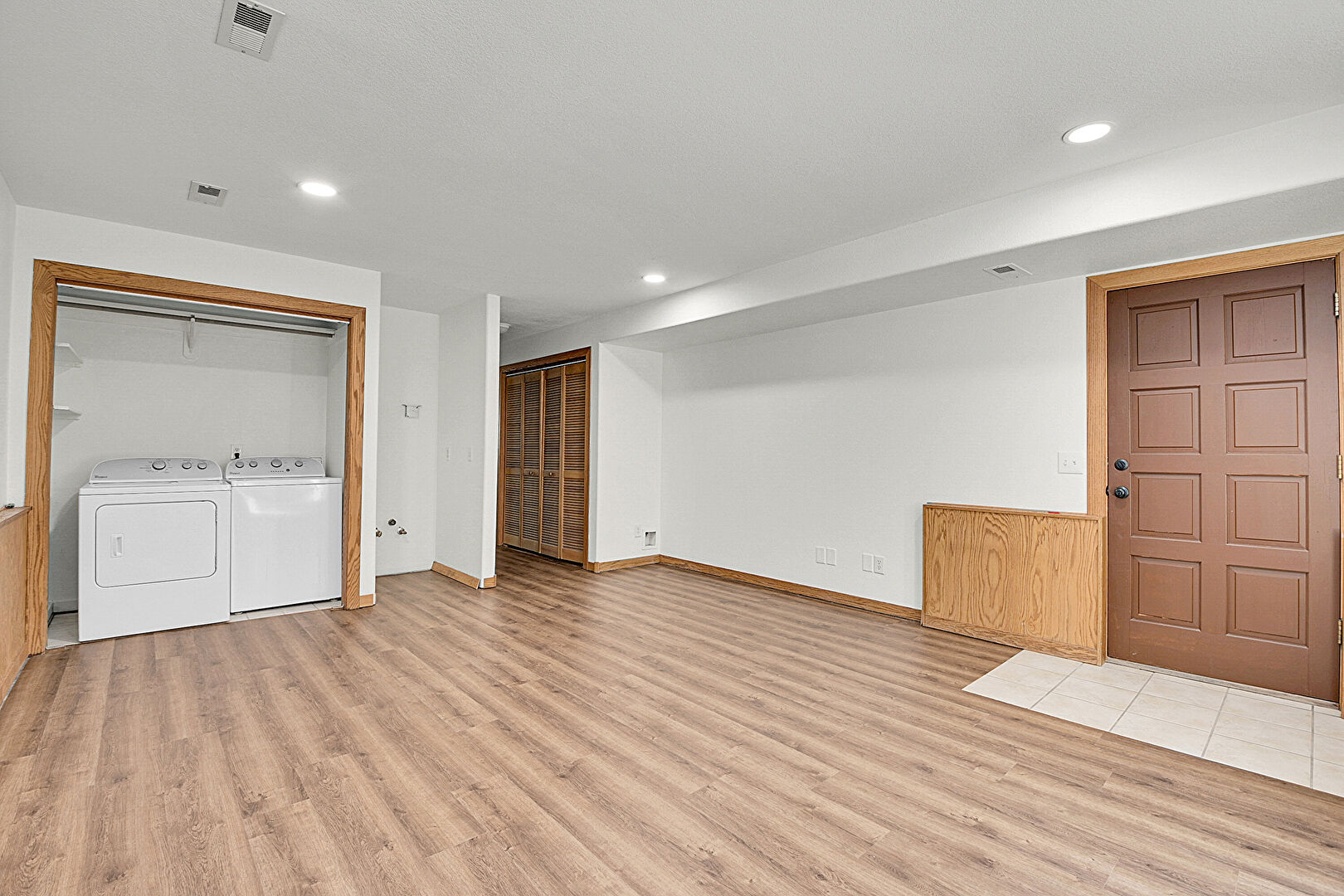 Baseboards Wall, Basement, Drywall, Laundry, Natural Light, Recessed Lighting, Textured Ceiling, Vent, Wainscot Wall, Wood Finish Floor, Wood Wall, Recessed Lighting, Wood Finish Floor