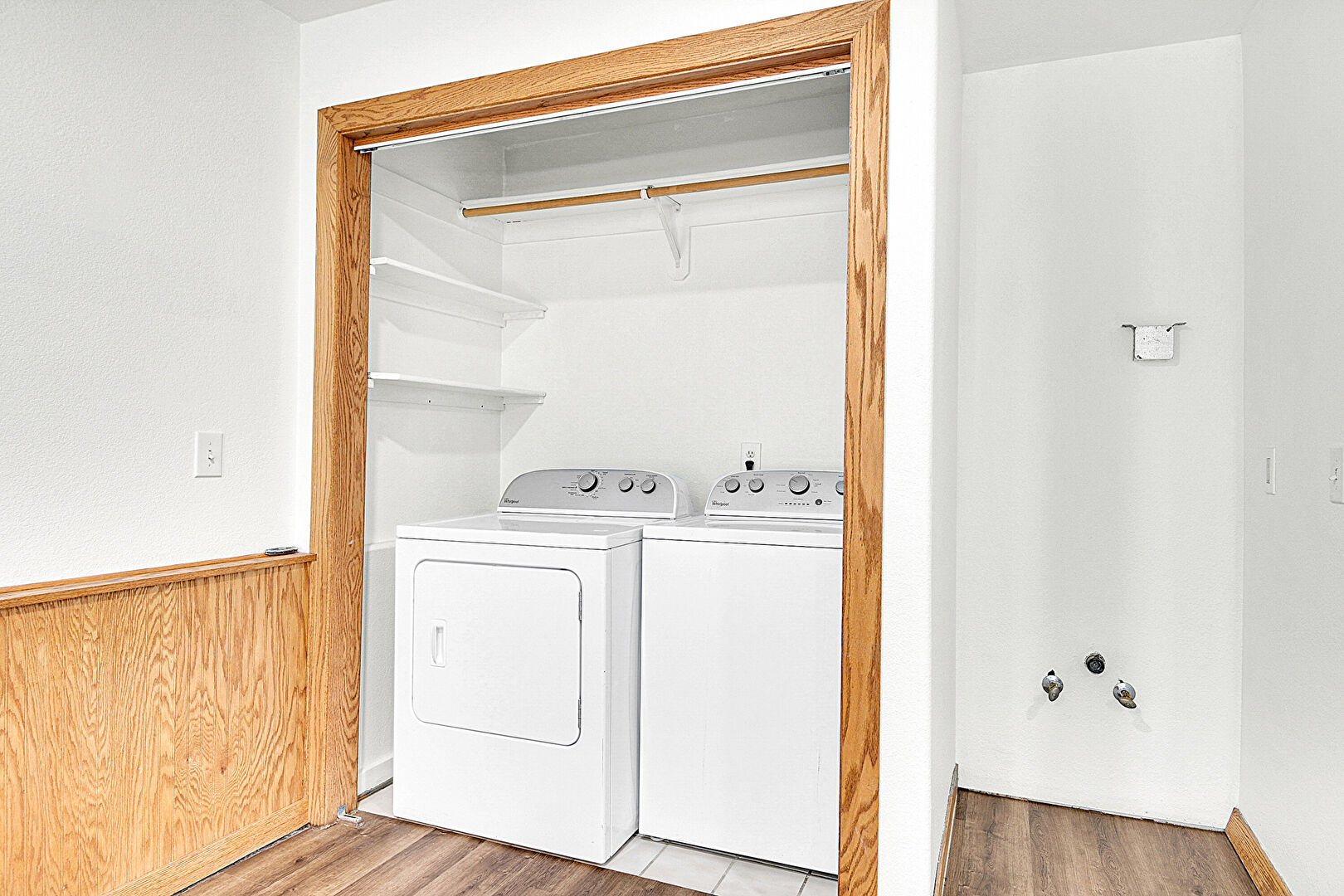 Drywall, Laundry, Wainscot Wall, Wood Finish Floor, Wood Wall, Baseboards Wall
