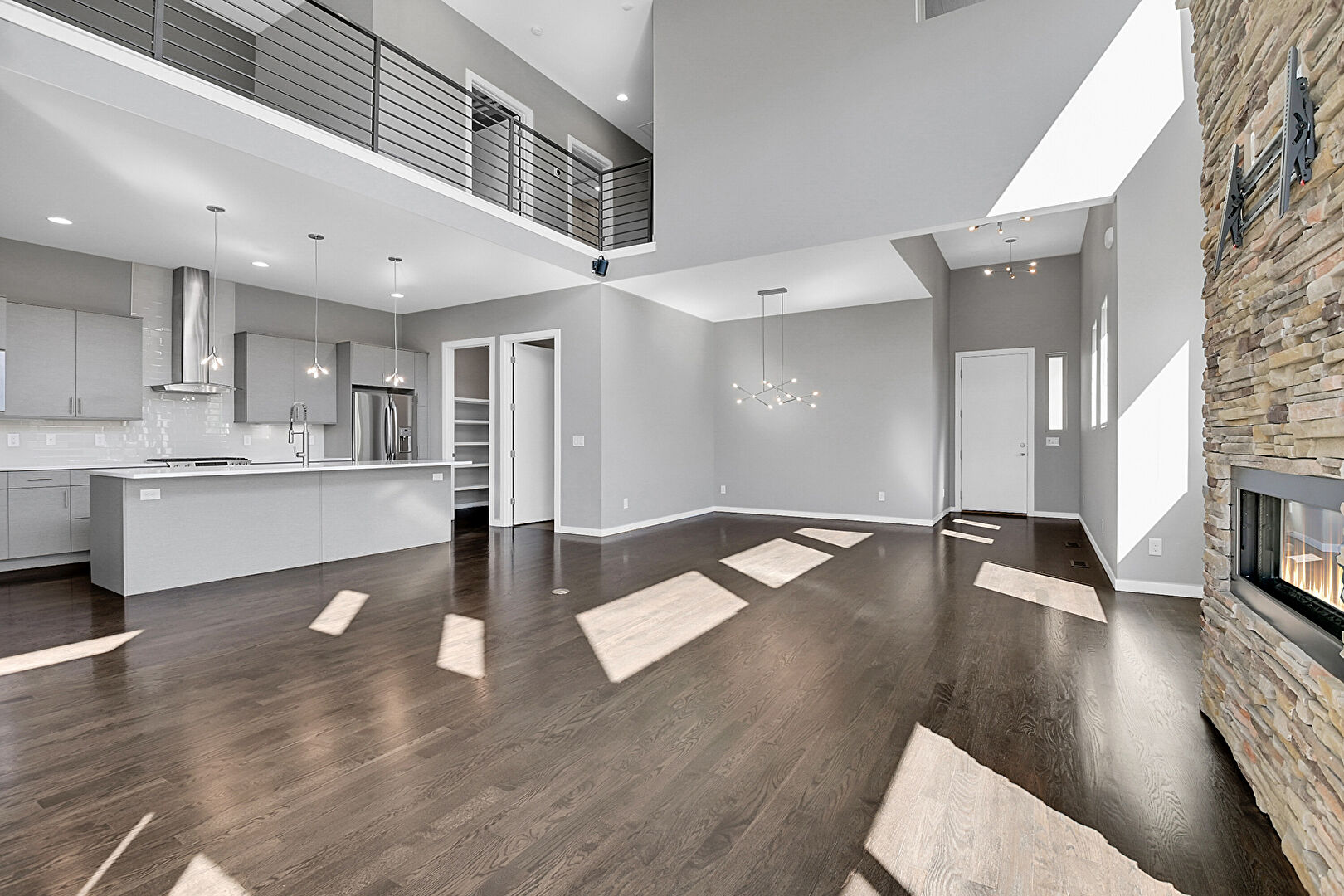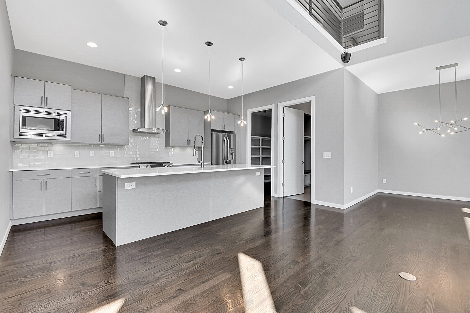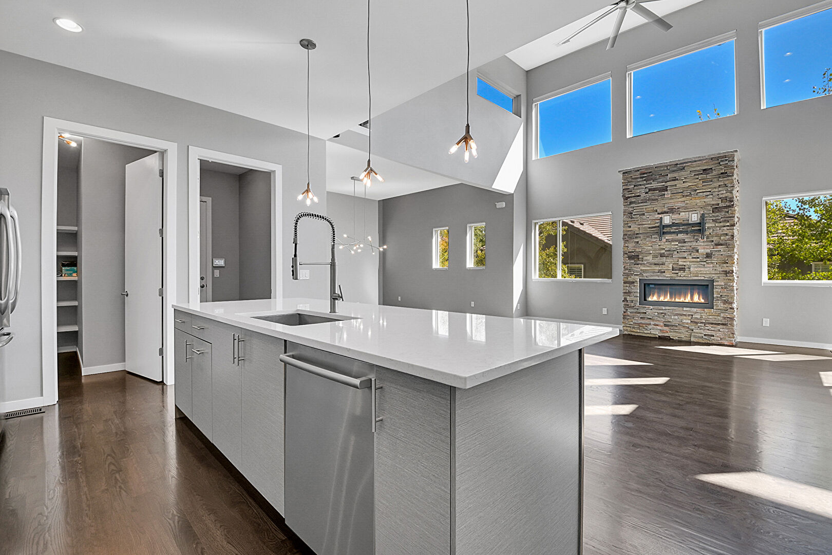 Baseboards Wall, Ceiling Fan, Drywall, Fireplace, Flat Panel Cabinets, Gray Cabinets, Kitchen Bar, Kitchen Island, Natural Light, Notable Chandelier, One Wall Kitchen, Opens To Living Area, Pendant Lighting, Recessed Lighting, Stone Countertops, Vaulted Ceiling, Vent, Wine Cooler, Wood Finish Floor, Baseboards Wall, High Ceiling, Stone Countertops, Wood Finish Floor