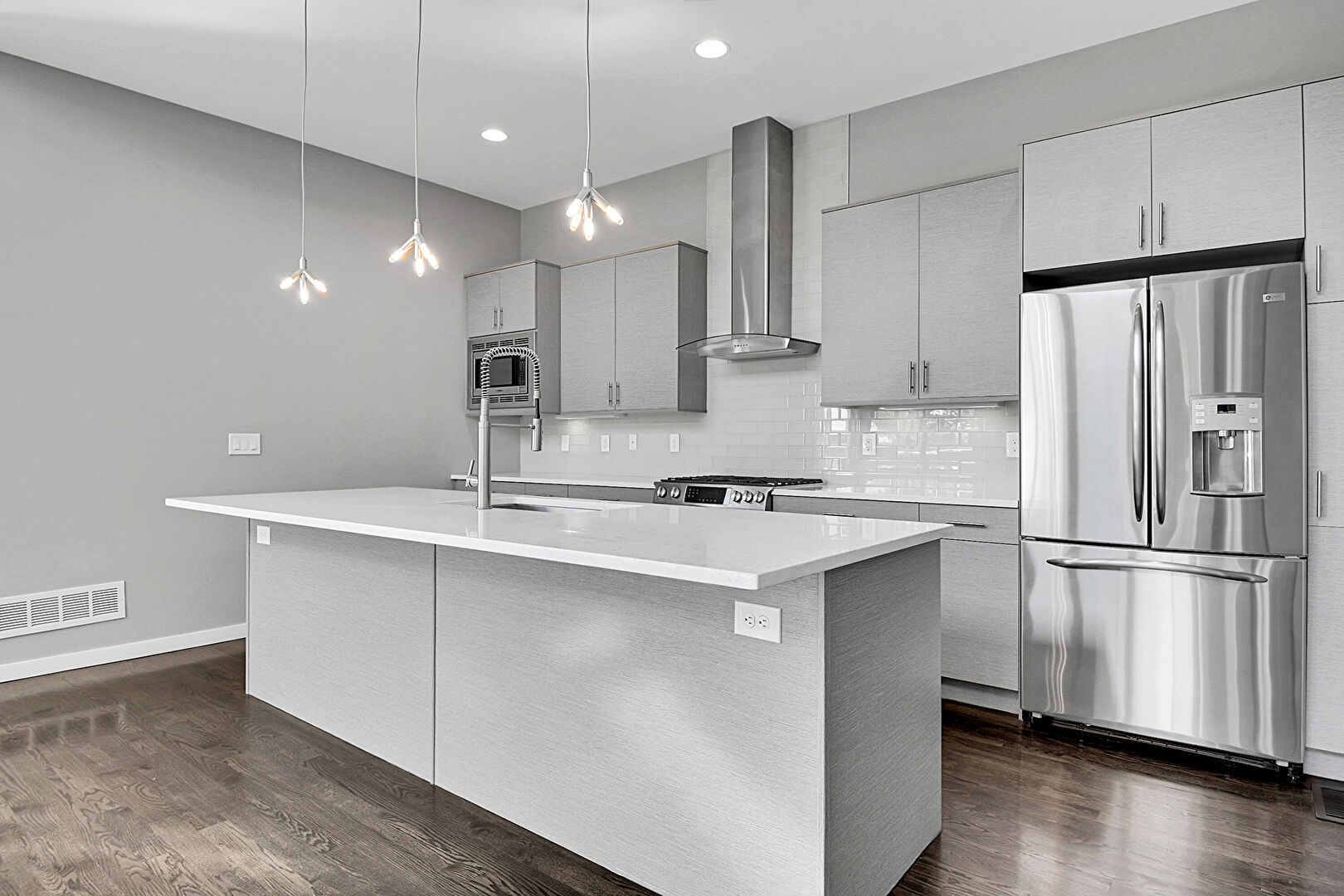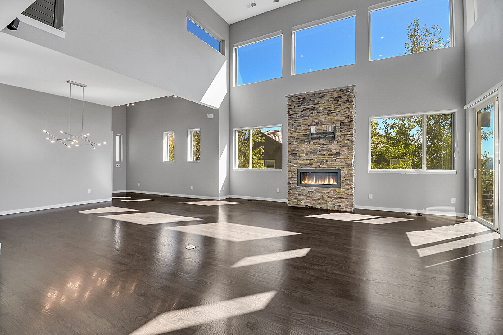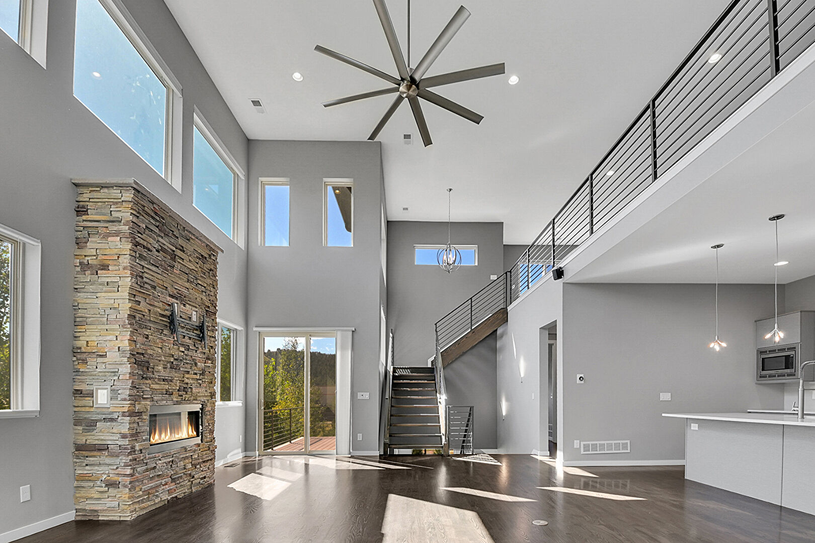 Baseboards Wall, Ceiling Fan, Drywall, Fireplace, Flat Panel Cabinets, Gray Cabinets, Kitchen Bar, Kitchen Island, Natural Light, Notable Chandelier, One Wall Kitchen, Opens To Living Area, Pendant Lighting, Recessed Lighting, Stone Countertops, Vaulted Ceiling, Vent, Wine Cooler, Wood Finish Floor, Baseboards Wall, High Ceiling, Stone Countertops, Wood Finish Floor