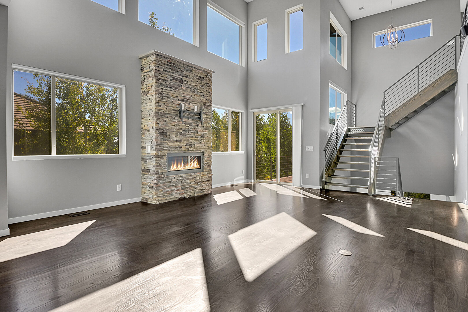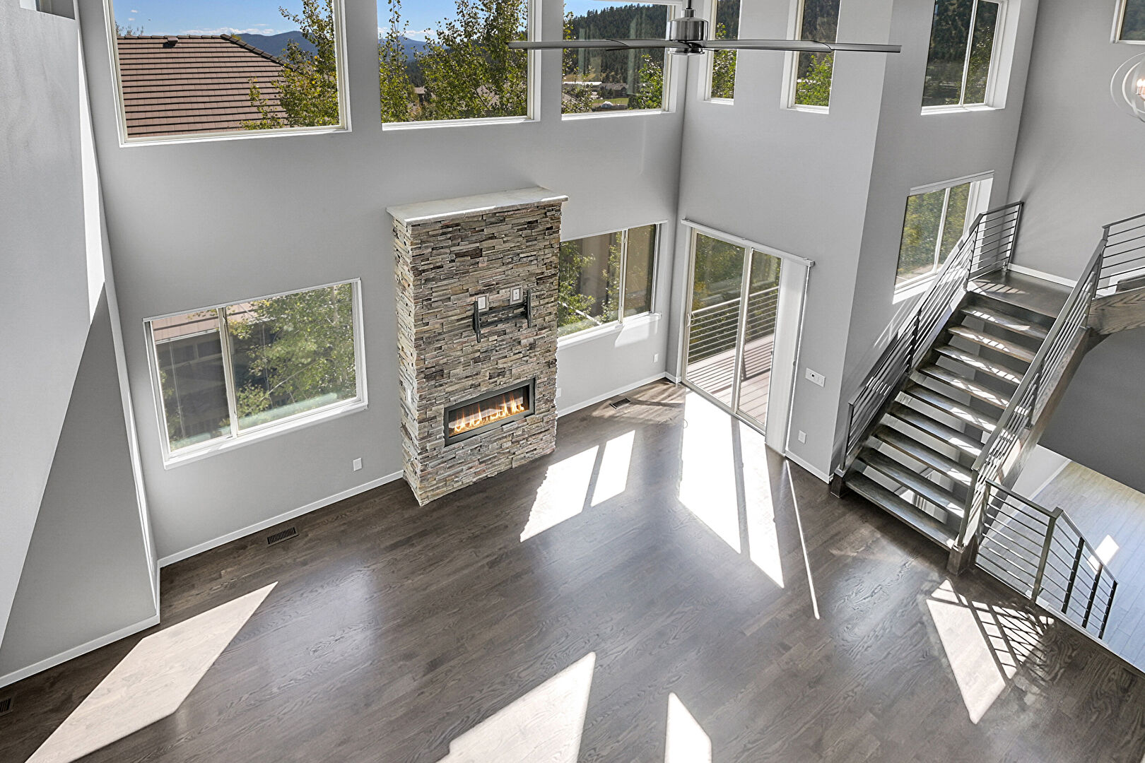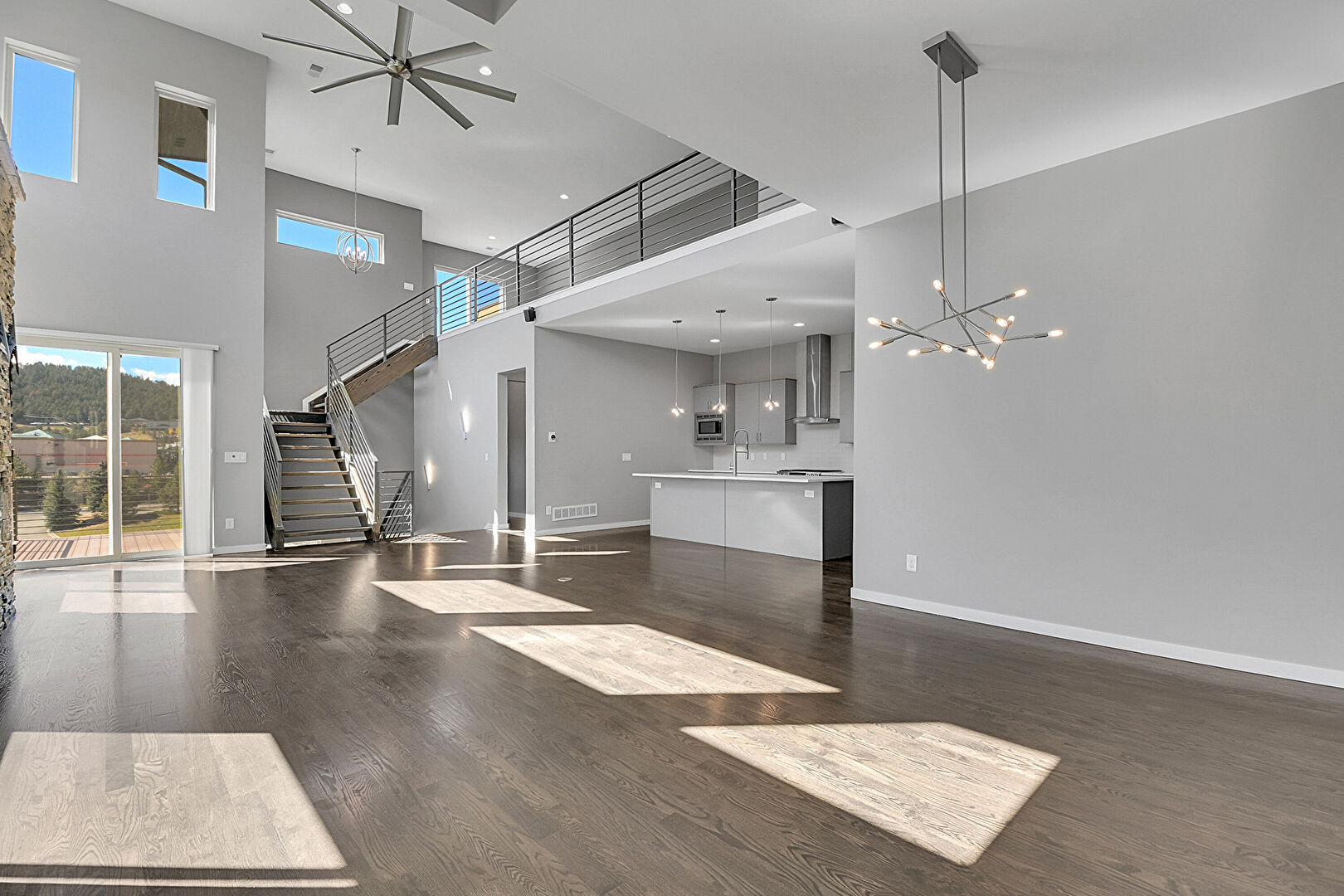 Baseboards Wall, Beamed Ceiling, Ceiling Fan, Drywall, Fireplace, High Ceiling, Natural Light, Notable Chandelier, One Wall Kitchen, Recessed Lighting, Stairs, Stone Wall, Vent, Wood Finish Floor, Baseboards Wall, Drywall, Fireplace, Notable Chandelier, Stairs, Wood Finish Floor
