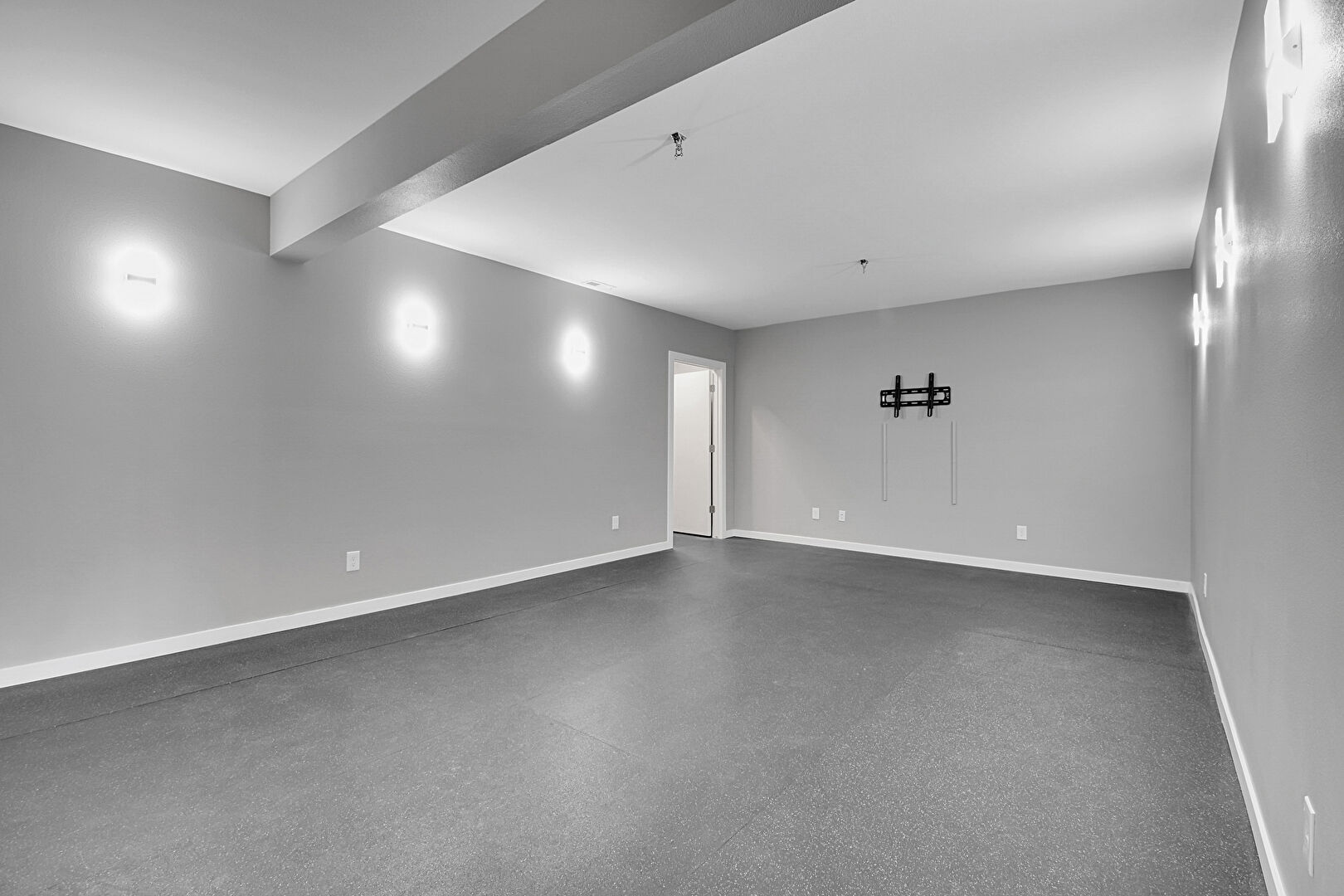 Baseboards Wall, Beamed Ceiling, Drywall, Aggregate Floor