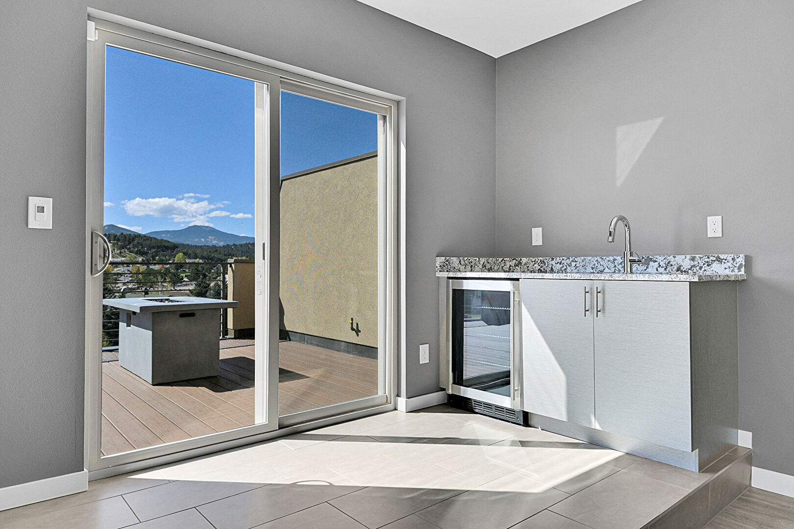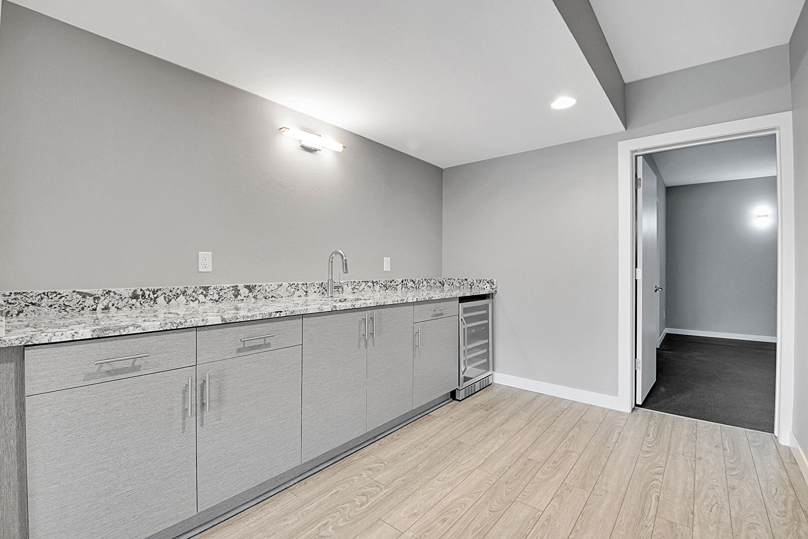 Drywall, Flat Panel Cabinets, Mountain View, Natural Light, Stone Countertops, Tile Floor, Wine Cooler, Baseboards Wall