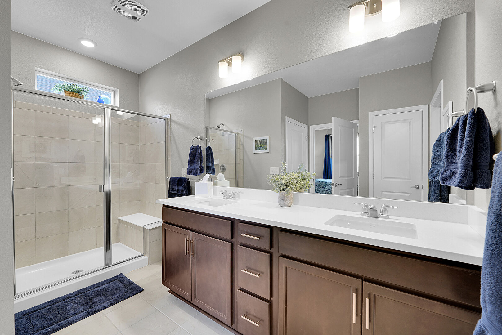 Baseboards Wall, Double Vanity, Full Bathroom, Natural Light, Recessed Lighting, Textured Ceiling, Textured Wall, Tile Floor, Vent, Natural Light, Tile Floor
