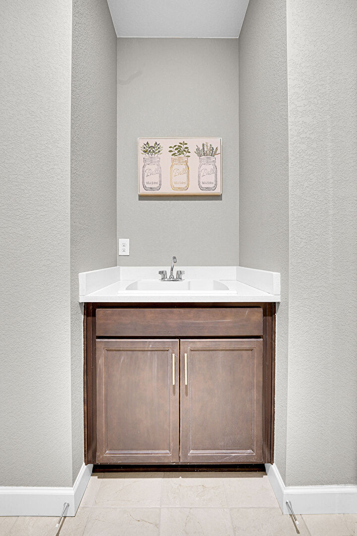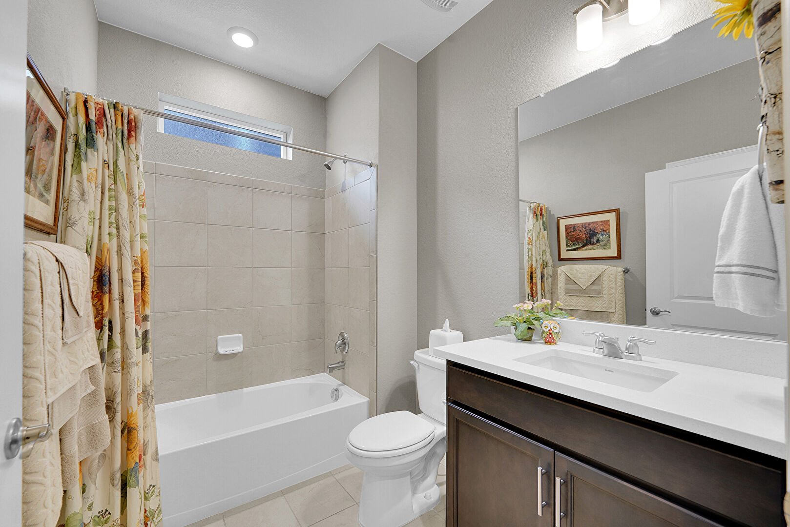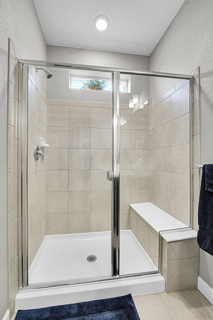 Baseboards Wall, Drywall, Full Bathroom, Natural Light, Tile Floor, Vanity, Combined Bath Shower, Textured Wall