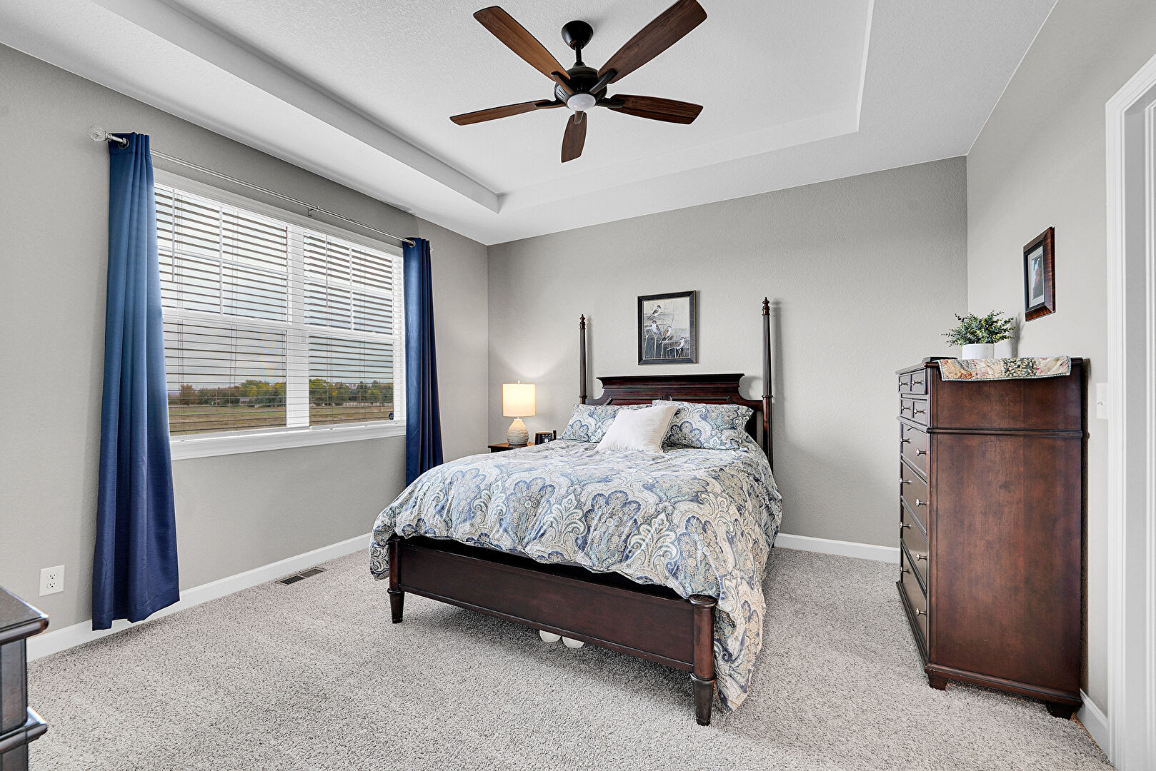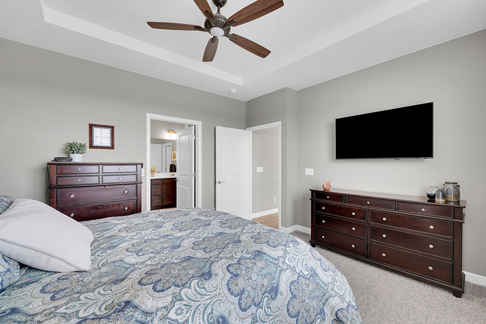 Baseboards Wall, Carpet, Ceiling Fan, Drywall, Ensuite Bathroom, Natural Light, Tray Ceiling, Vent, Carpet, Ceiling Fan