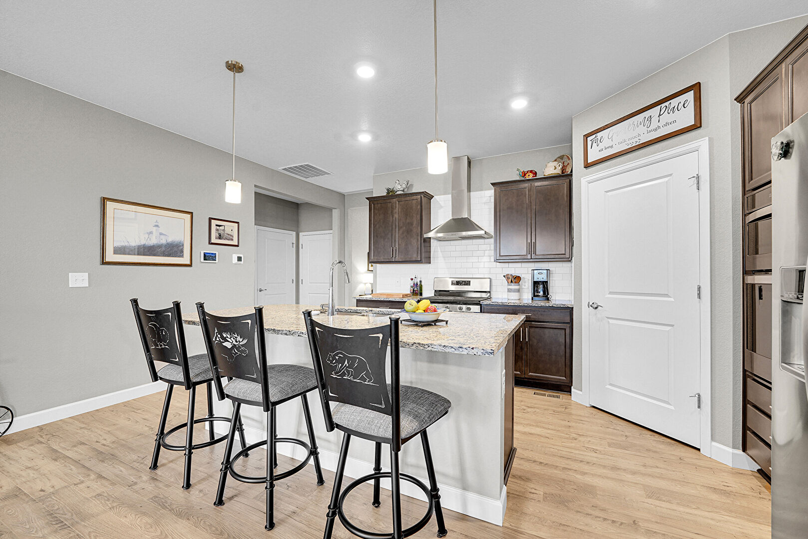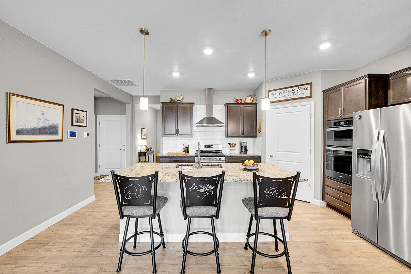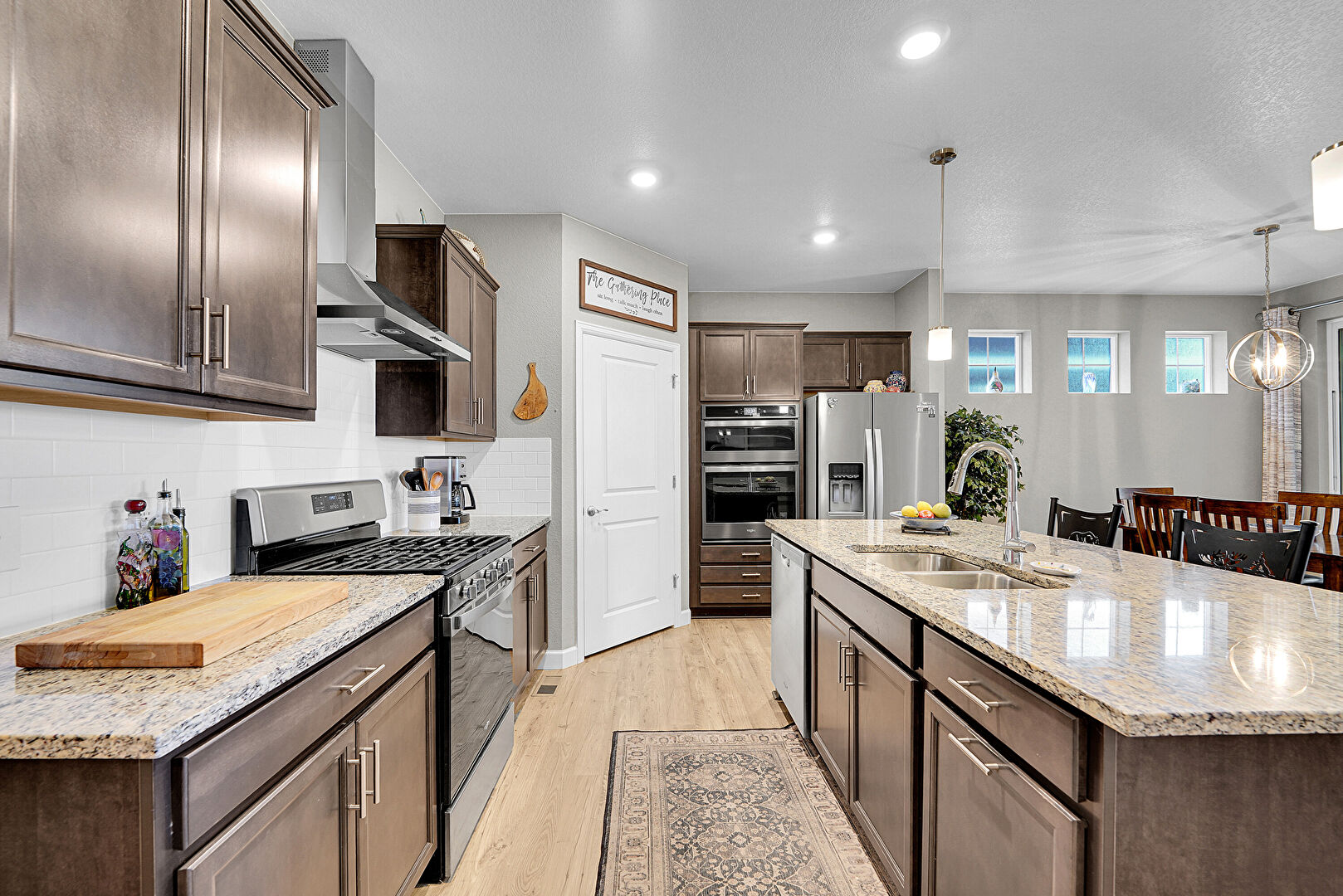 Baseboards Wall, Crown Molding Cabinets, Dark Brown Cabinets, Double Oven, Drywall, Kitchen Bar, Kitchen Island, L Shaped Kitchen, Medium Brown Cabinets, Natural Light, Notable Chandelier, Opens To Living Area, Pendant Lighting, Recessed Lighting, Shaker Cabinets, Stone Countertops, Vent, Wood Finish Floor, Dark Brown Cabinets, Drywall, Natural Light, Shaker Cabinets, Wood Finish Floor