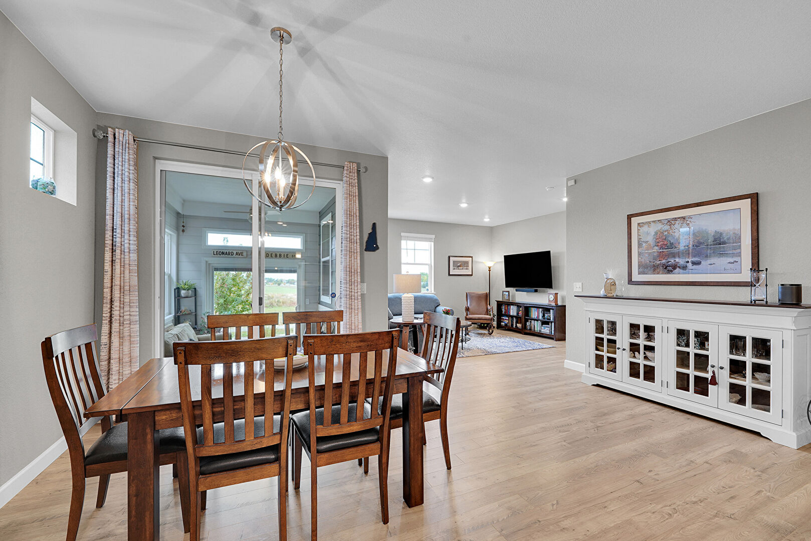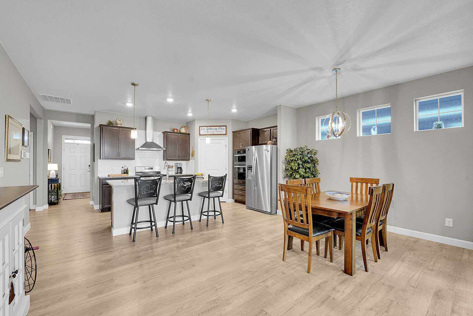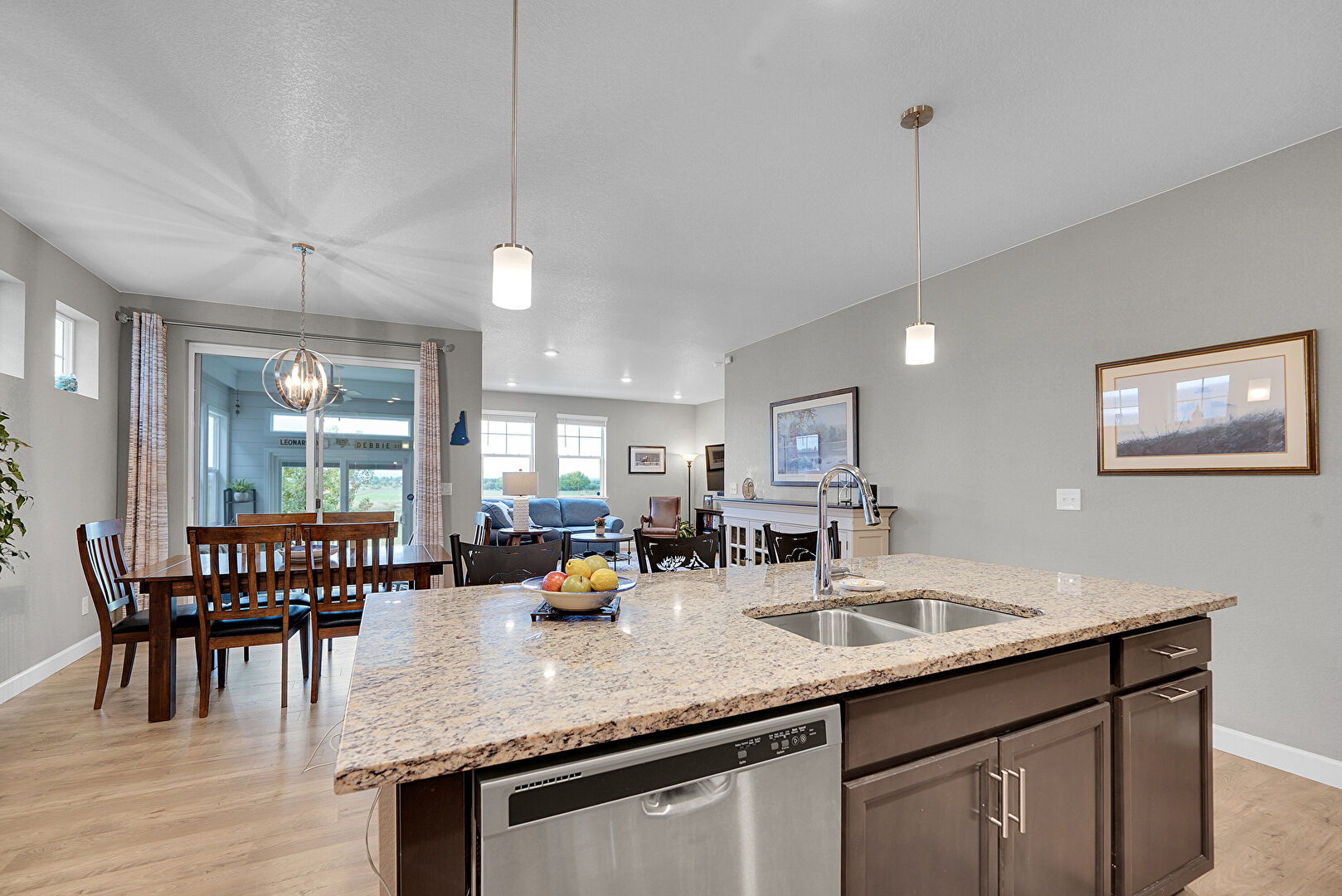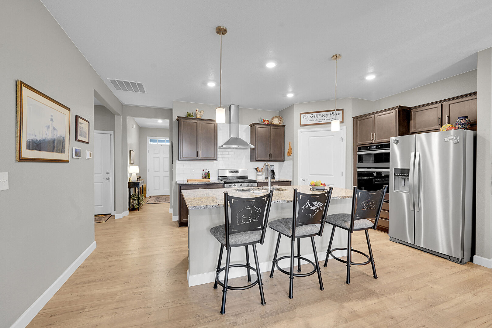 Baseboards Wall, Crown Molding Cabinets, Dark Brown Cabinets, Double Oven, Drywall, Kitchen Bar, Kitchen Island, L Shaped Kitchen, Medium Brown Cabinets, Natural Light, Notable Chandelier, Opens To Living Area, Pendant Lighting, Recessed Lighting, Shaker Cabinets, Stone Countertops, Vent, Wood Finish Floor, Dark Brown Cabinets, Drywall, Natural Light, Shaker Cabinets, Wood Finish Floor