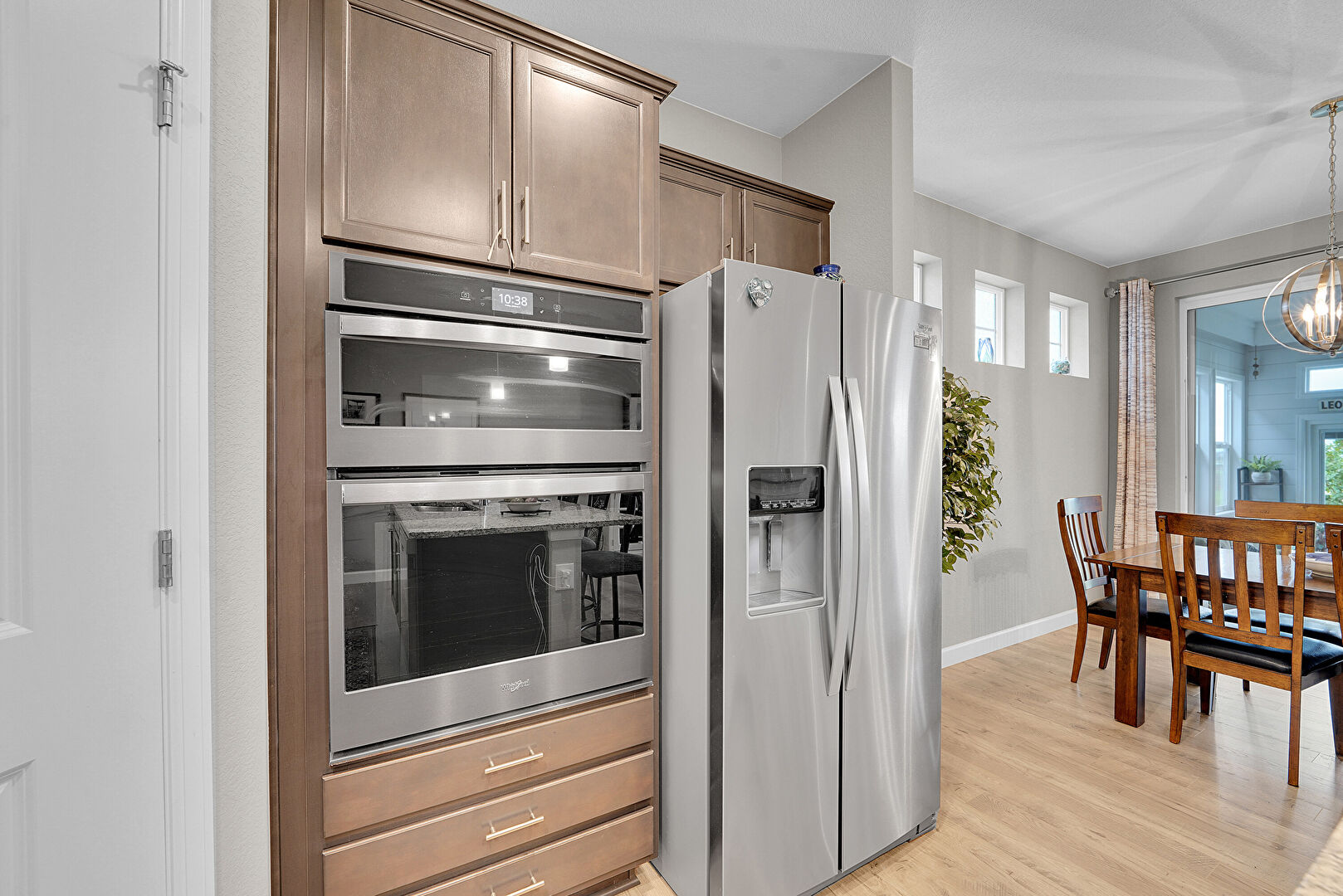 Double Oven, Drywall, L Shaped Kitchen, Natural Light, Notable Chandelier, Recessed Lighting, Vent, Wood Finish Floor, Baseboards Wall
