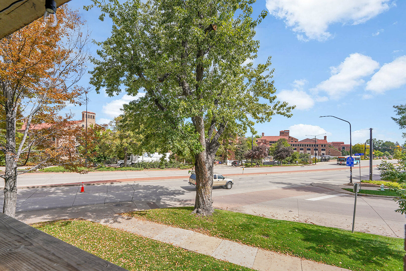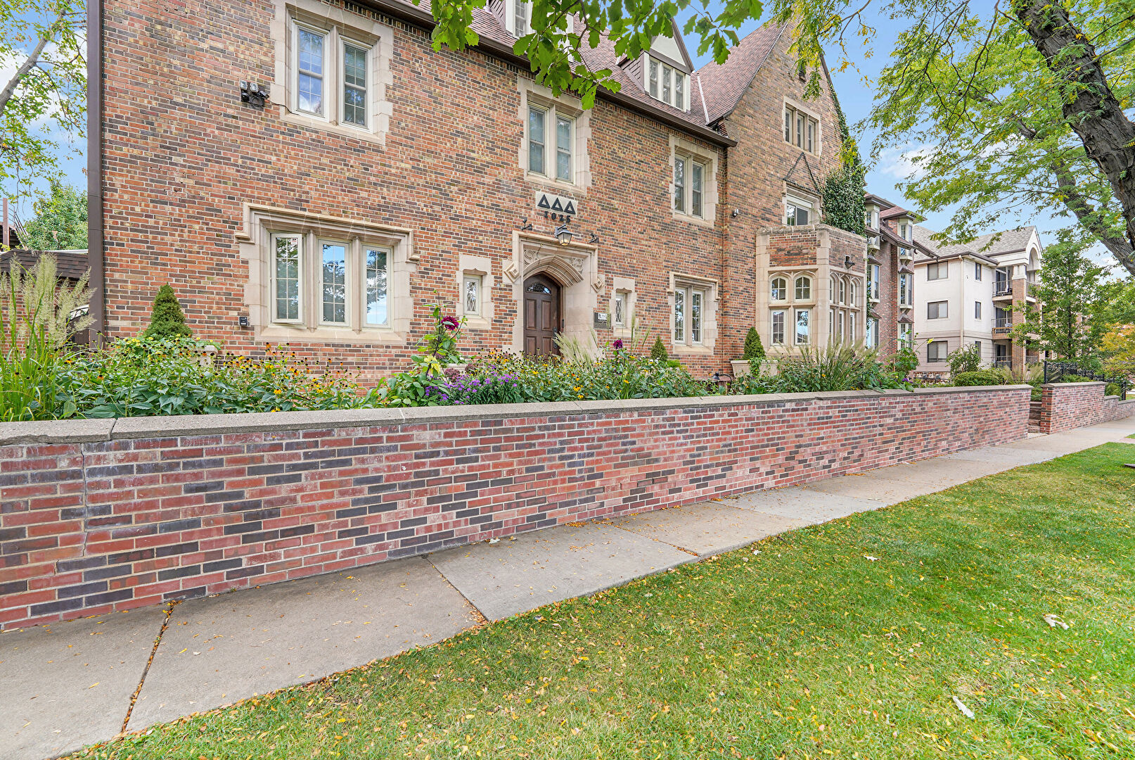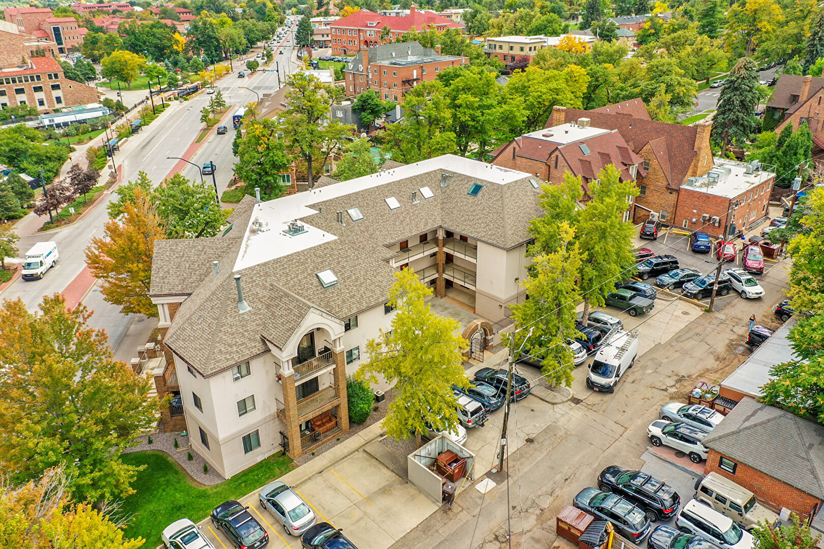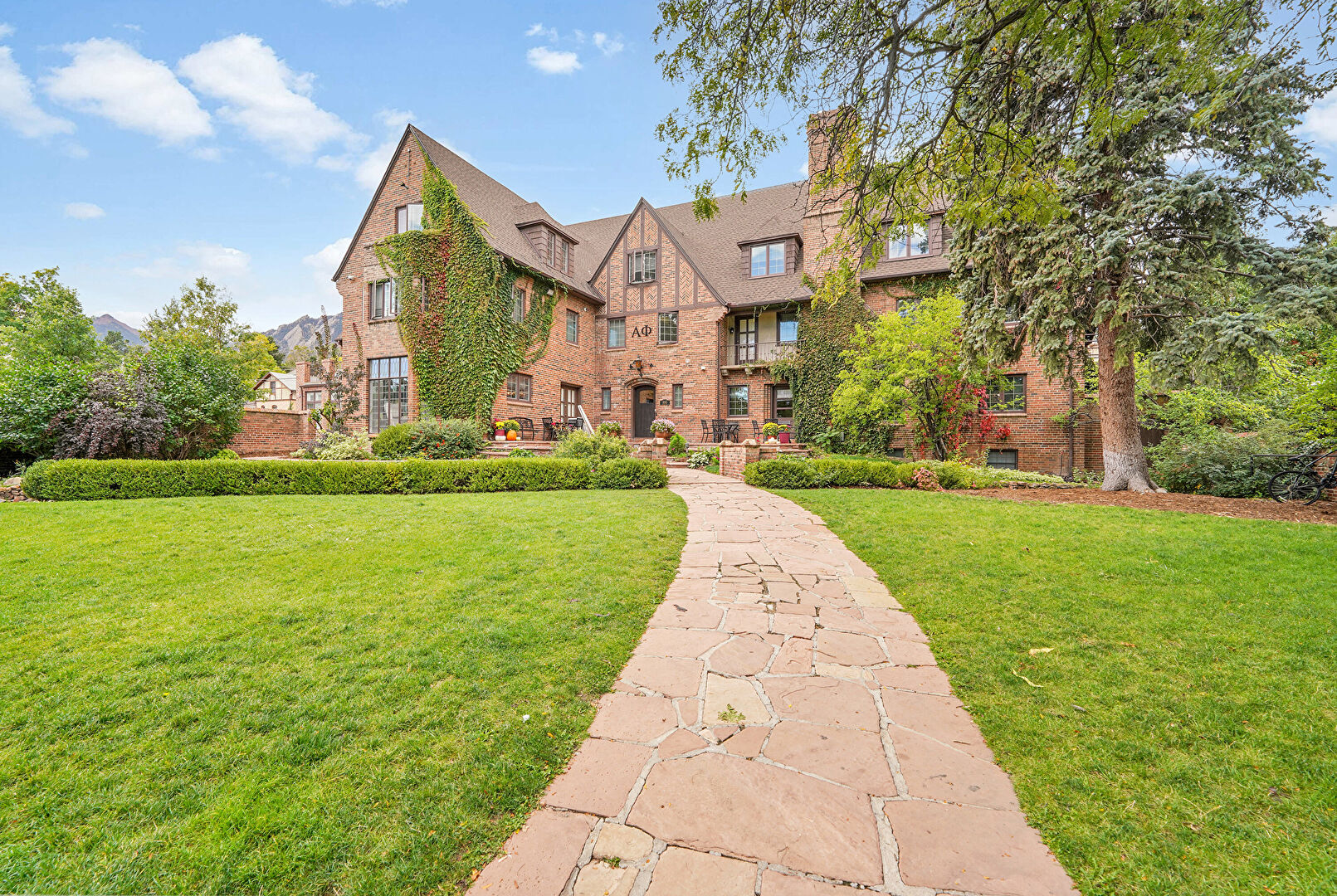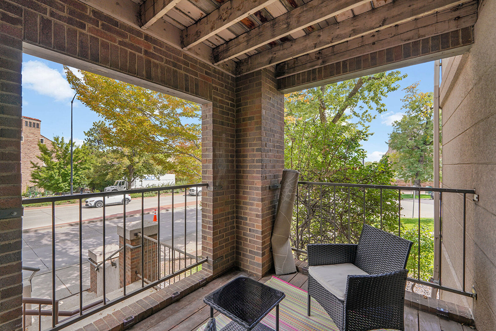 Balcony, Brick Siding, Chimney, Curbs, Dormer Roof, Downspout, Fence, Lawn, Porch, Residential View, Sidewalks, Street, Street Lights, Traffic Signs, Apartment Complex View, Brick Siding, Lawn, Mountain View