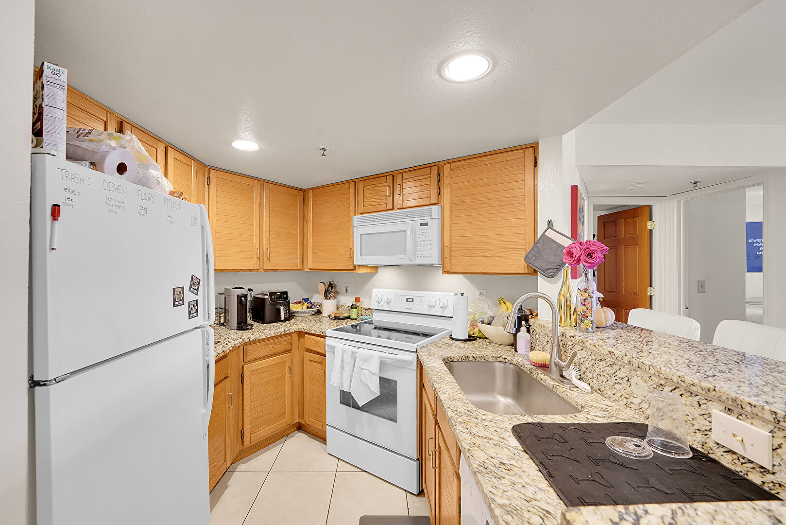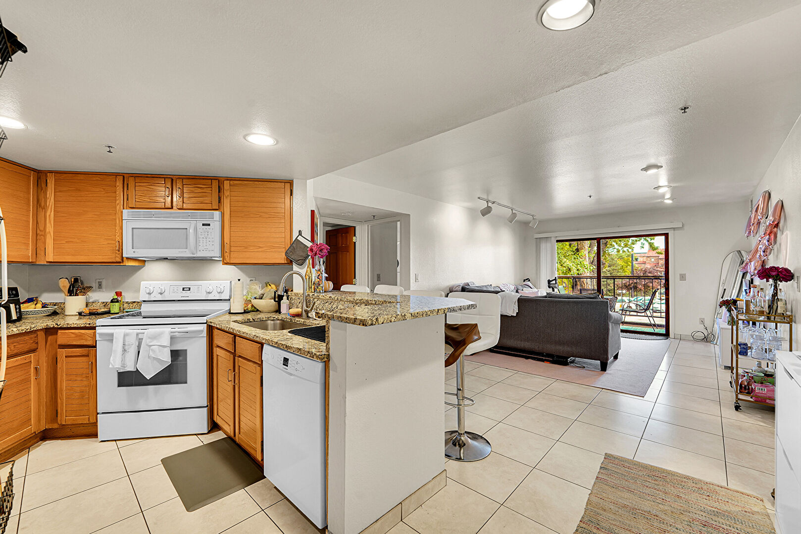 Baseboards Wall, Drywall, Kitchen Bar, Kitchen Peninsula, Medium Brown Cabinets, Natural Light, Opens To Living Area, Recessed Lighting, Shaker Cabinets, Stone Countertops, Textured Ceiling, Tile Floor, Track Lighting, U Shaped Kitchen, Vent, Visible Hinge Cabinets, Baseboards Wall, Kitchen Bar, Kitchen Peninsula, Medium Brown Cabinets