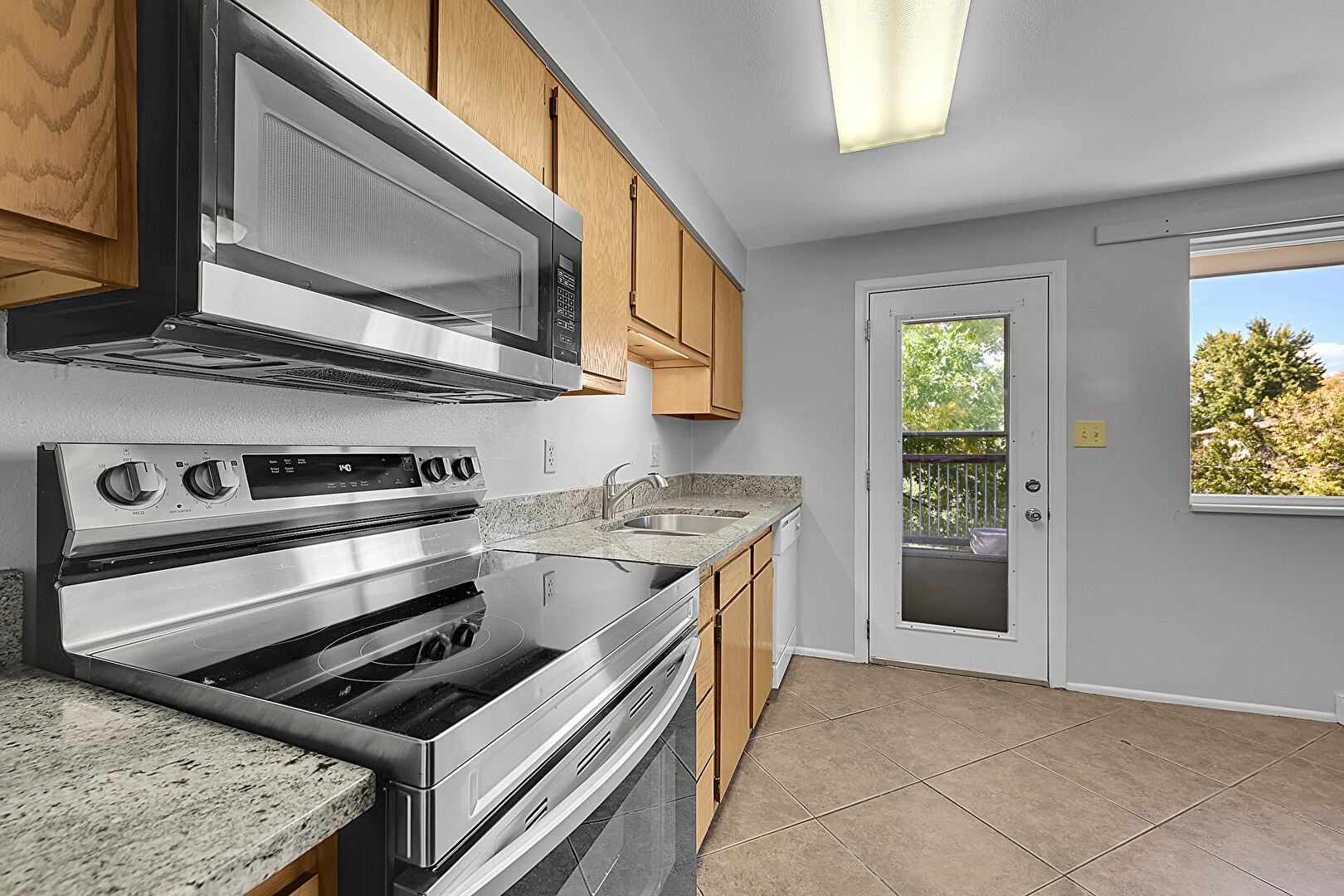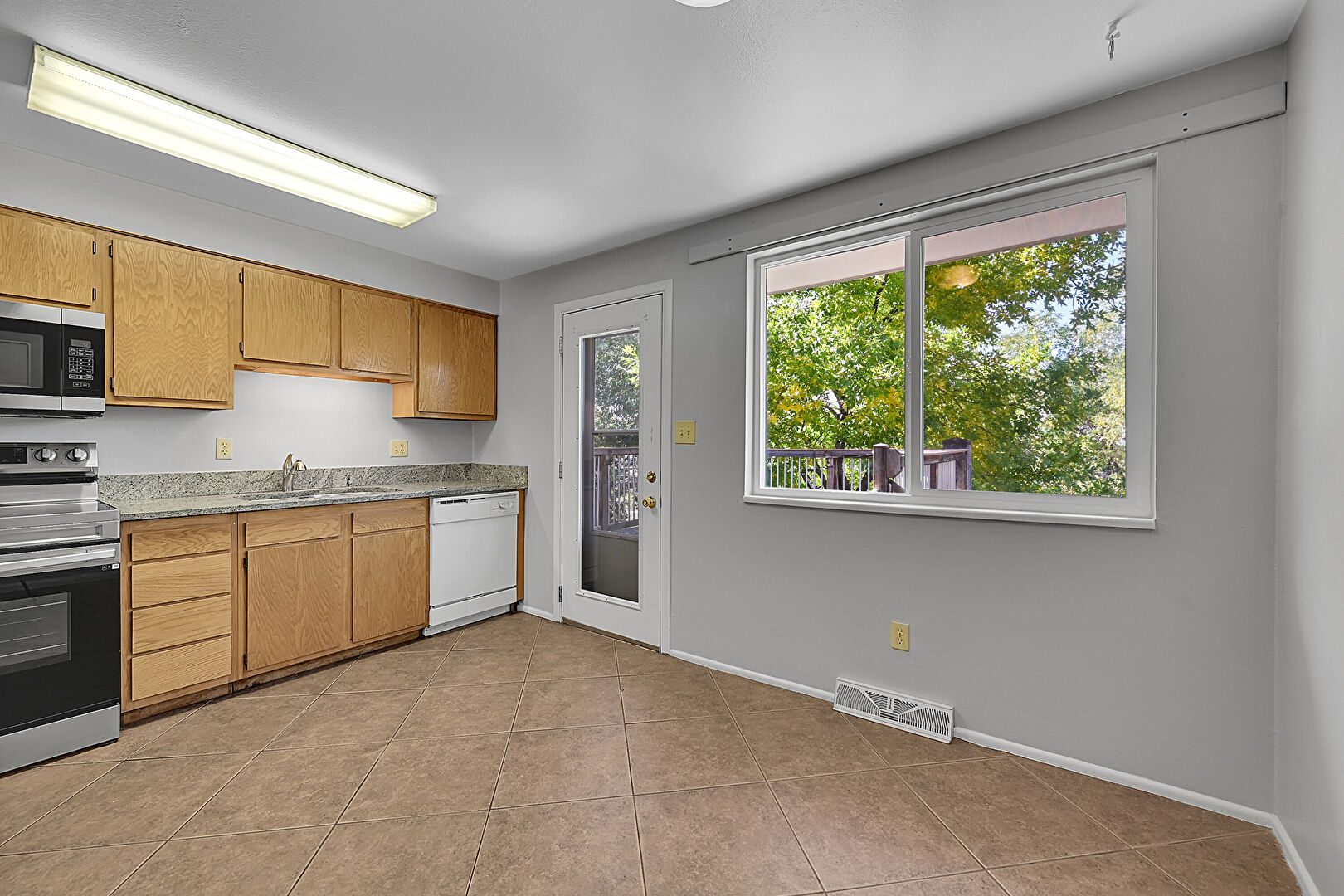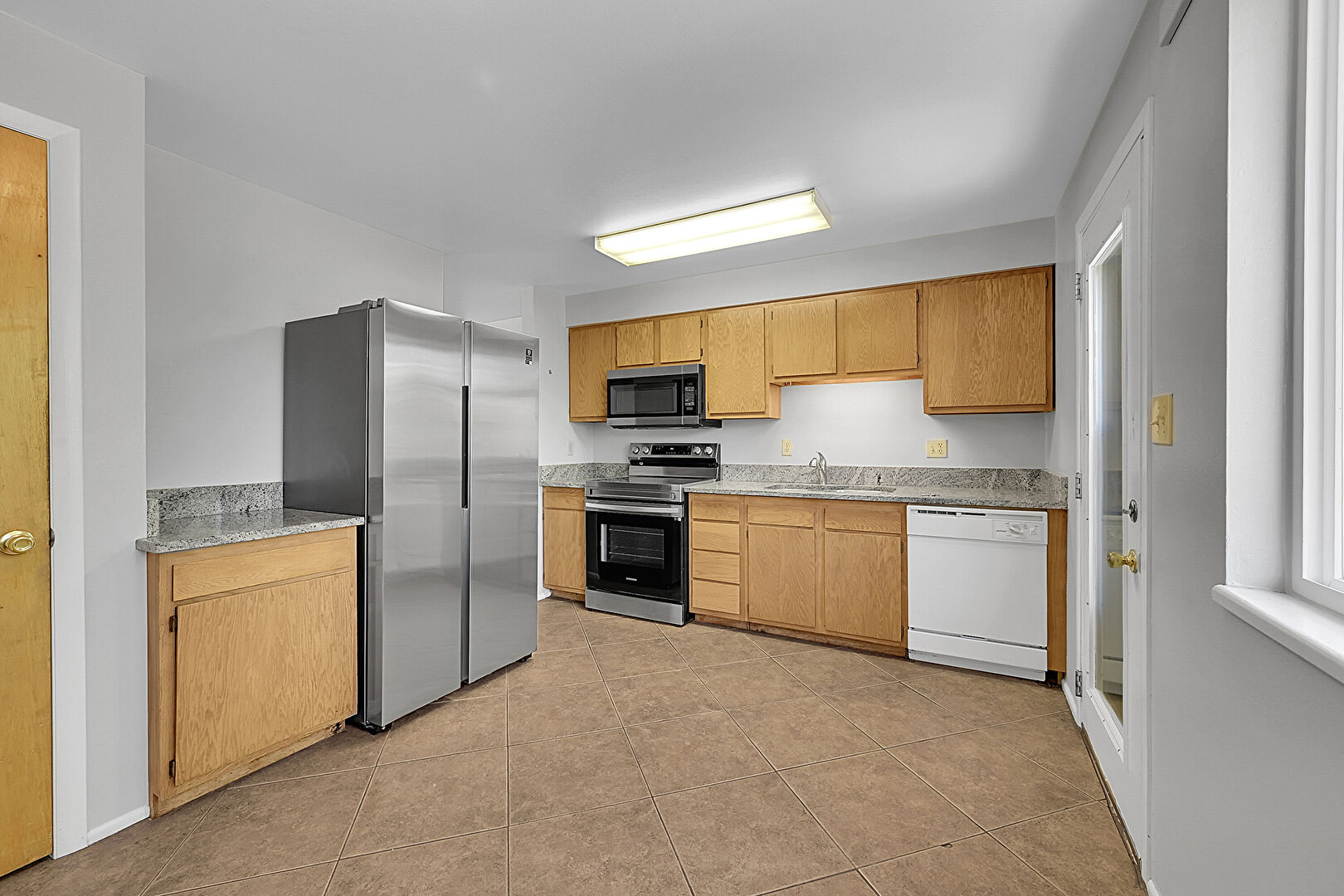 Baseboards Wall, Drywall, L Shaped Kitchen, Medium Brown Cabinets, Natural Light, Stone Countertops, Tile Floor, Vent, Visible Hinge Cabinets, Stone Countertops, Tile Floor
