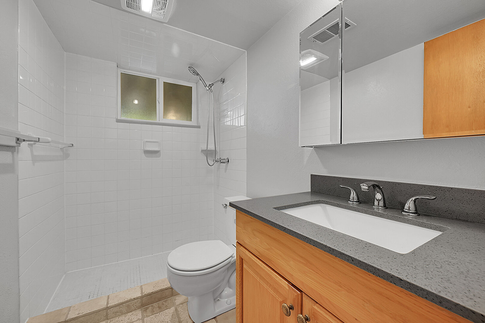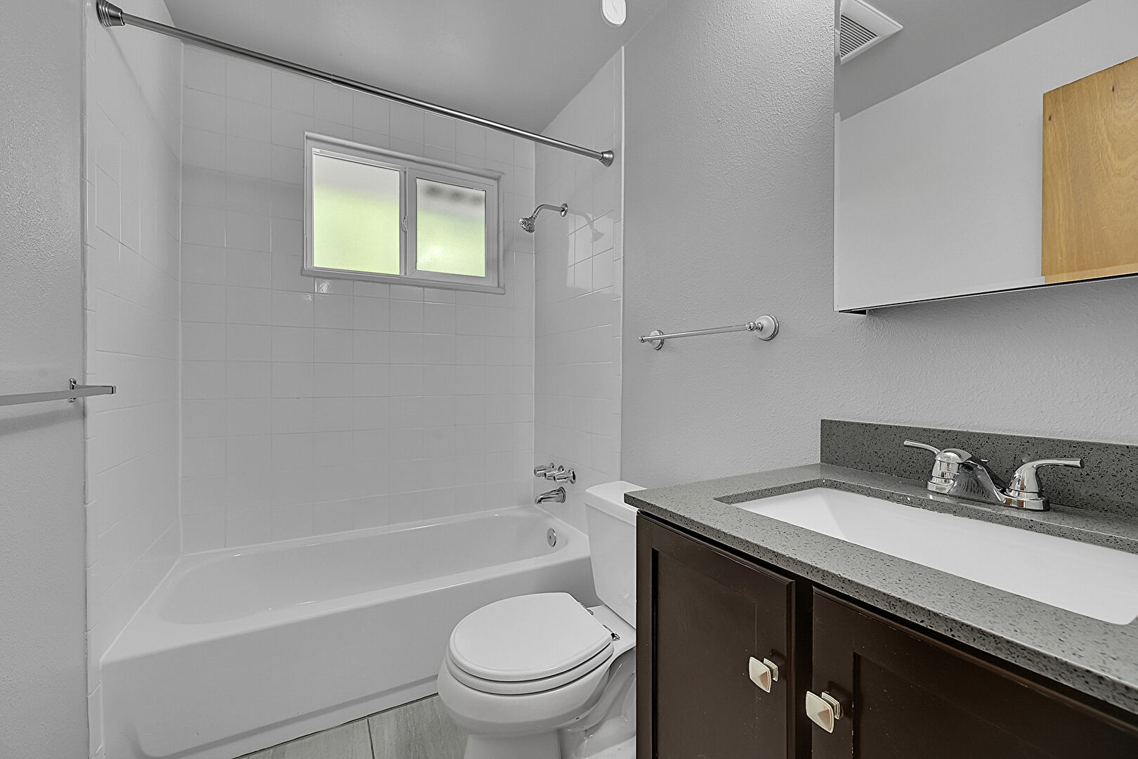 Combined Bath Shower, Drywall, Full Bathroom, Natural Light, Textured Wall, Vanity, Vent, Tile Floor, Vent