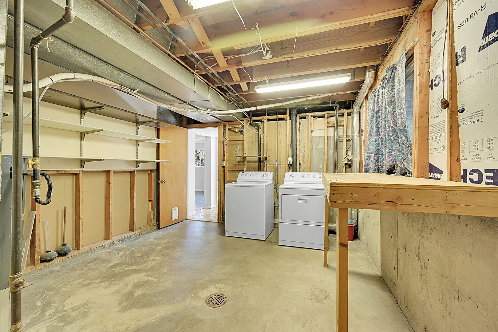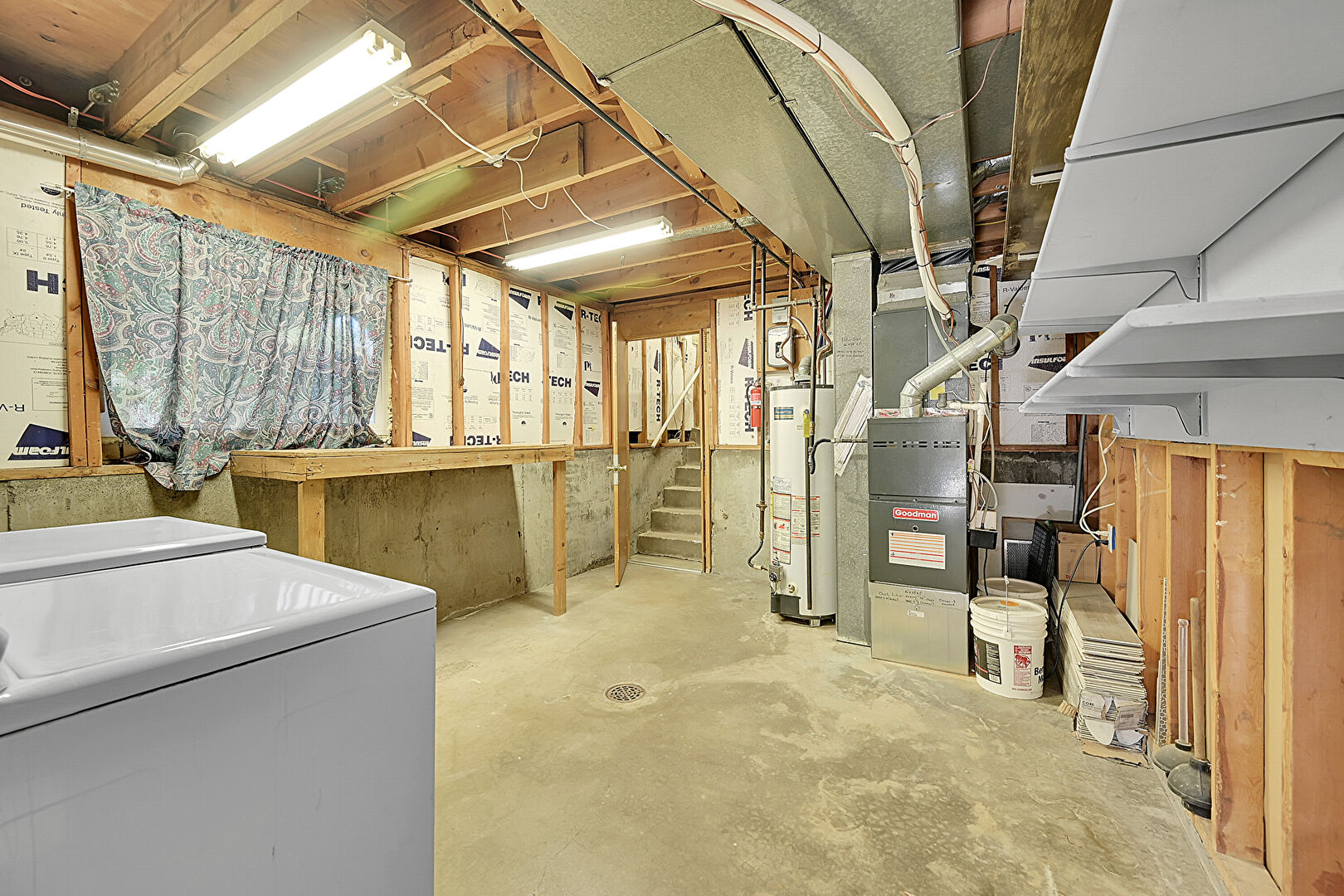 Basement, Concrete Foundation, Fire Extinguisher, Furnace, Laundry, Stairs, Washer Dryer, Water Heater, Basement, Laundry