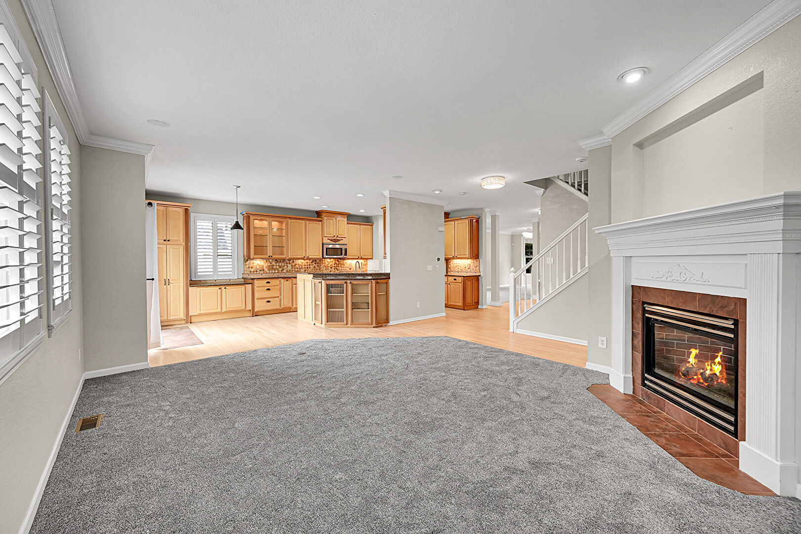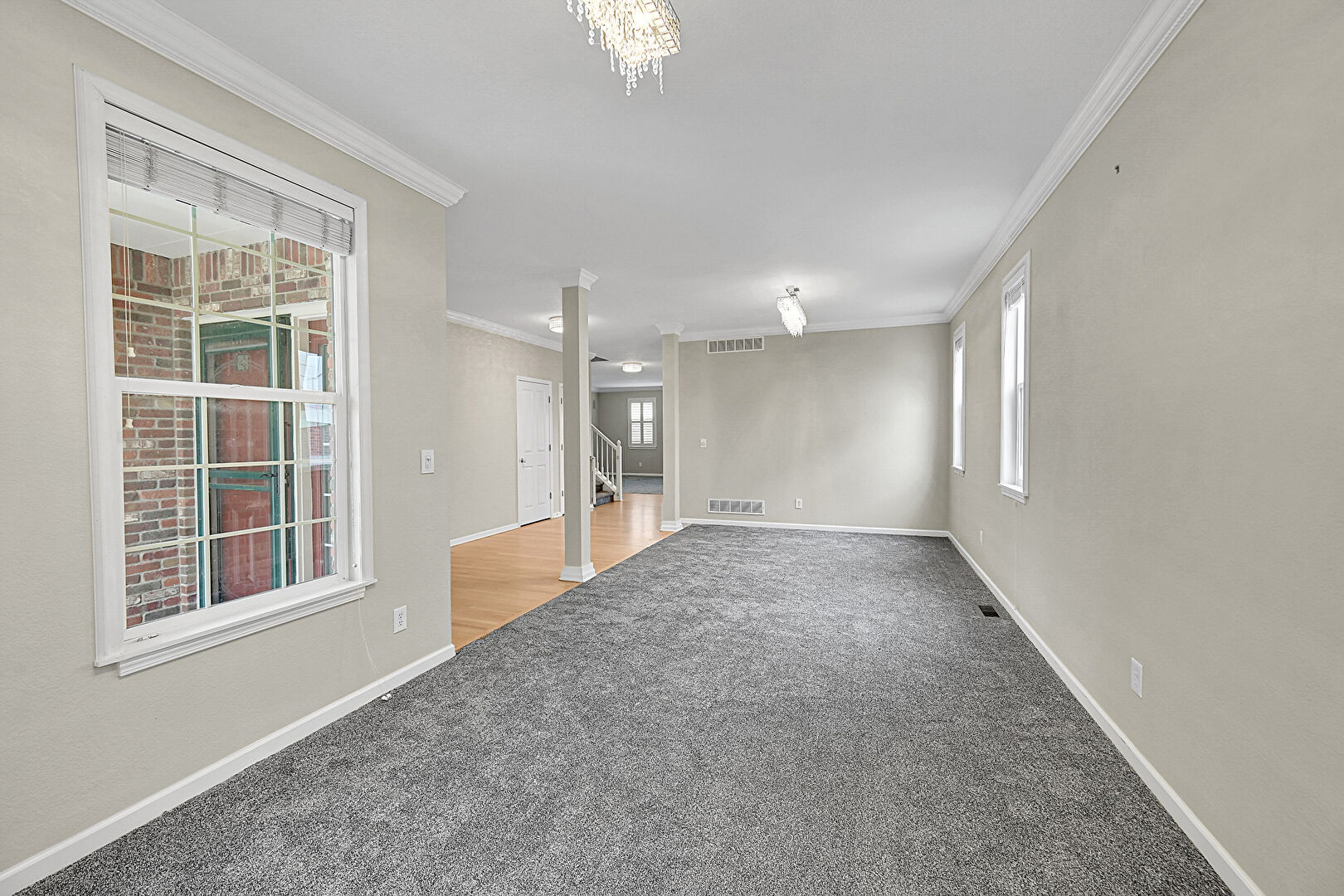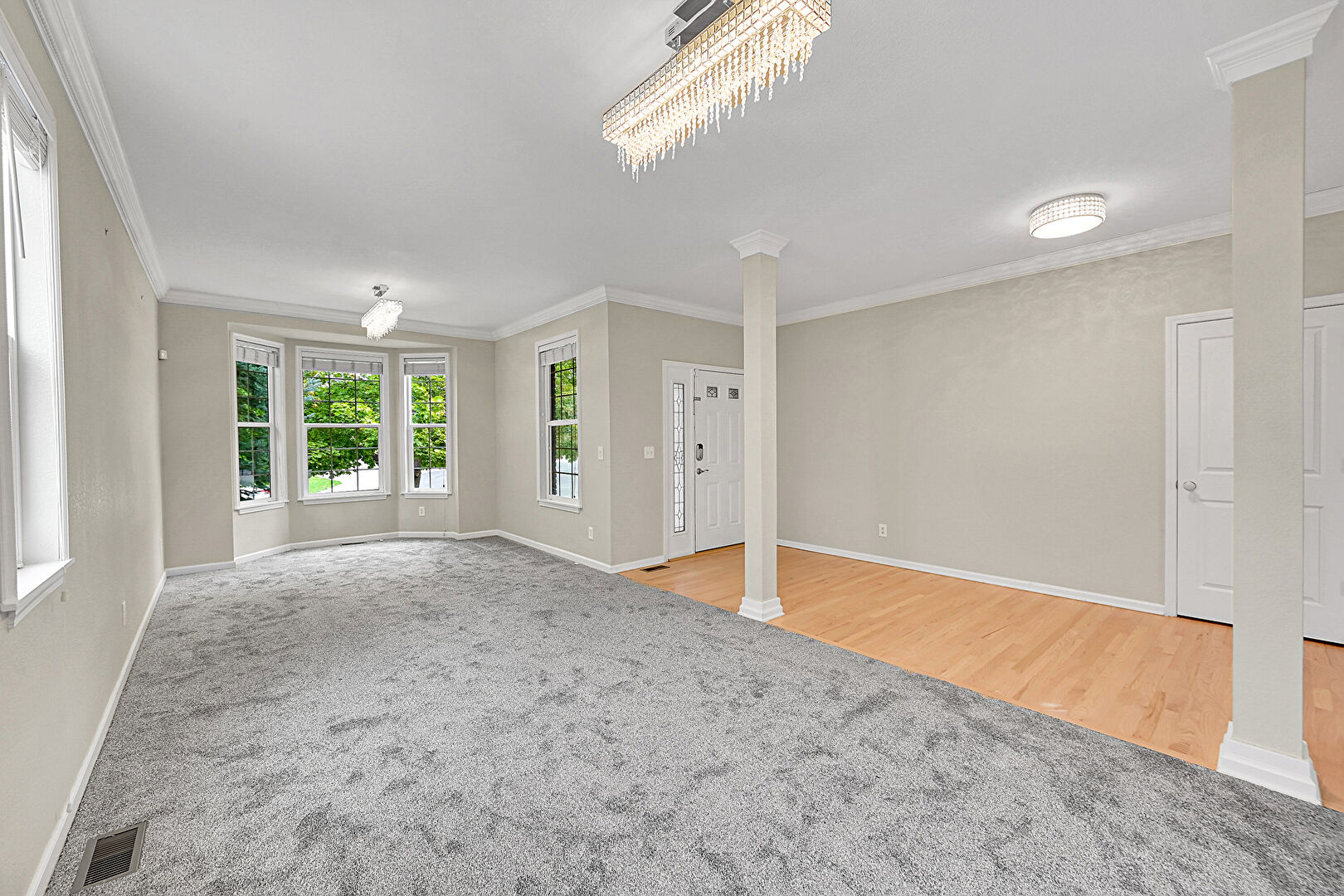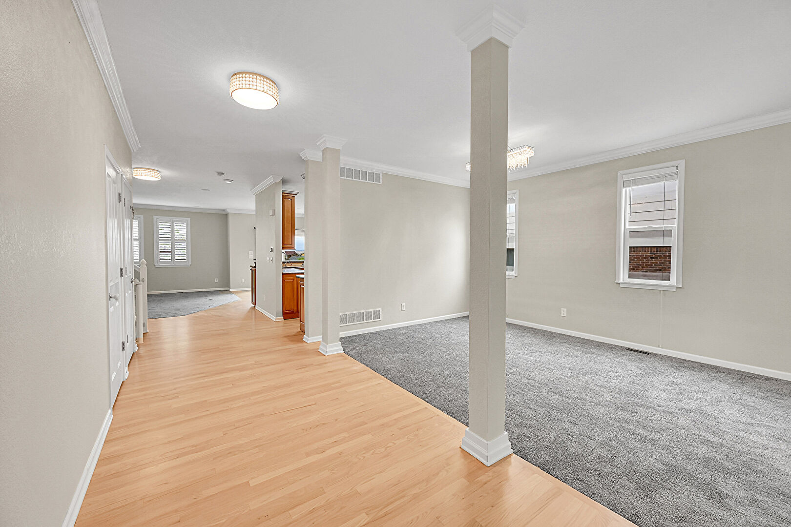 Baseboards Wall, Basement, Carpet, Crown Molding, Decorative Columns, Drywall, Fireplace, L Shaped Kitchen, Natural Light, Notable Chandelier, Recessed Lighting, Stairs, Vent, Wood Finish Floor, Baseboards Wall, Carpet, Crown Molding, Drywall, Wood Finish Floor