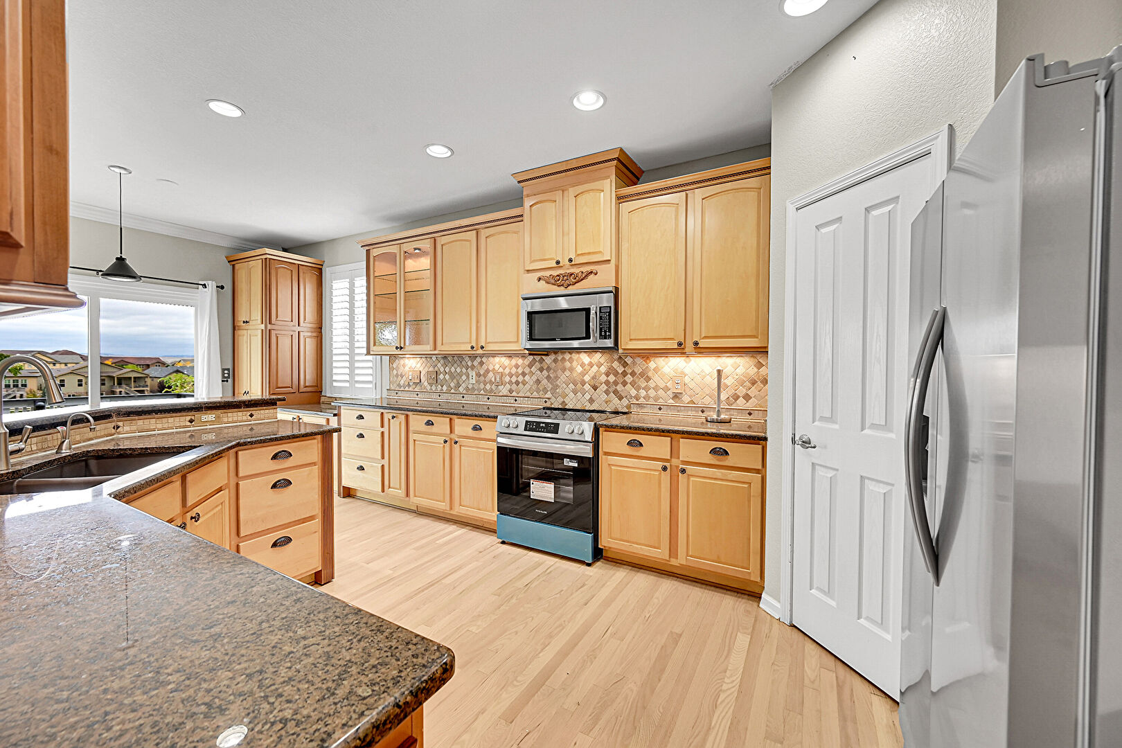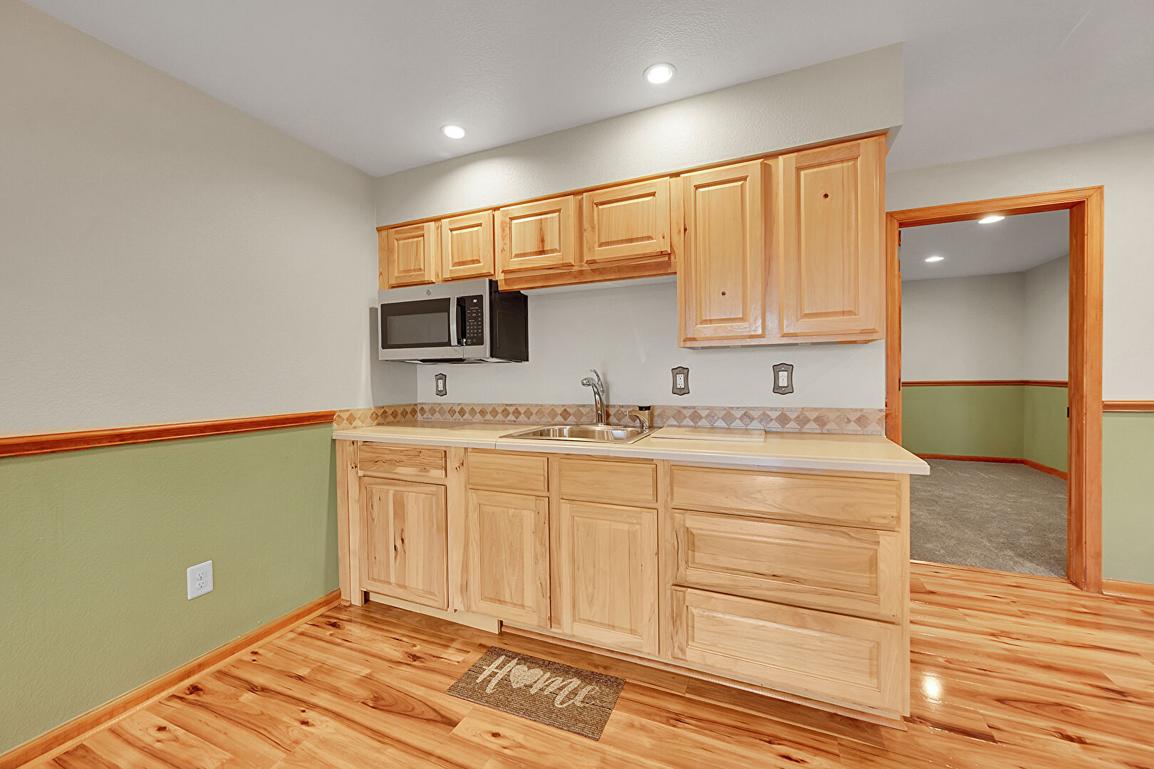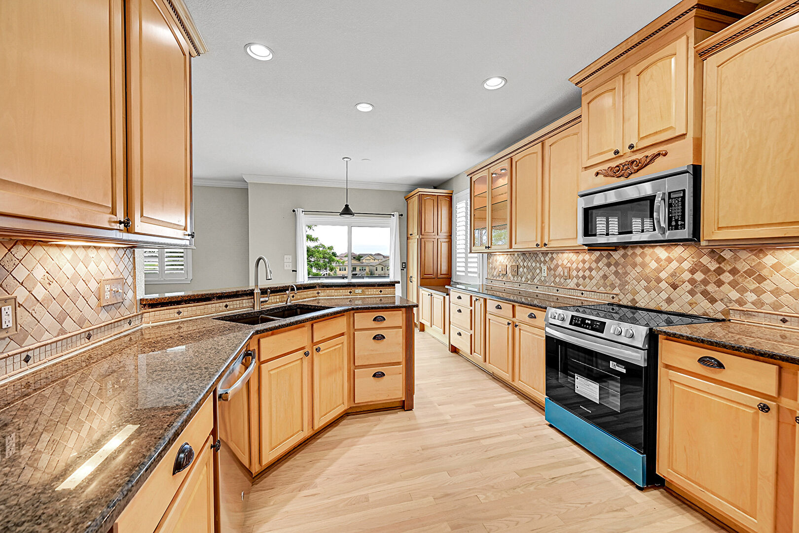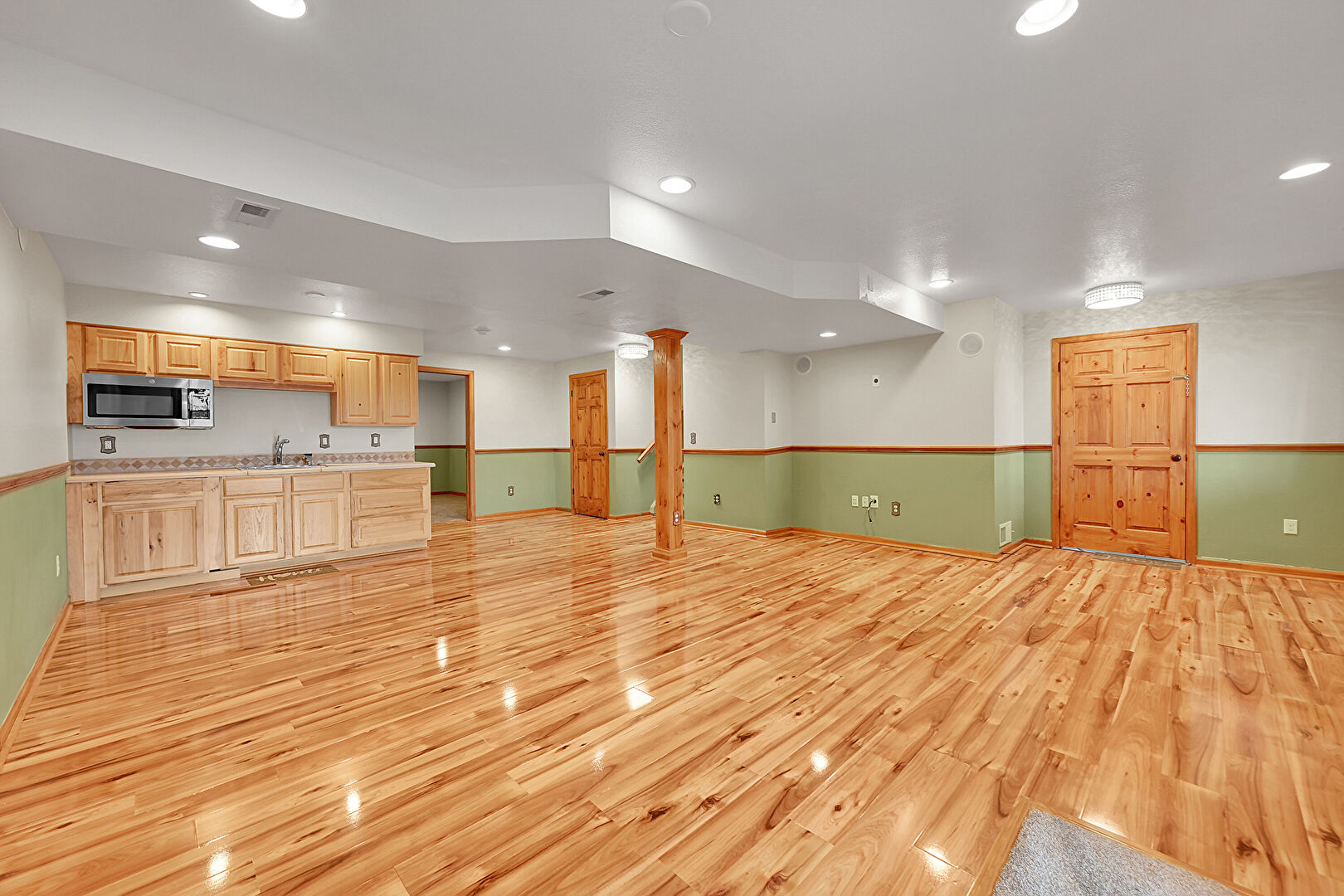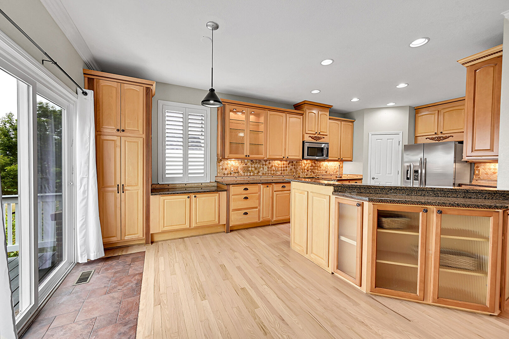 Arched Cabinets, Baseboards Wall, Basement, Crown Molding, Crown Molding Cabinets, Drywall, Glass Insert Cabinets, Kitchen Peninsula, Natural Light, Opens To Living Area, Pendant Lighting, Raised Cabinets, Recessed Lighting, Stone Countertops, Vent, Wood Finish Floor, Drywall, Raised Cabinets, Recessed Lighting, Wood Finish Floor