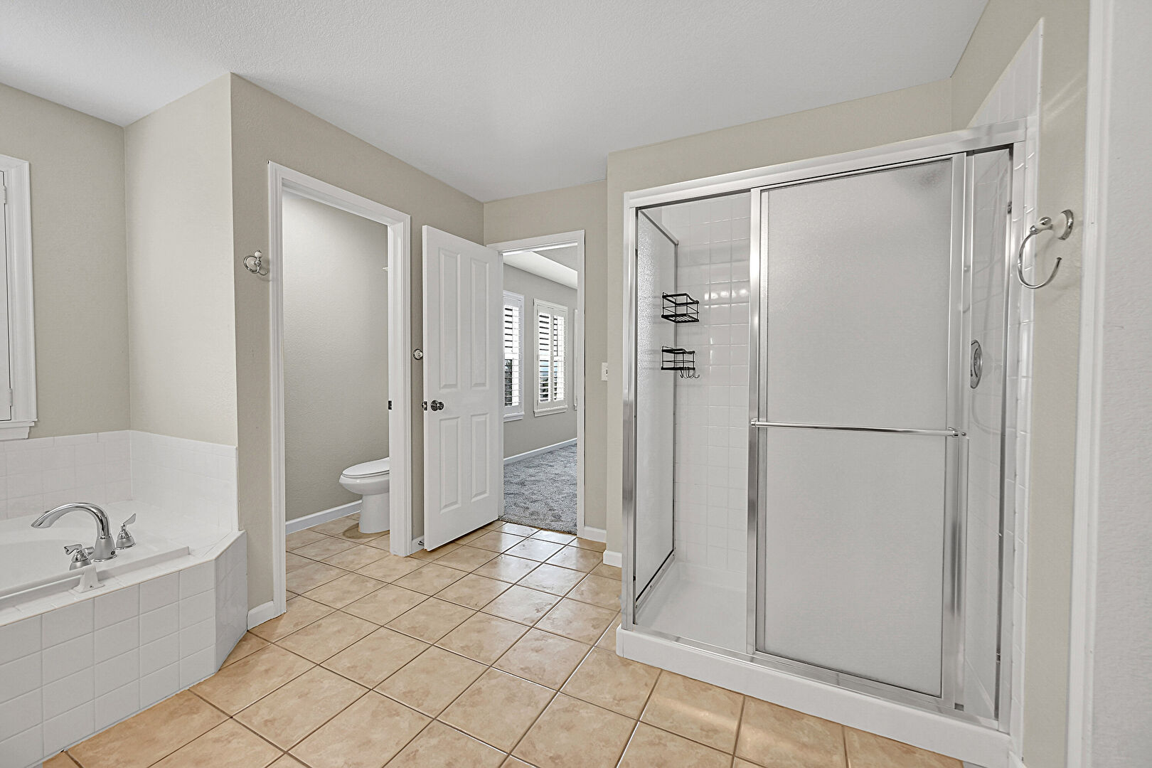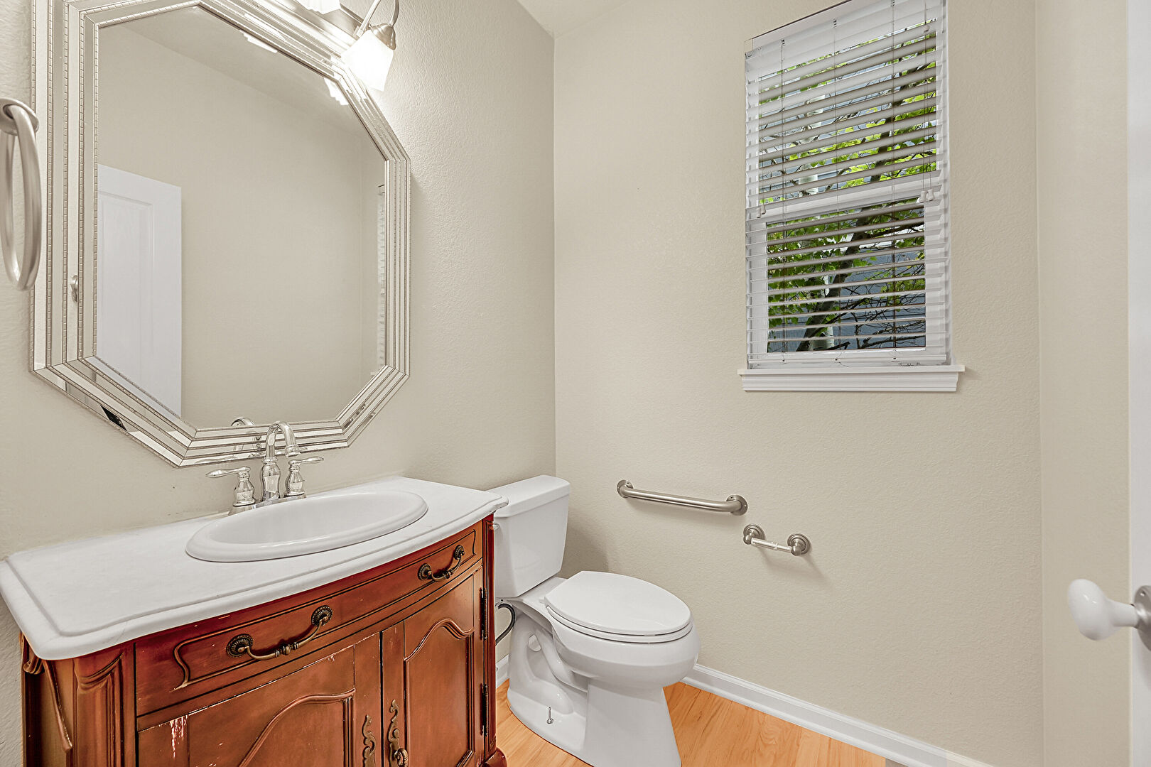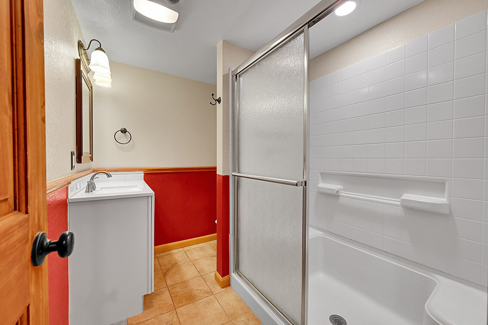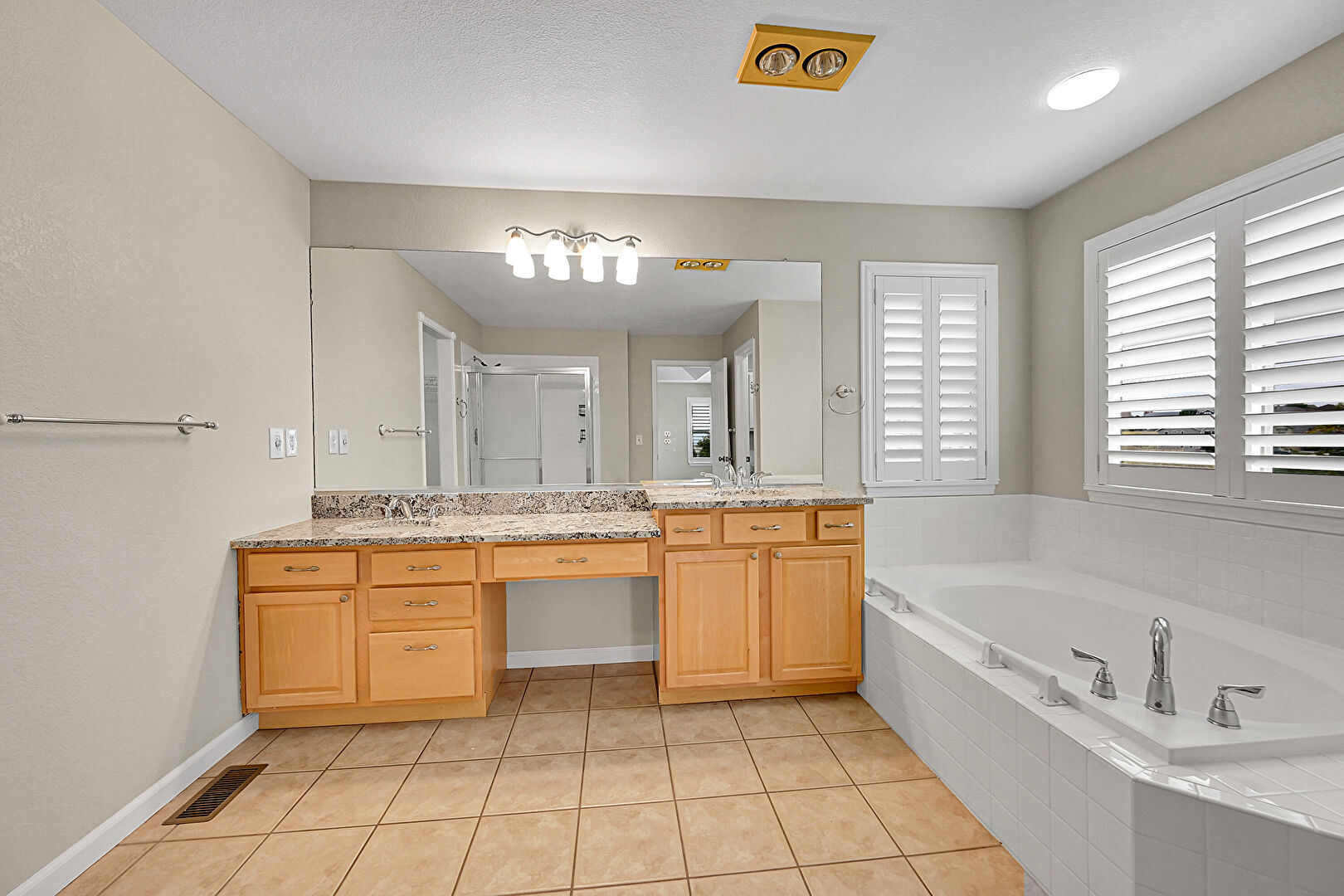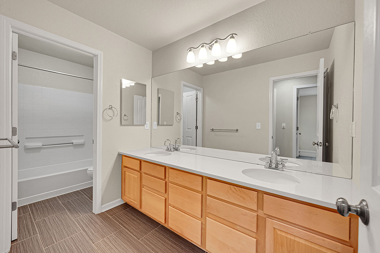 Baseboards Wall, Double Vanity, Drywall, Full Bathroom, Half Bathroom, Natural Light, Recessed Lighting, Tile Floor, Vanity, Vent, Water Closet, Baseboards Wall, Combined Bath Shower, Natural Light, Tile Floor, Wood Finish Floor