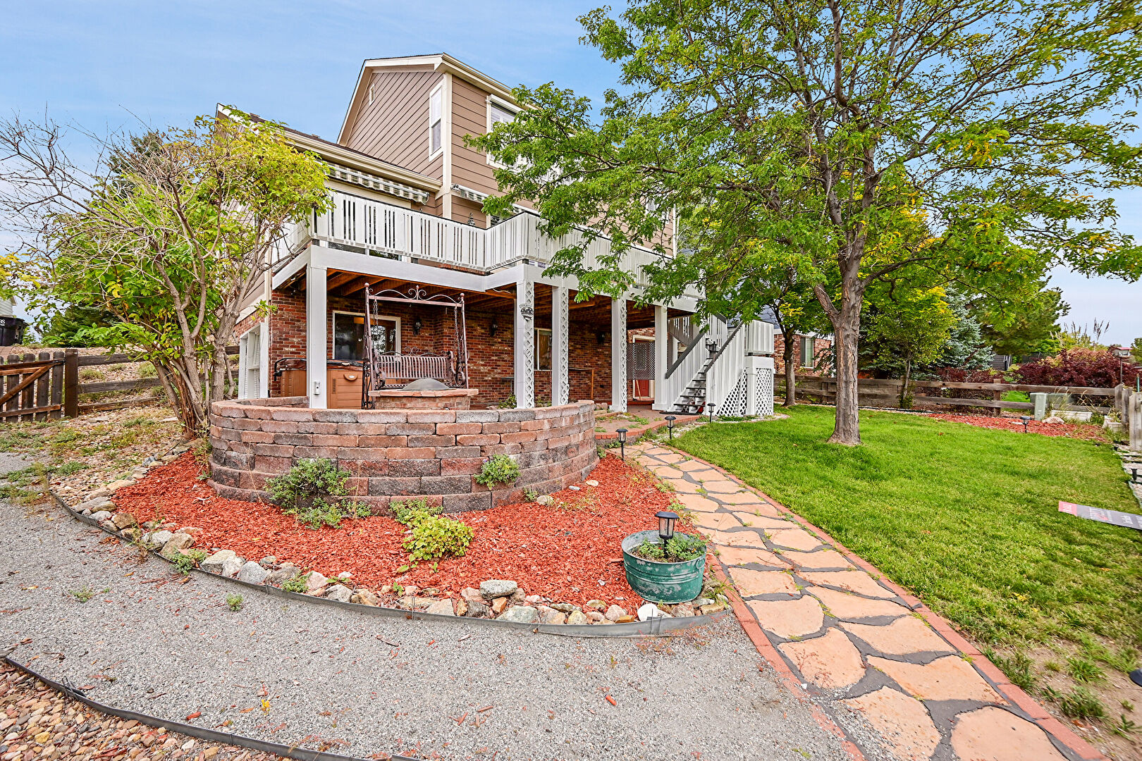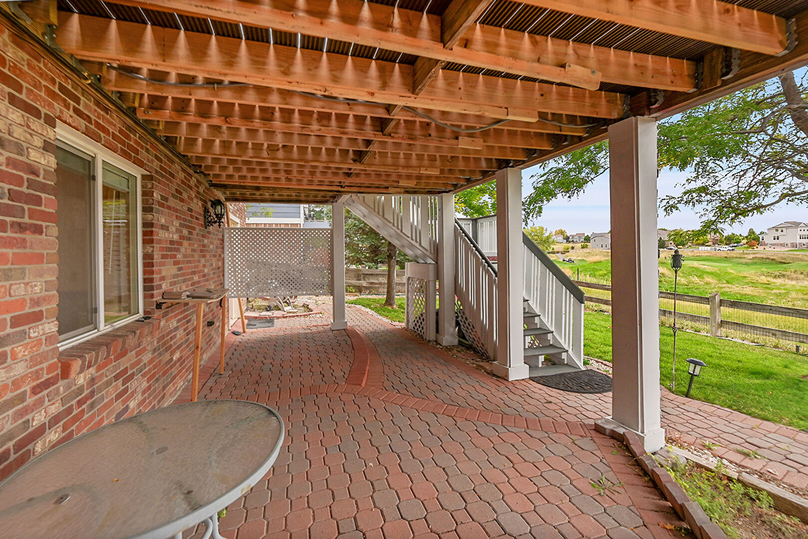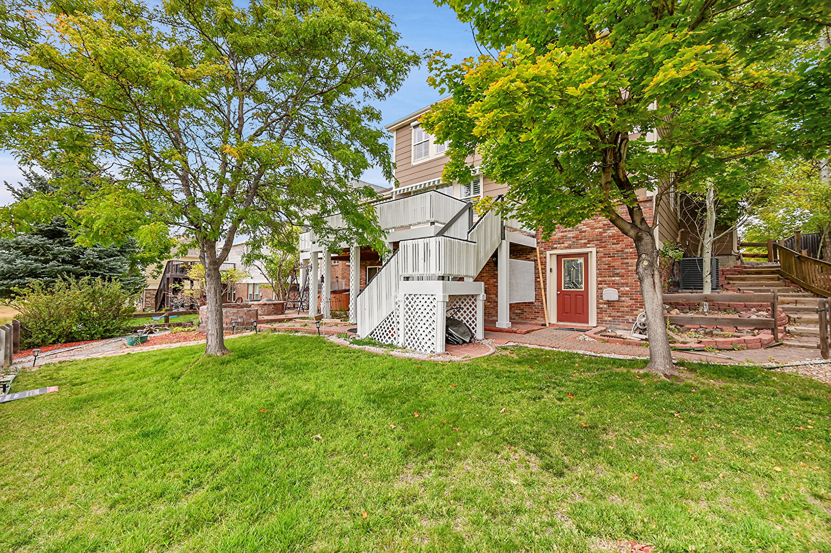 Basement Walk Out, Brick Siding, Deck, Fence, Lawn, Patio, Stairs, Horizontal Siding