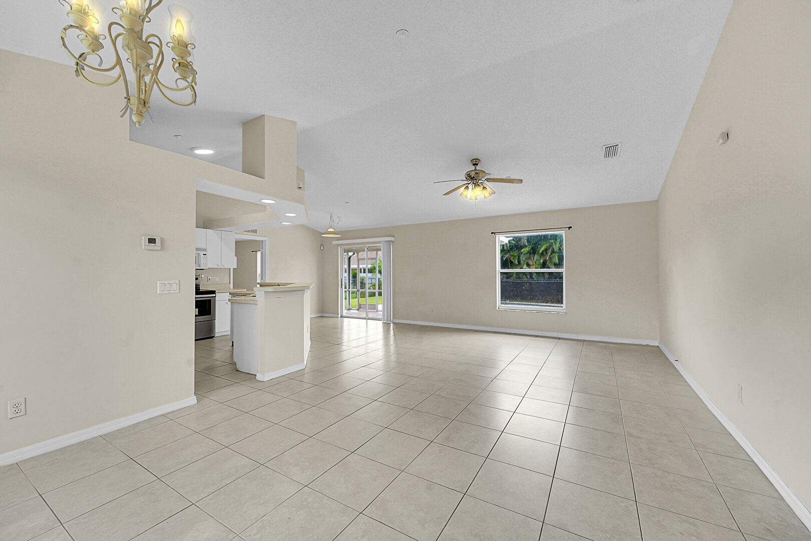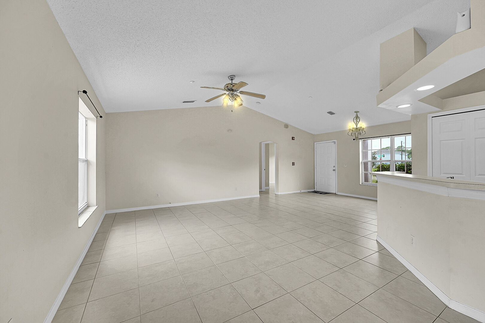 Baseboards Wall, Ceiling Fan, Drywall, L Shaped Kitchen, Natural Light, Notable Chandelier, Recessed Lighting, Textured Ceiling, Tile Floor, Vaulted Ceiling, Vent, High Ceiling, Natural Light, Tile Floor