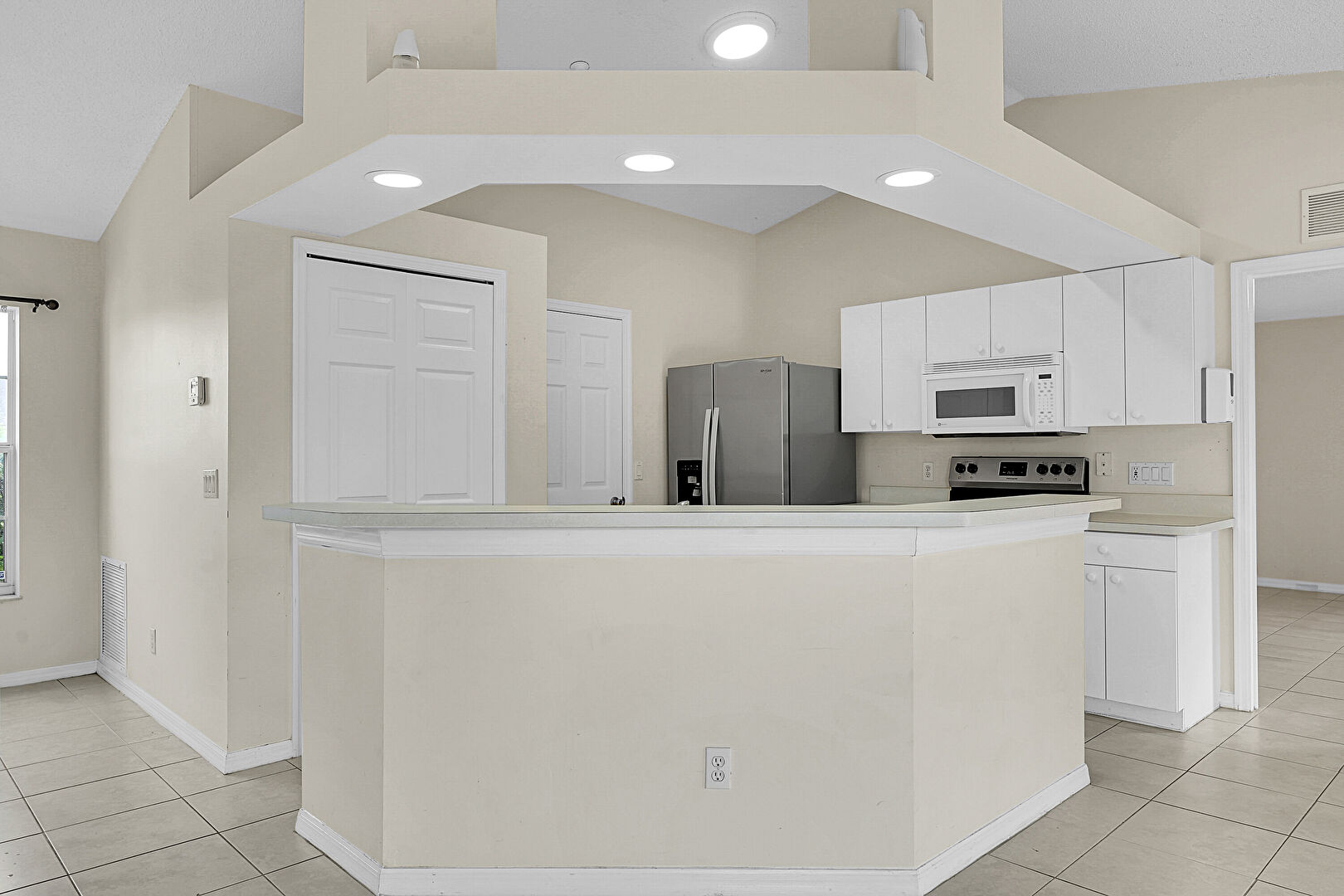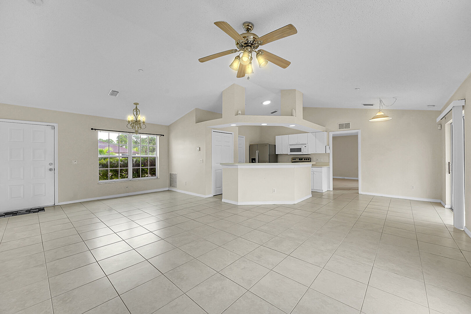 Baseboards Wall, Ceiling Fan, Drywall, Kitchen Island, Natural Light, Pendant Lighting, Recessed Lighting, Textured Ceiling, Tile Floor, Vaulted Ceiling, Vent, Drywall, Natural Light, Tile Floor