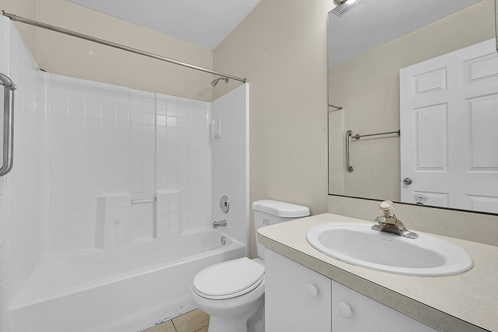 Combined Bath Shower, Drywall, Full Bathroom, Vanity, Vent, Tile Floor