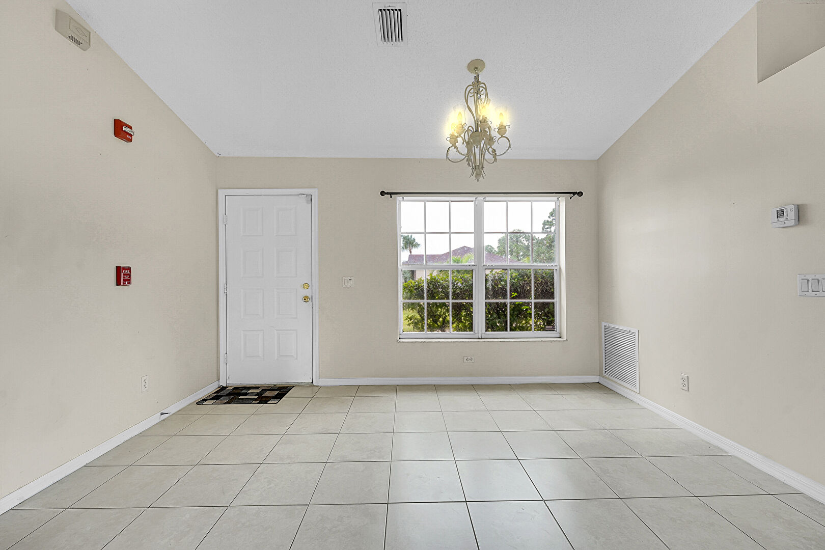 Baseboards Wall, Drywall, Notable Chandelier, Tile Floor, Vaulted Ceiling, Vent, Natural Light