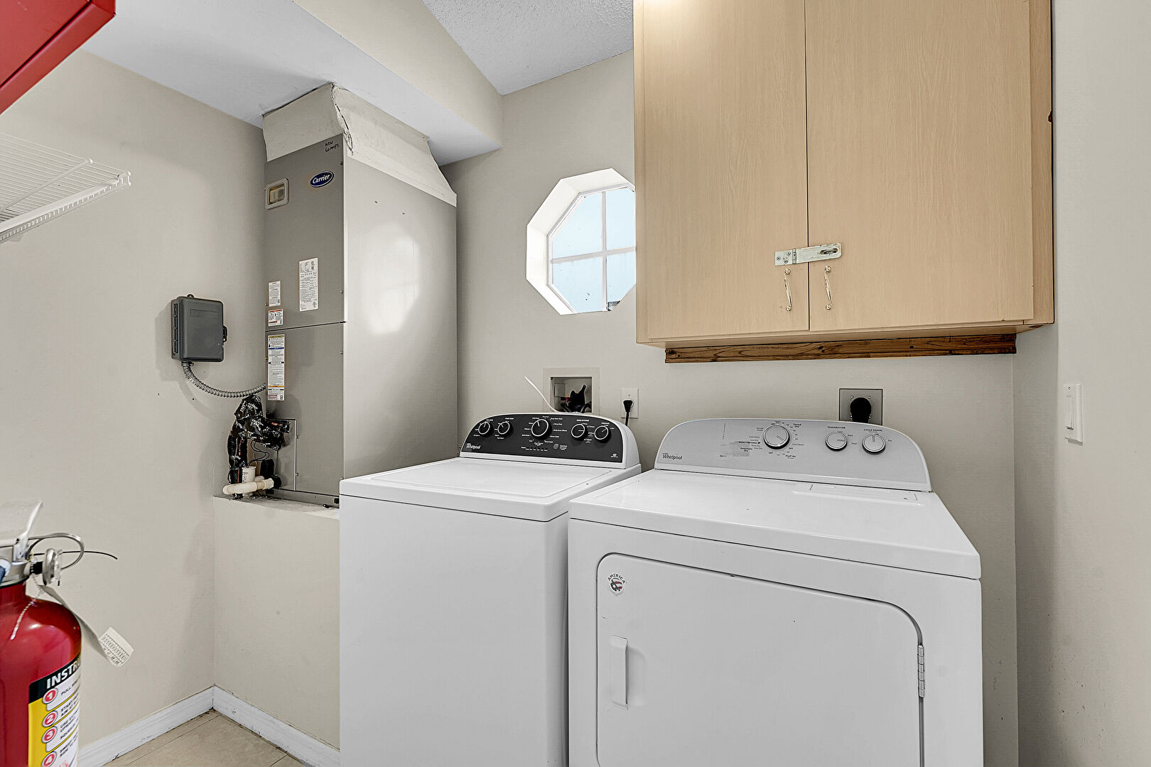 Drywall, Electric Dryer Hookup, Fire Extinguisher, Furnace, Laundry, Natural Light, Textured Ceiling, Tile Floor, Washer Hookup, Baseboards Wall