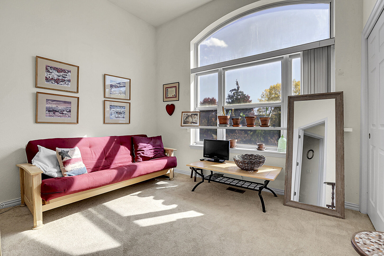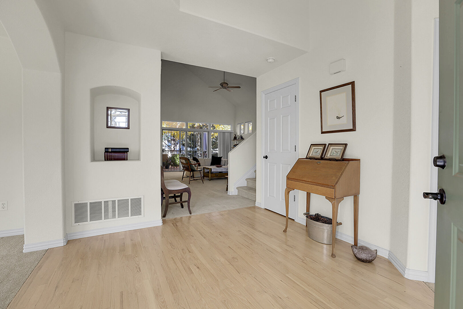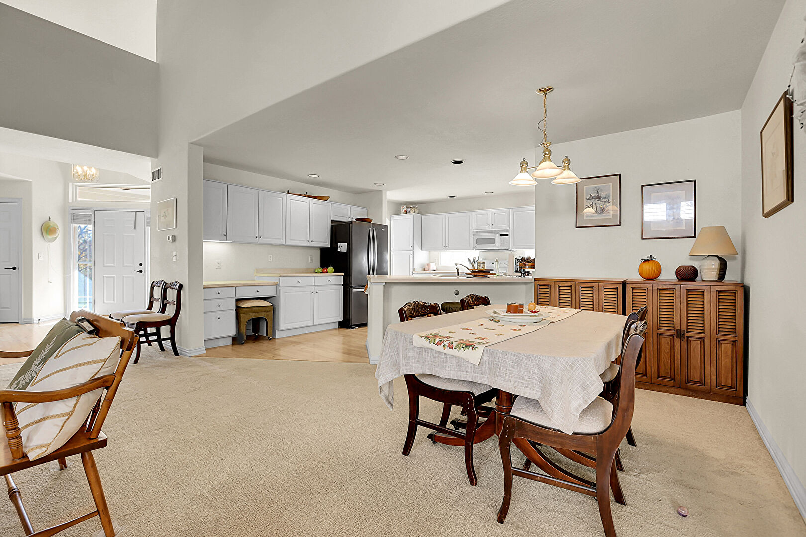 Arched Walkways, Baseboards Wall, Carpet, Drywall, High Ceiling, Natural Light, Vaulted Ceiling, Wood Finish Floor, Notable Chandelier
