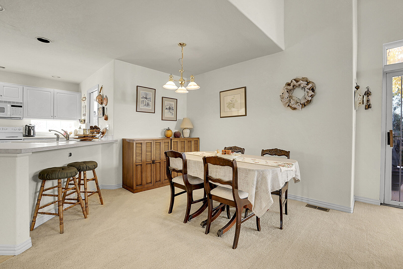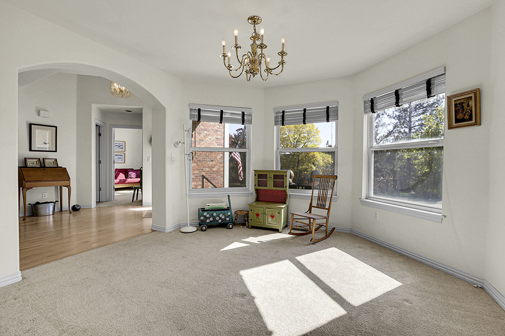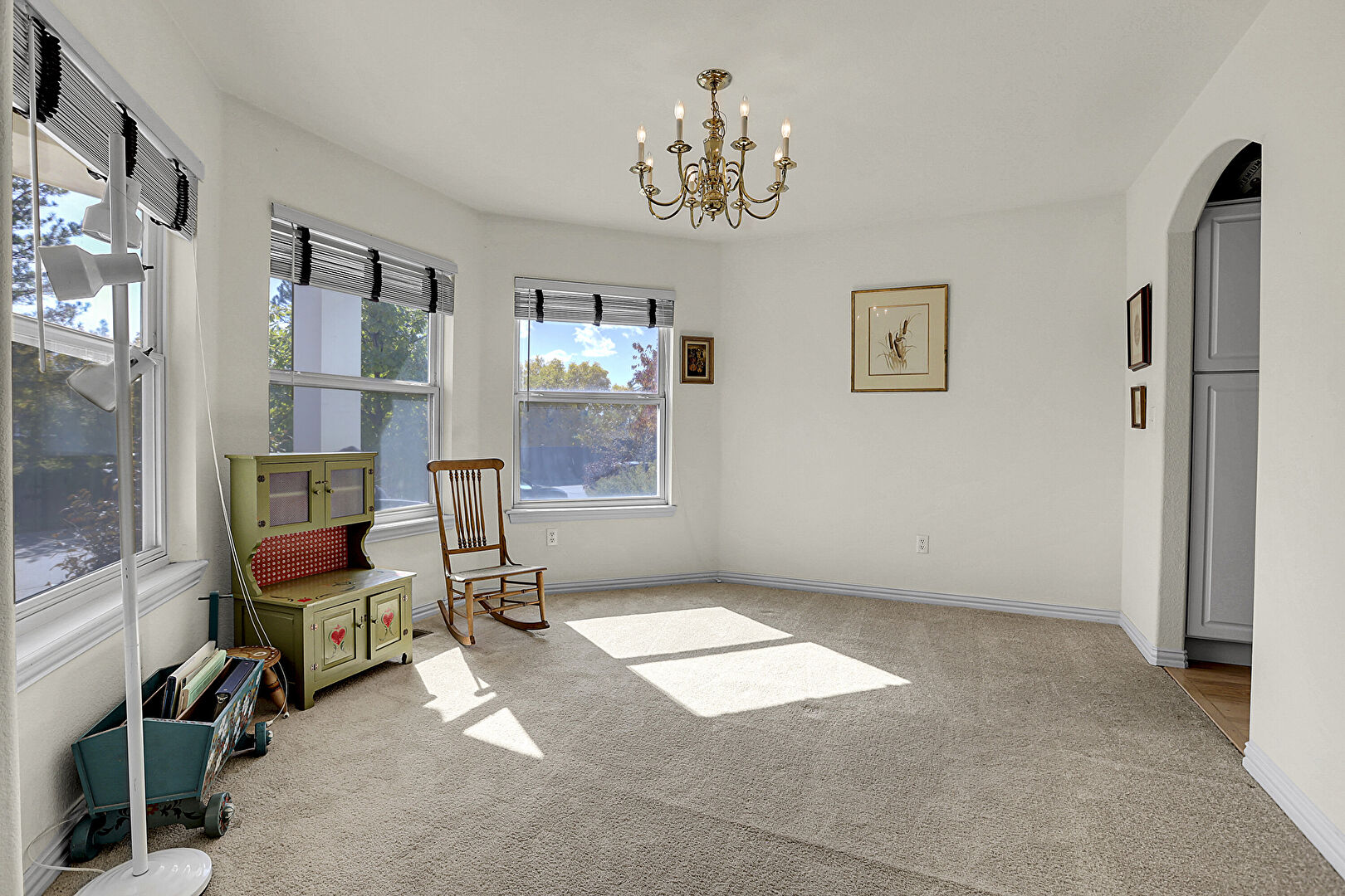 Arched Walkways, Baseboards Wall, Carpet, Drywall, Natural Light, Notable Chandelier, U Shaped Kitchen, Vent, Carpet, Natural Light, Notable Chandelier
