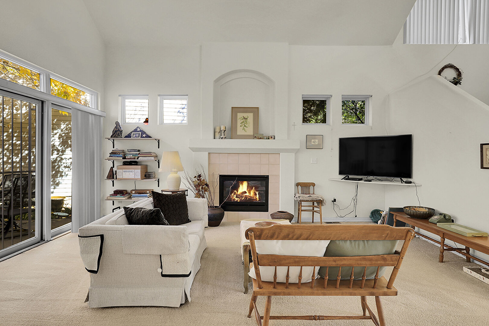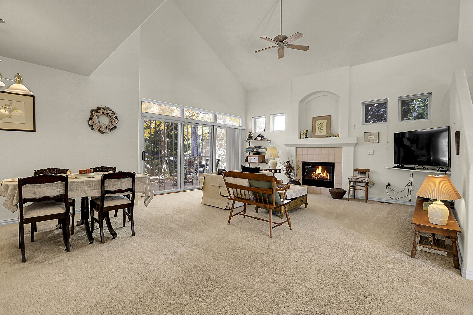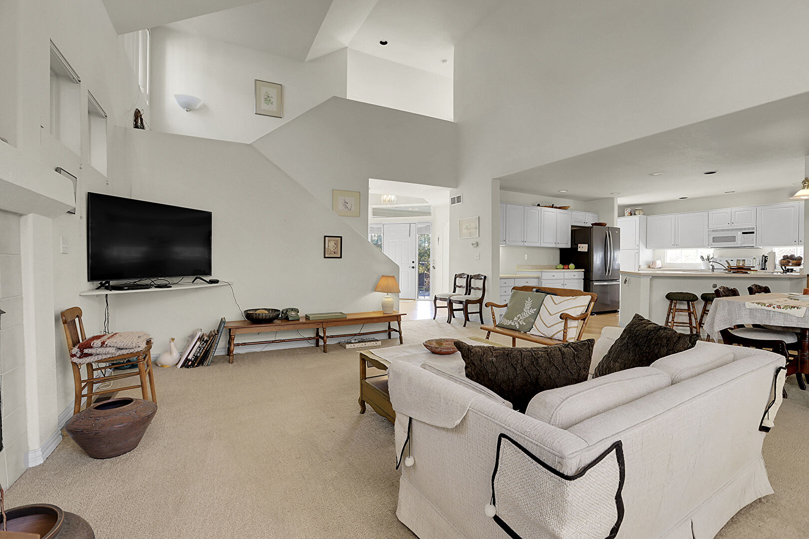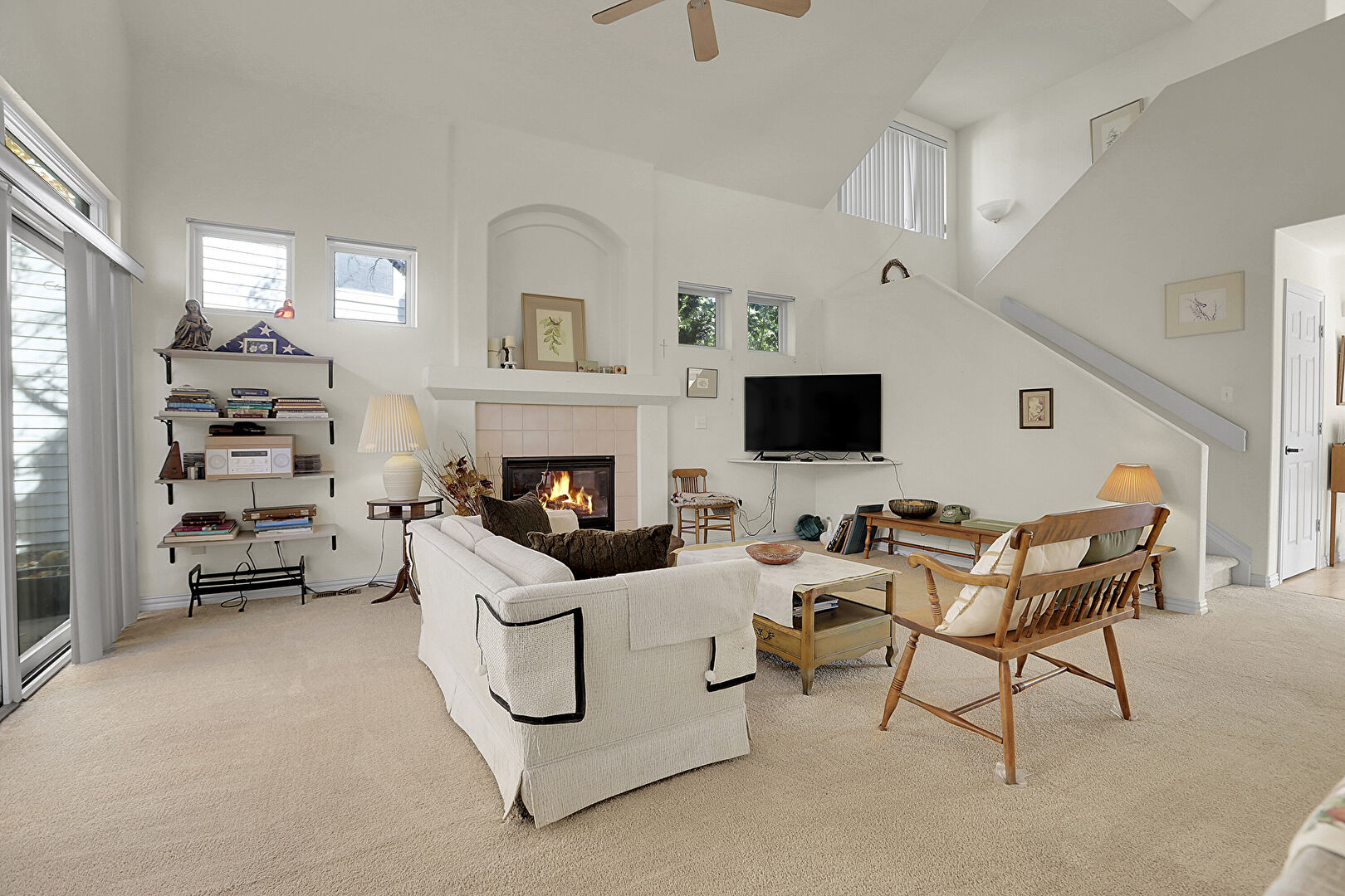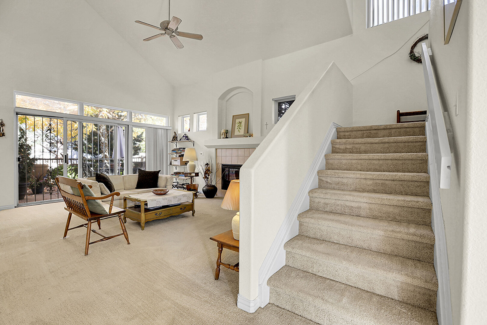 Baseboards Wall, Carpet, Ceiling Fan, Drywall, Fireplace, High Ceiling, Natural Light, Stairs, Vaulted Ceiling, Ceiling Fan, Drywall, Fireplace, High Ceiling, Natural Light