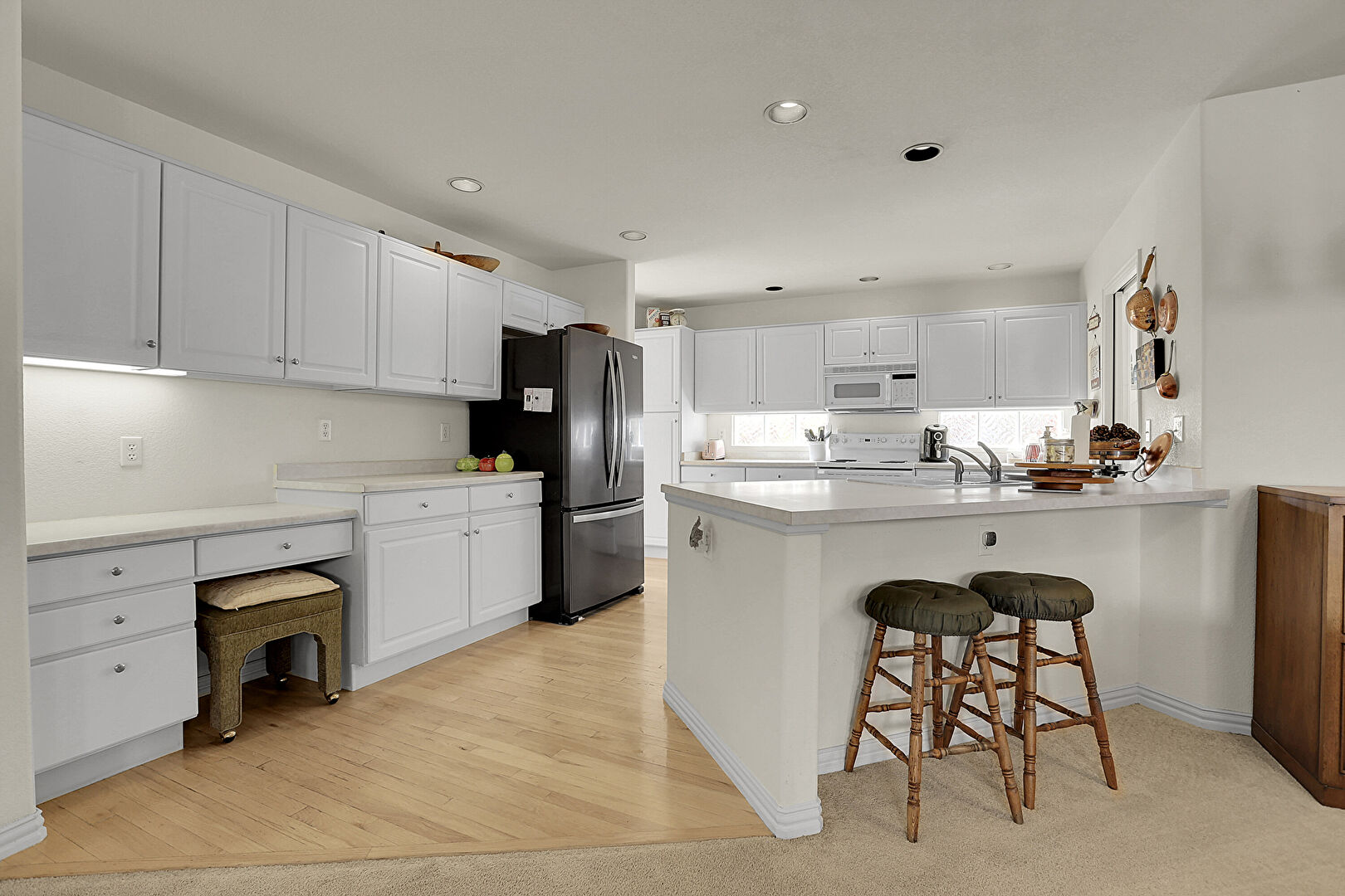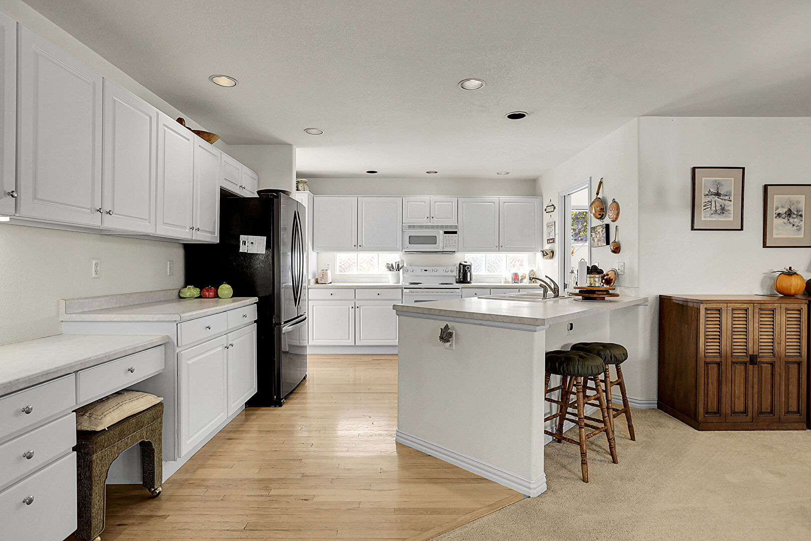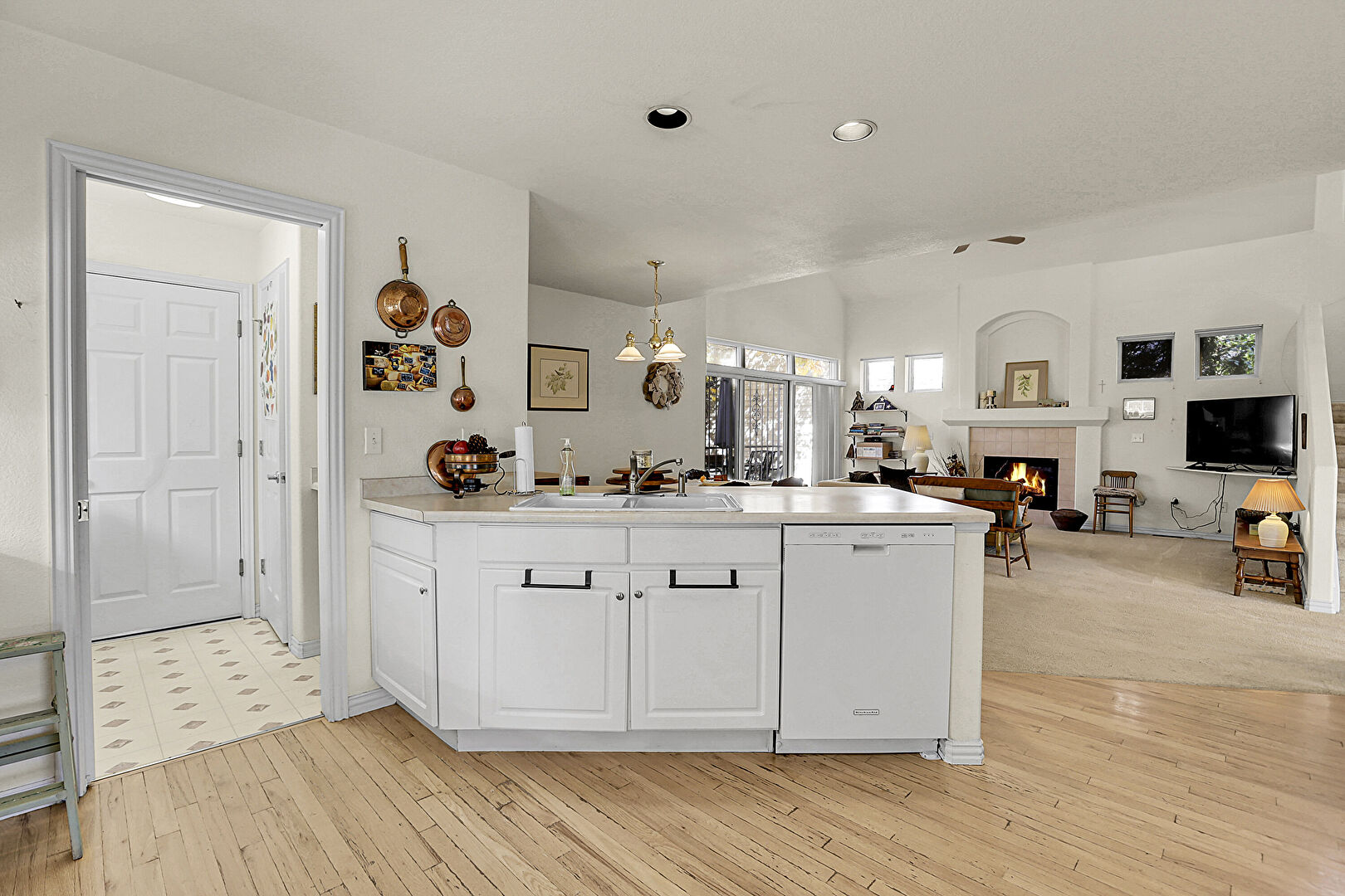 Arched Walkways, Baseboards Wall, Built In Desk, Drywall, Fireplace, Kitchen Bar, Kitchen Island, Kitchen Peninsula, Laundry, Natural Light, Opens To Living Area, Pendant Lighting, Raised Cabinets, Recessed Lighting, Wood Finish Floor, Gray Cabinets, Kitchen Peninsula, Natural Light, Office Area, Wood Finish Floor