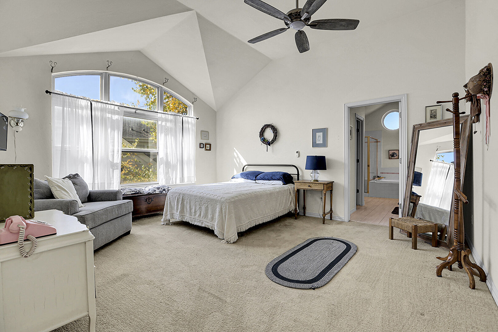 Baseboards Wall, Carpet, Ceiling Fan, Drywall, Ensuite Bathroom, High Ceiling, Natural Light, Vaulted Ceiling, Vent, Cathedral Ceiling, Drywall, High Ceiling