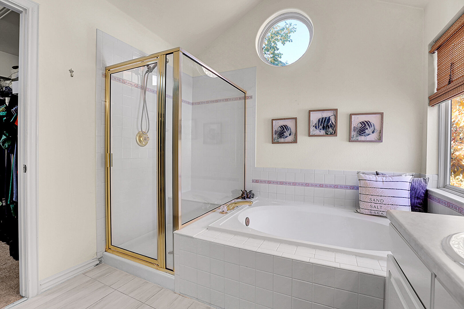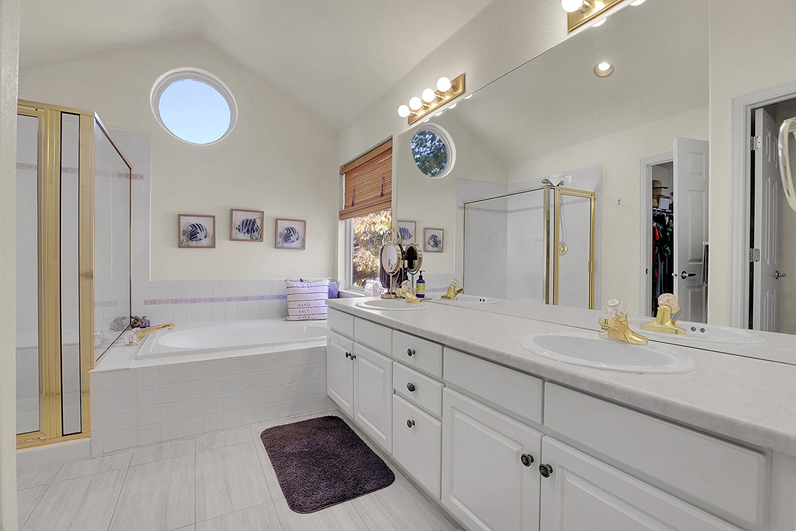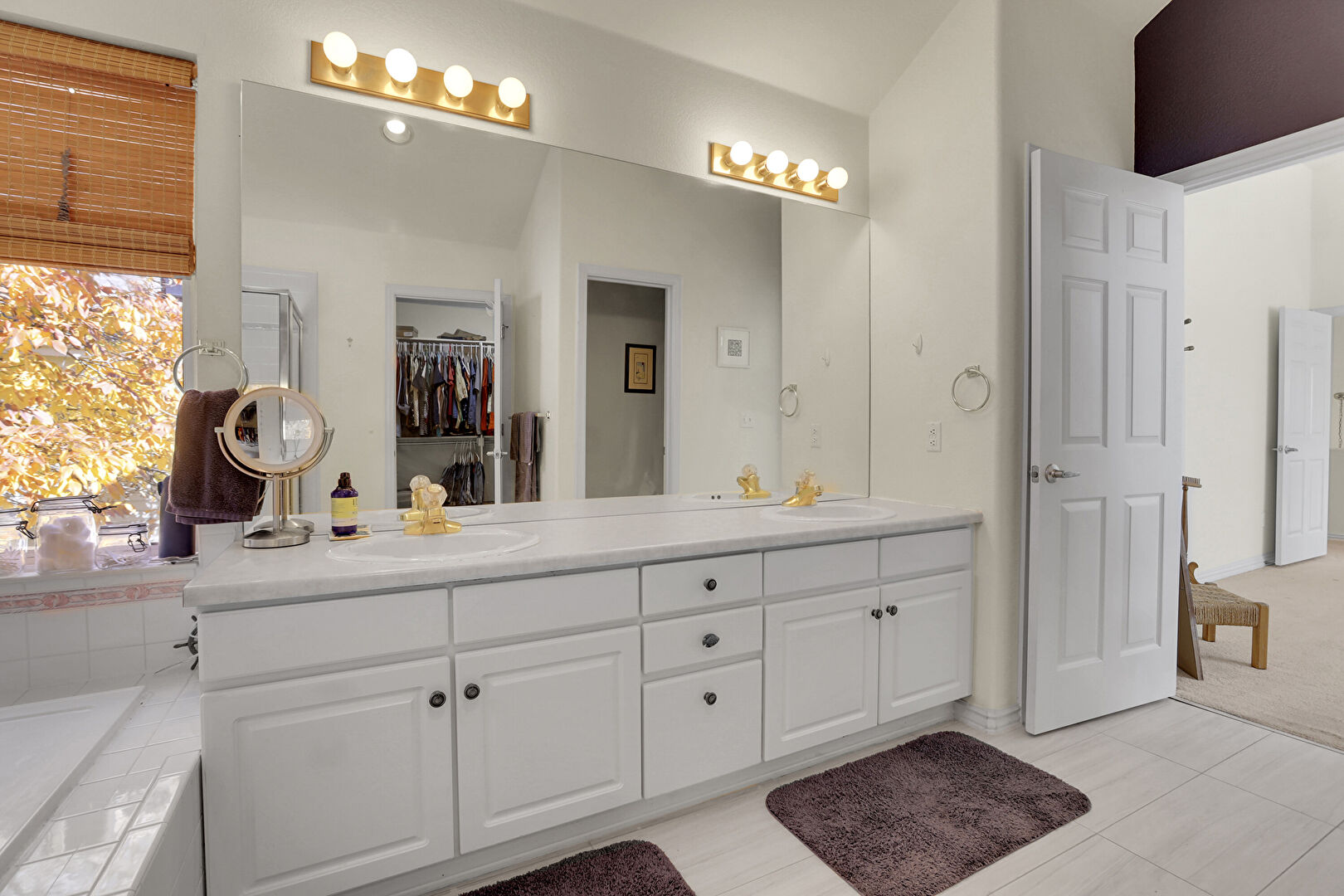 Baseboards Wall, Double Vanity, Drywall, Full Bathroom, Half Bathroom, Natural Light, Recessed Lighting, Tile Floor, Vanity, Vaulted Ceiling, Vent, Walk In Closet, Carpet, Drywall, Full Bathroom, Tile Floor, Vaulted Ceiling