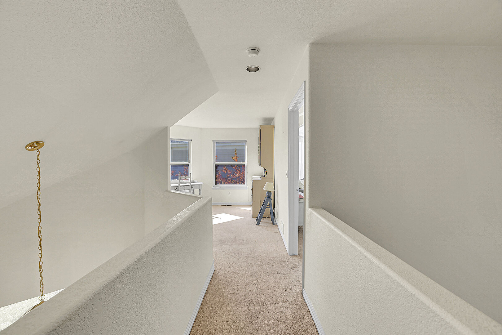 Baseboards Wall, Carpet, Drywall, High Ceiling, Natural Light, Stairs, Textured Ceiling, Upstairs Landing, Vaulted Ceiling, Vent, Wood Finish Floor, Drywall, Smoke Carbon Monoxide Detector