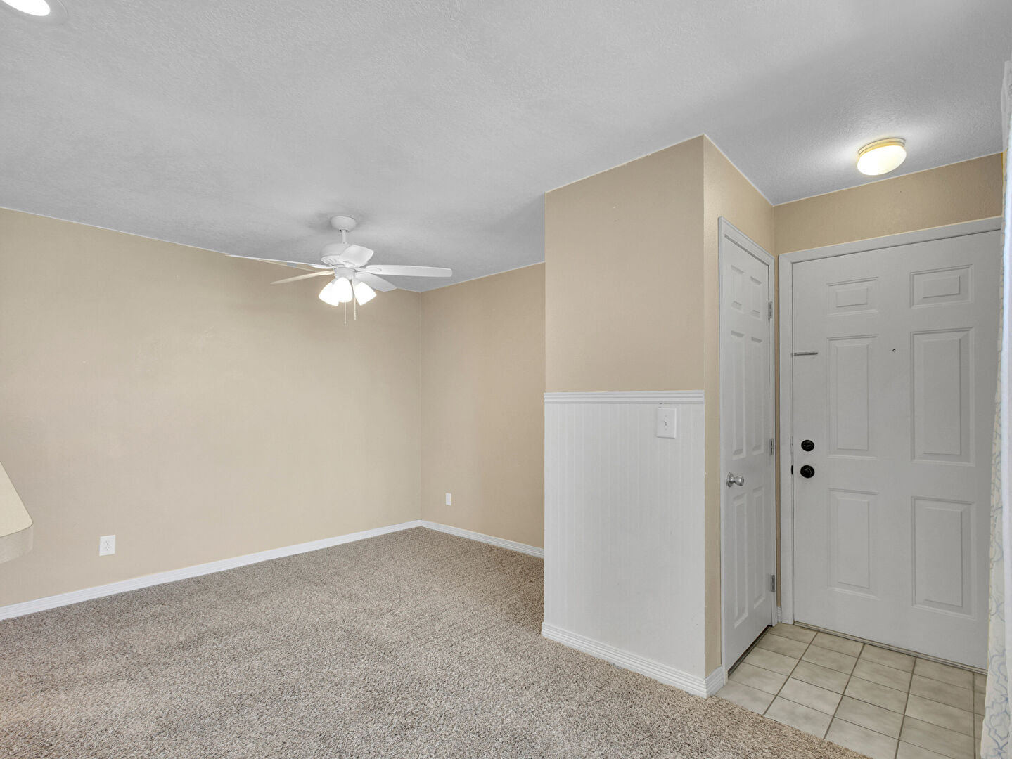 Baseboards Wall, Carpet, Ceiling Fan, Drywall, Wainscot Wall, Tile Floor